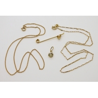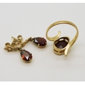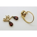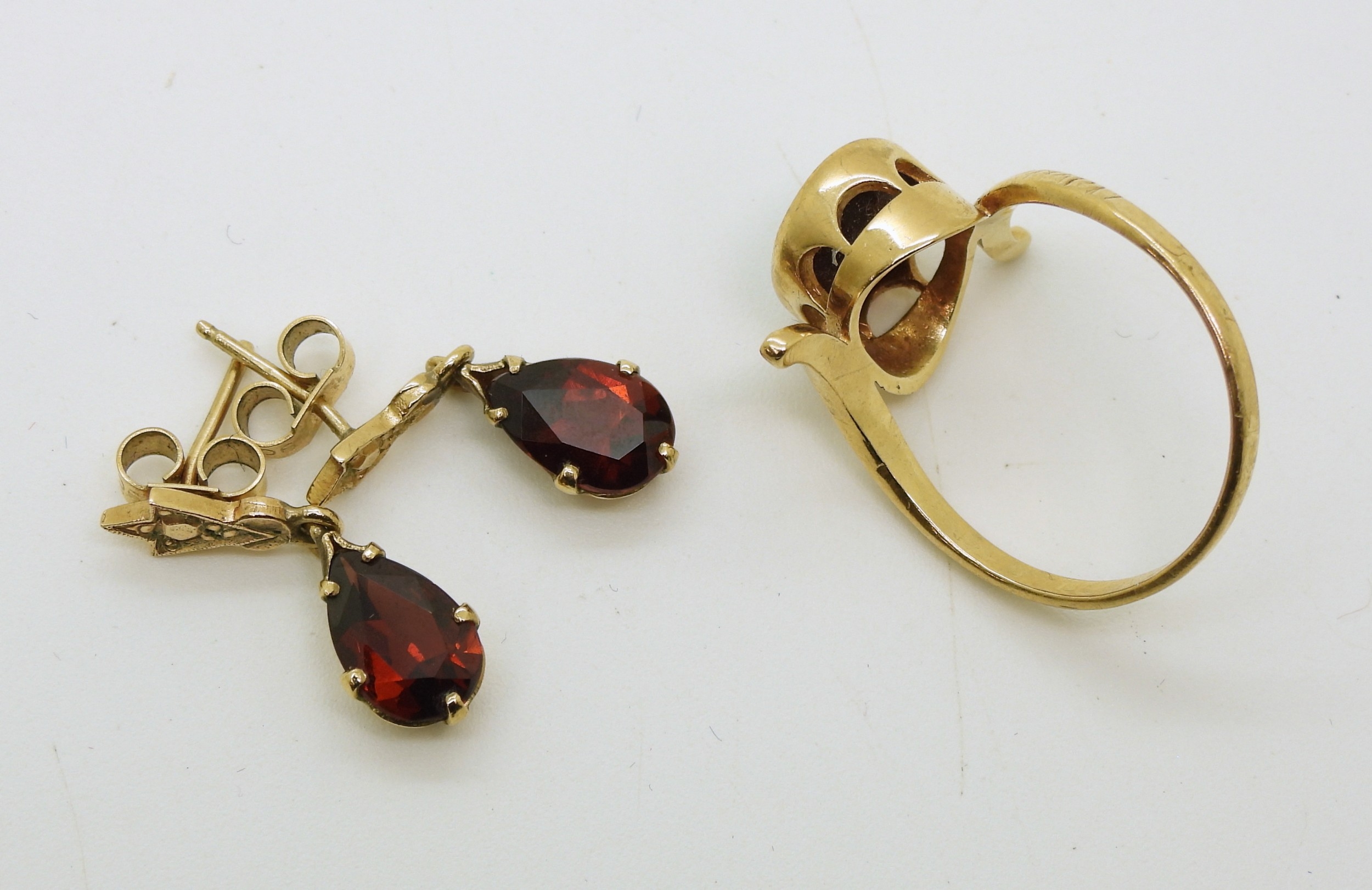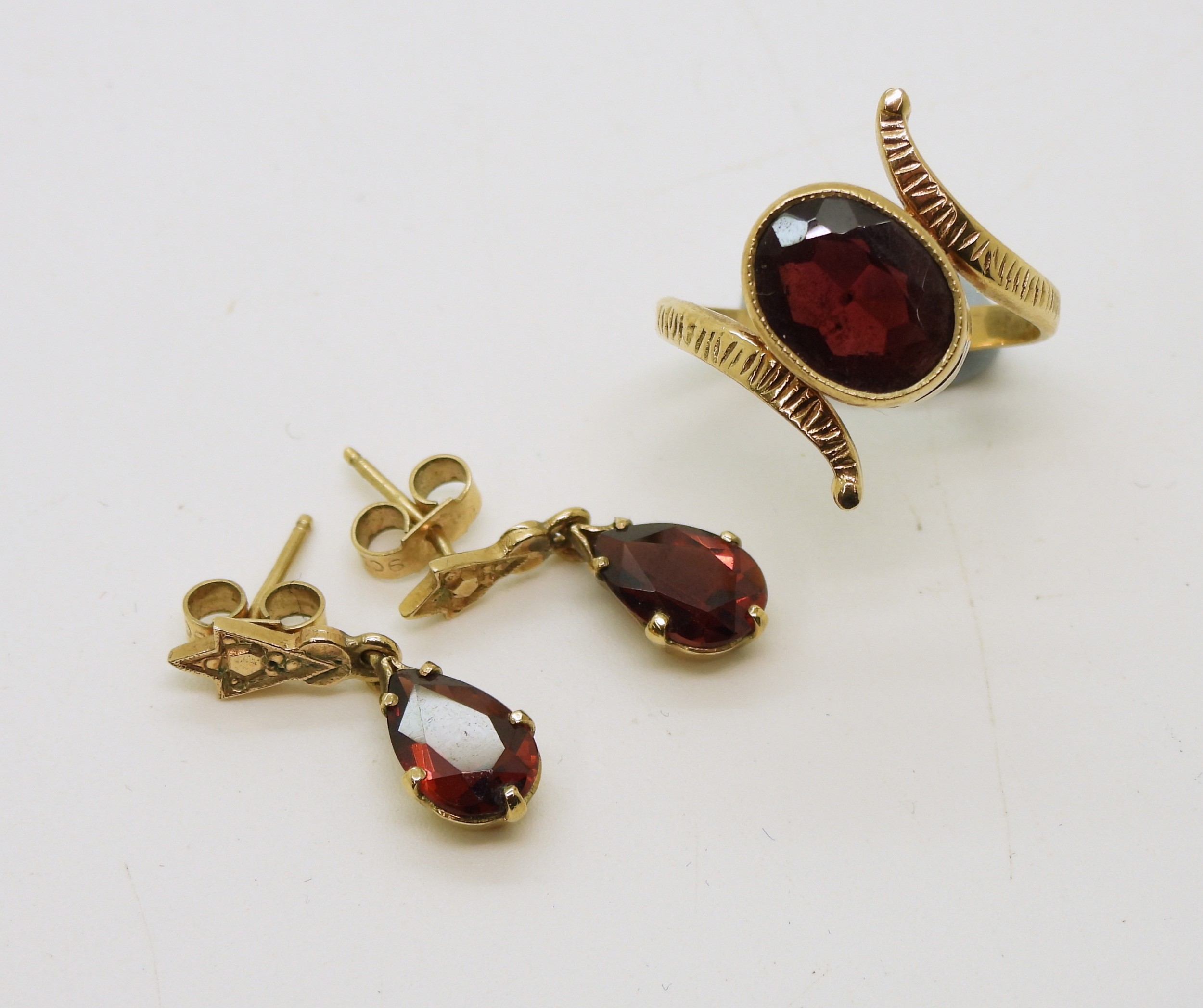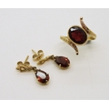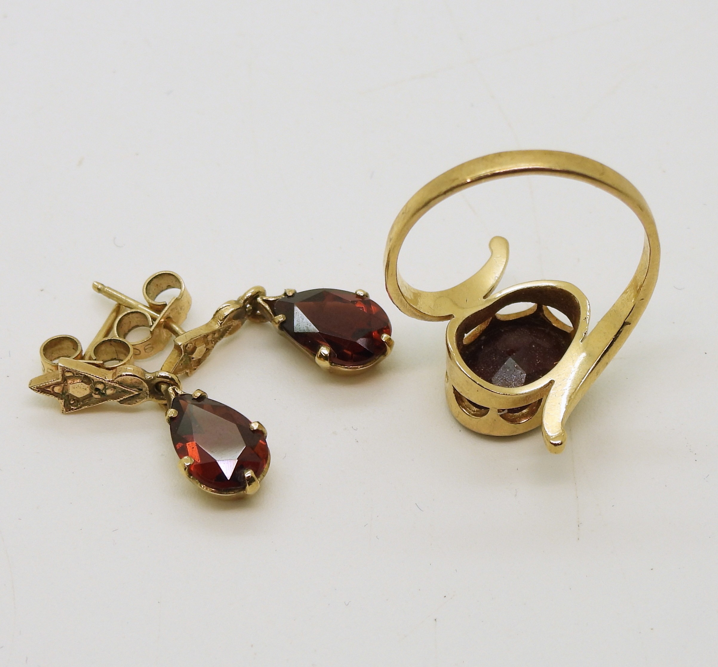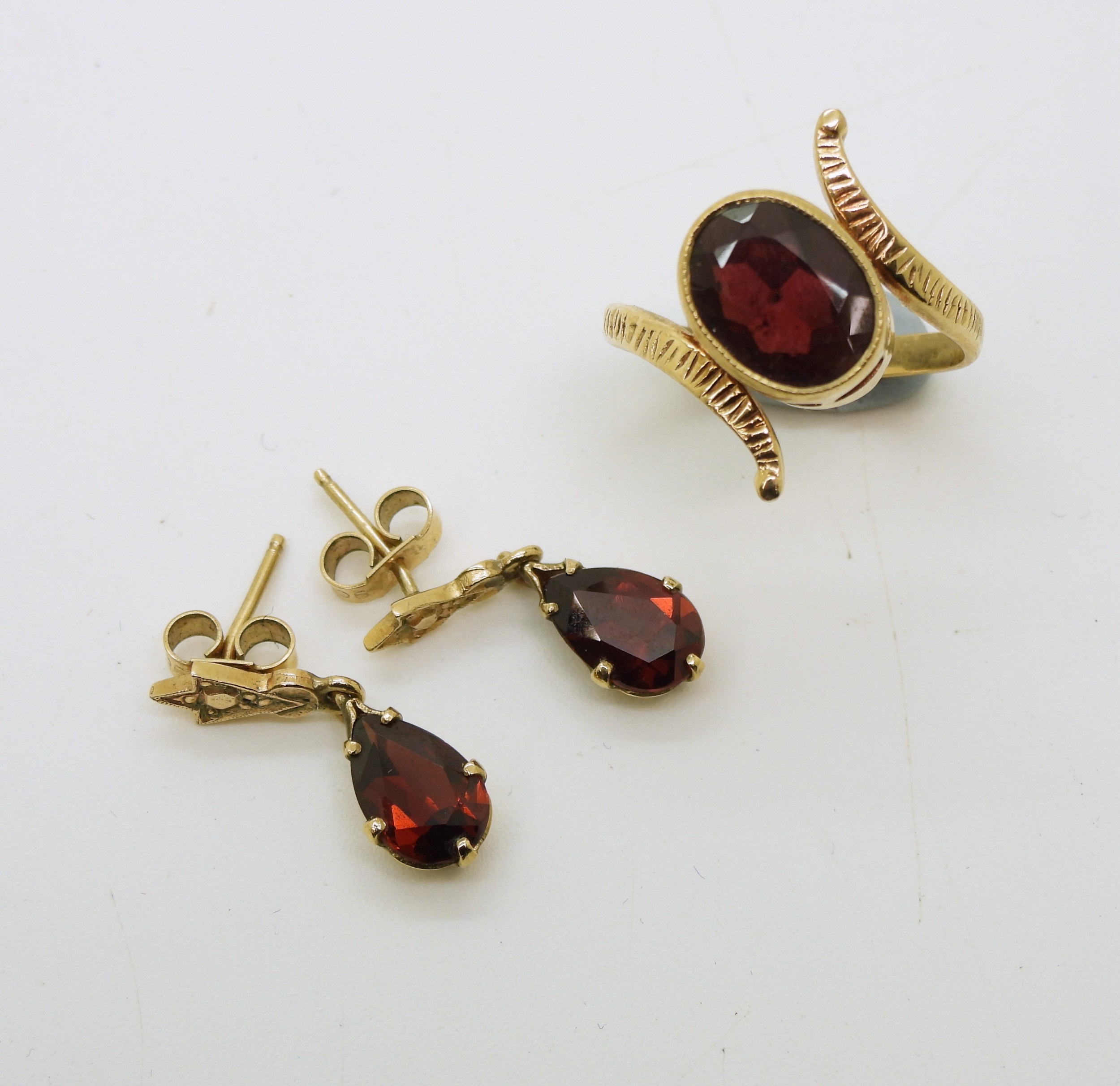 A yellow metal garnet ring, size O, together with a pair of garnet drop earrings, length 2cm, weight all together 5.2gms