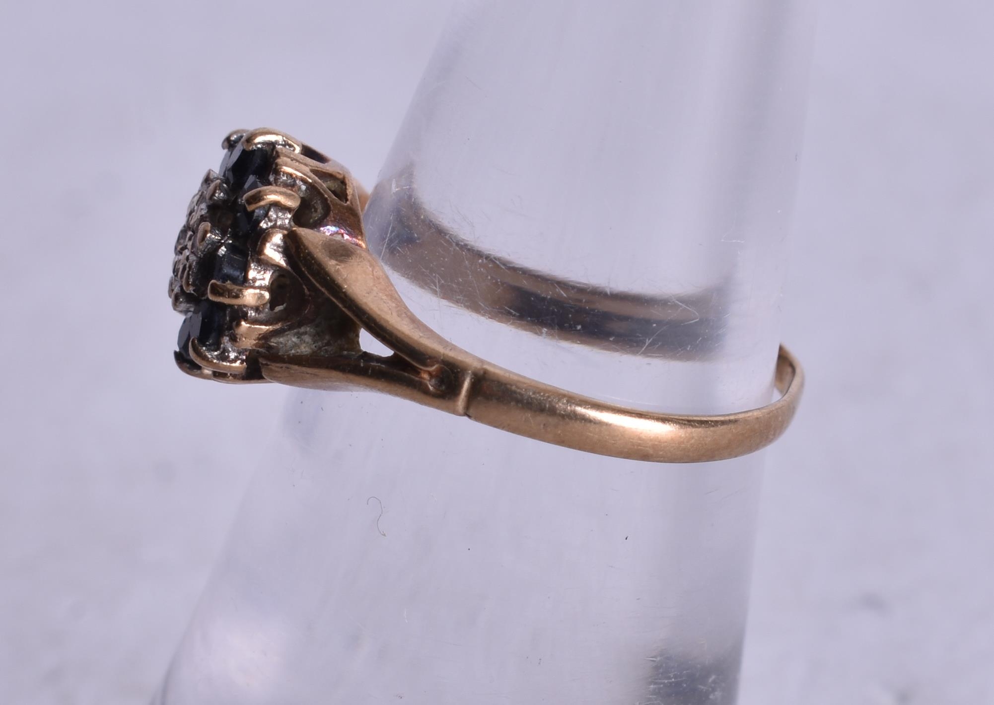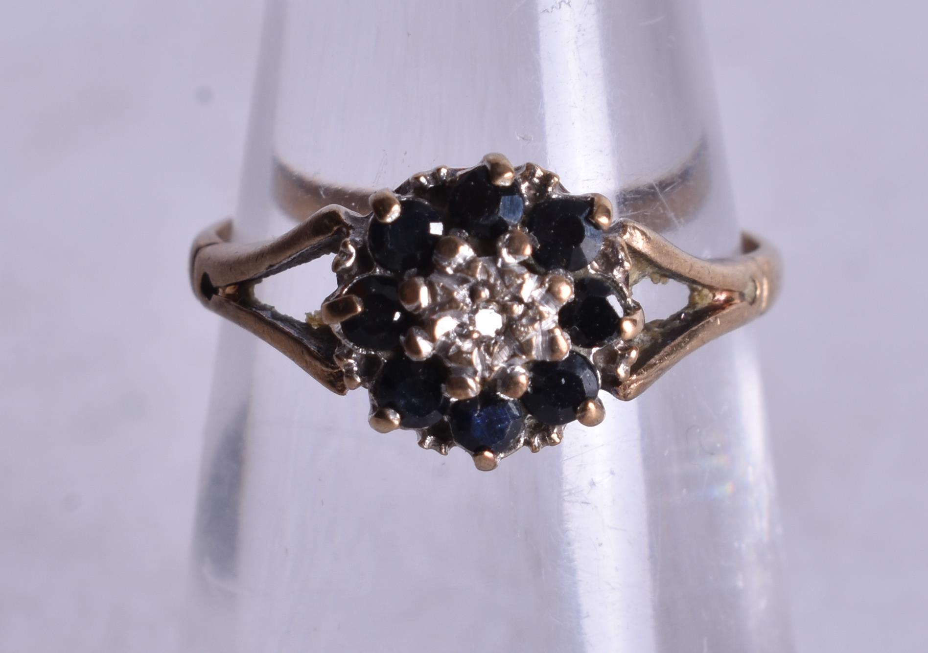 9ct gold sapphire diamond cluster ring (1.6g). I.
