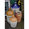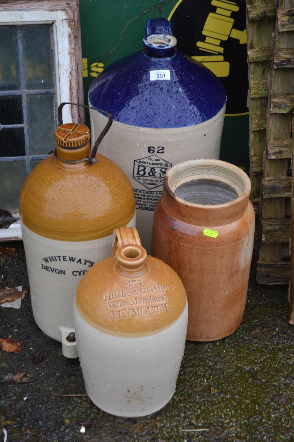 3 stoneware flagons & stoneware jar. 2 marked Plymouth, 1 marked Devon cider. Heights respectively are 49cm, 45cm, 33cm, 31cm