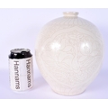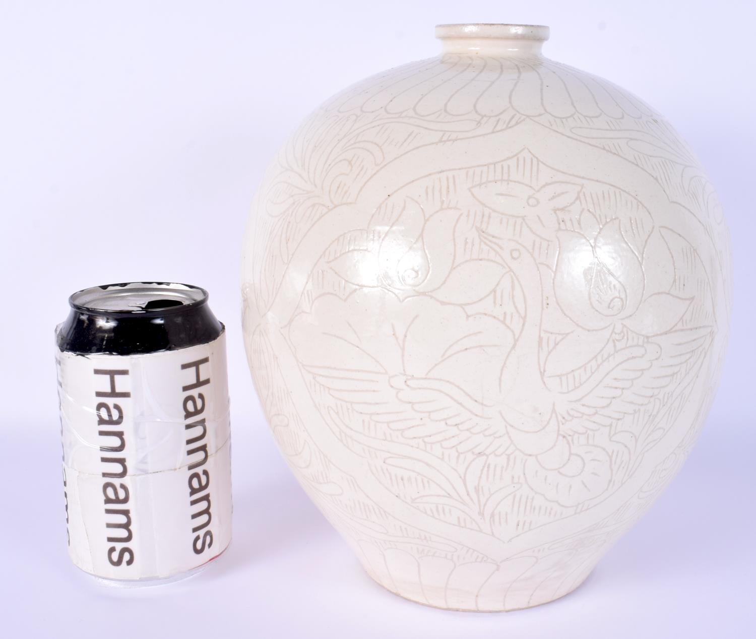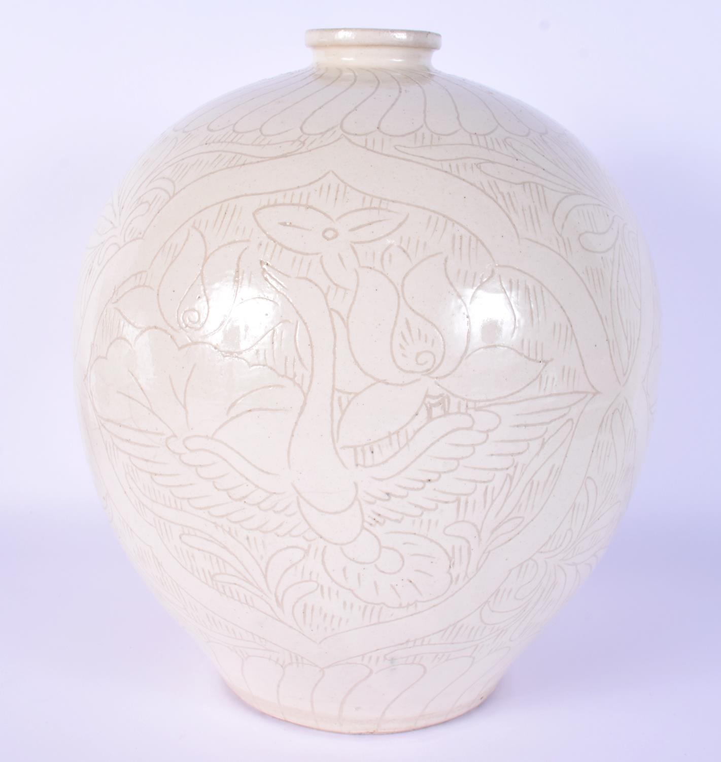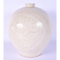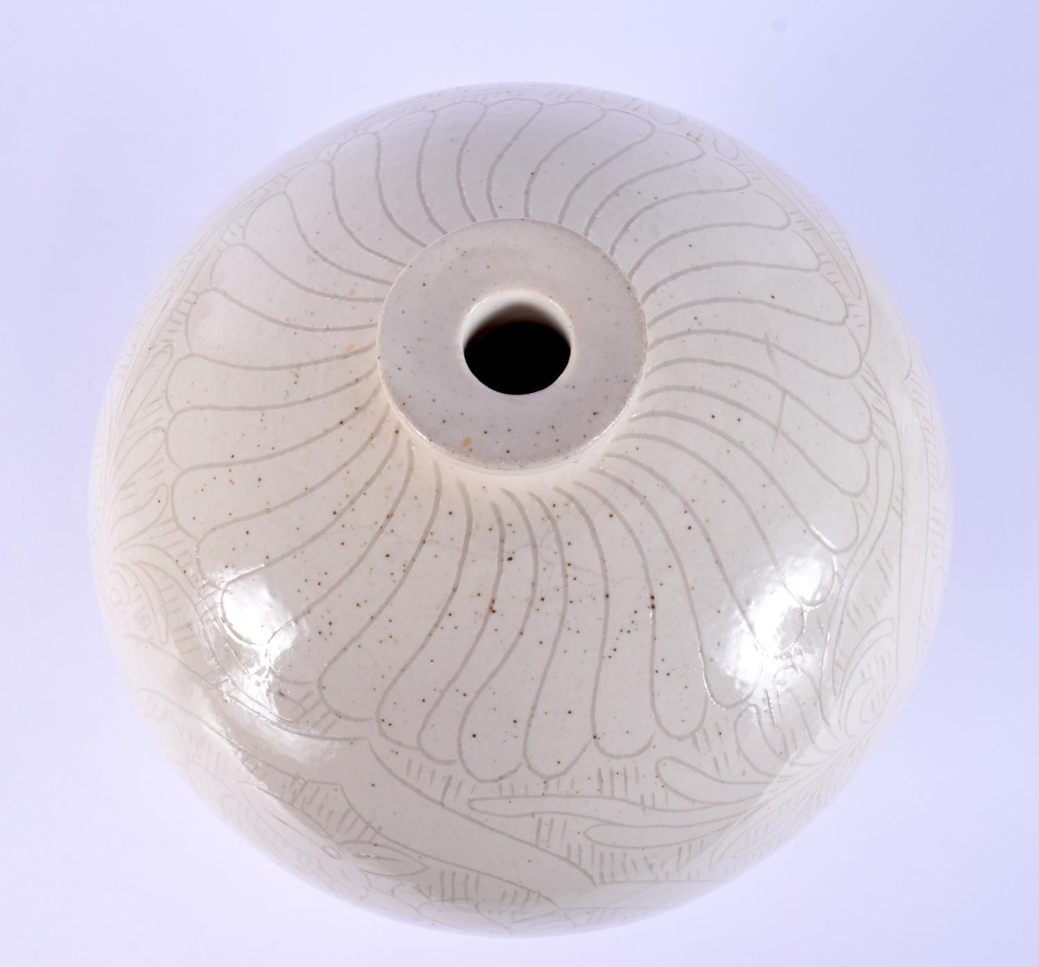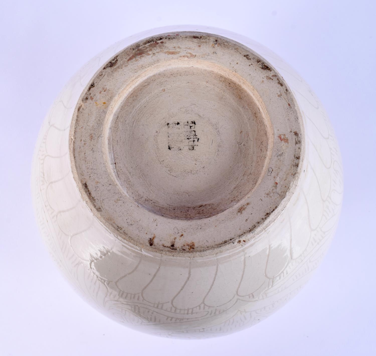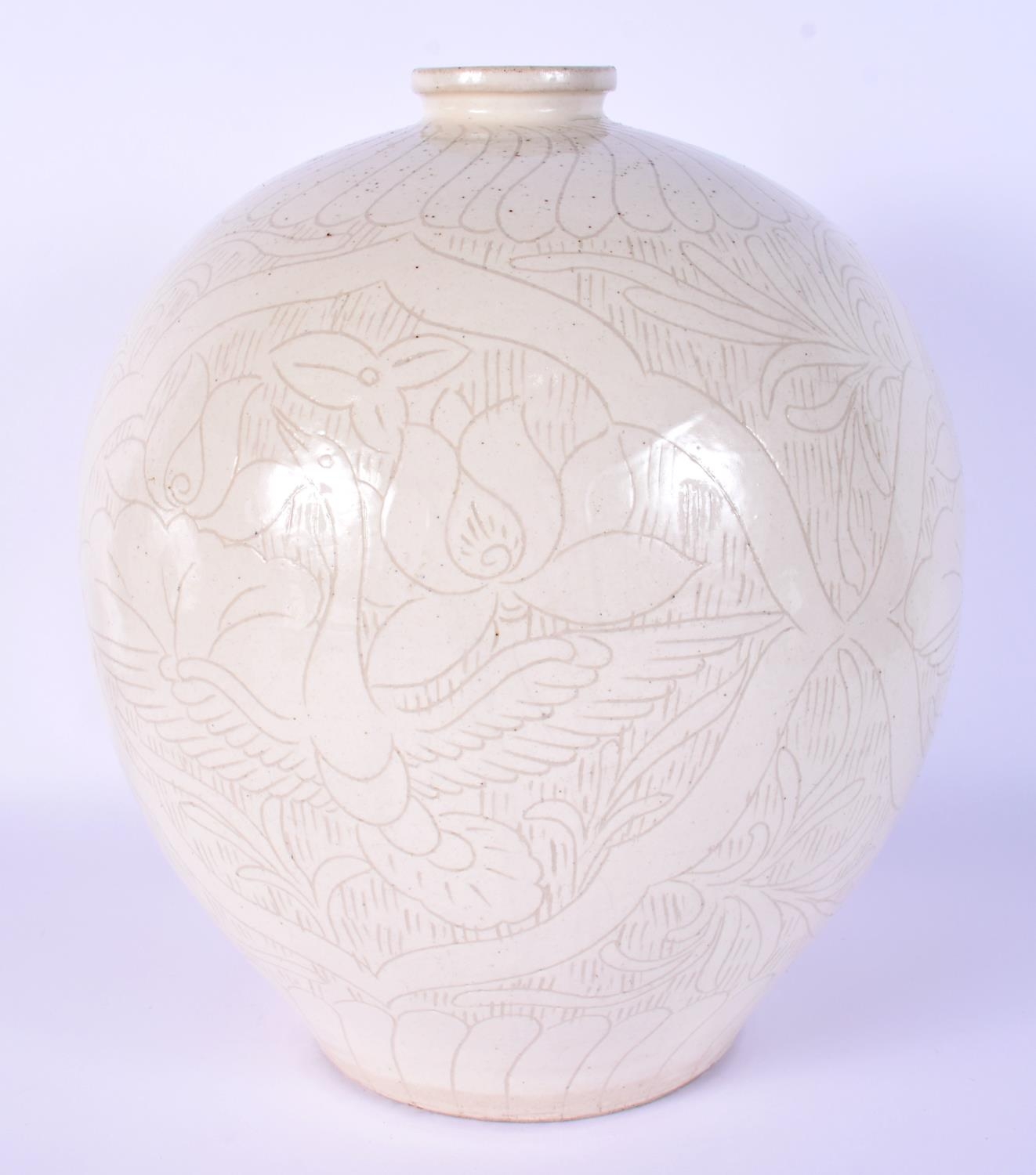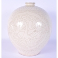 A RARE CHINESE QING DYNASTY INCISED WHITE GLAZED BULBOUS VASE decorated with birds and foliage. 24 cm x 17 cm.