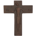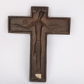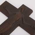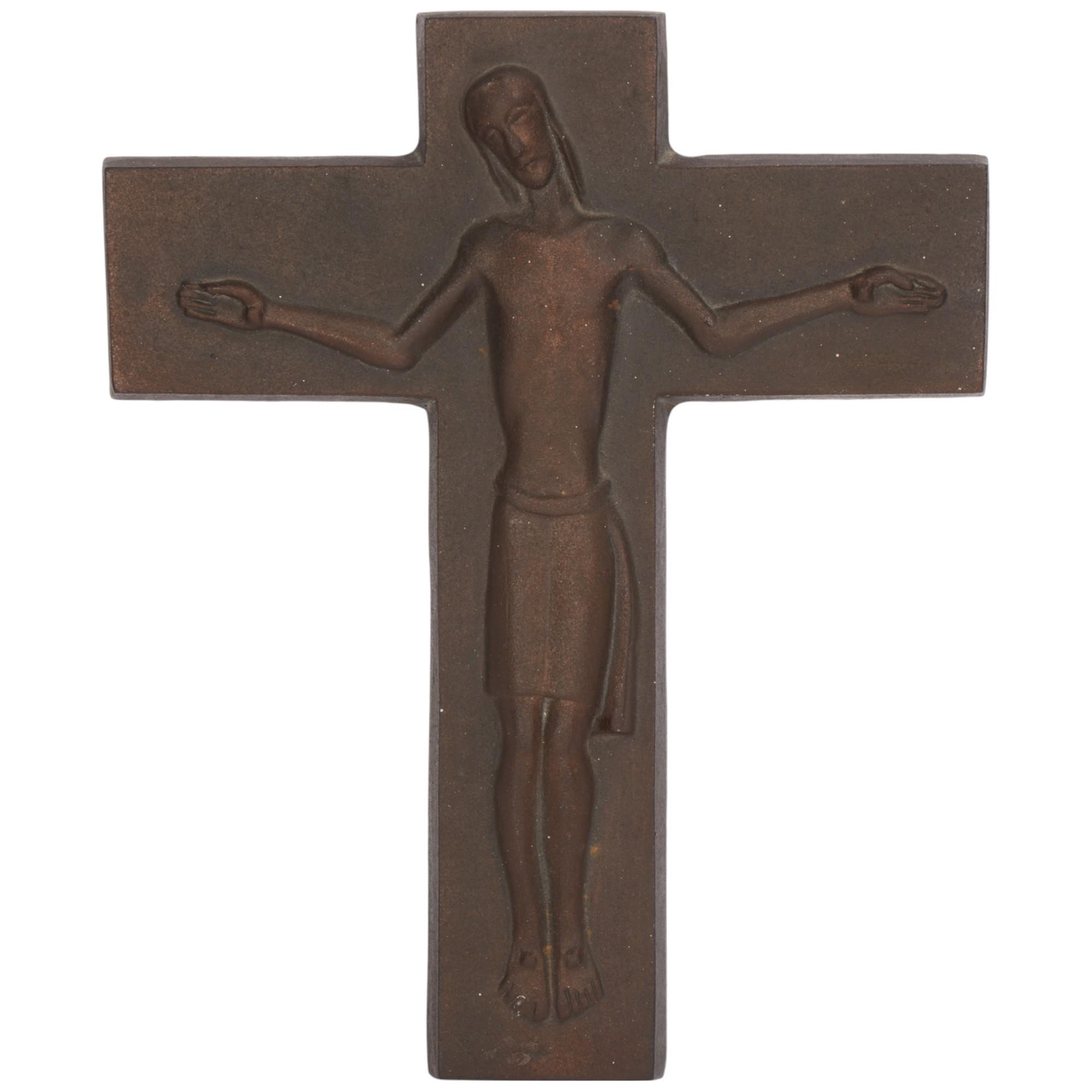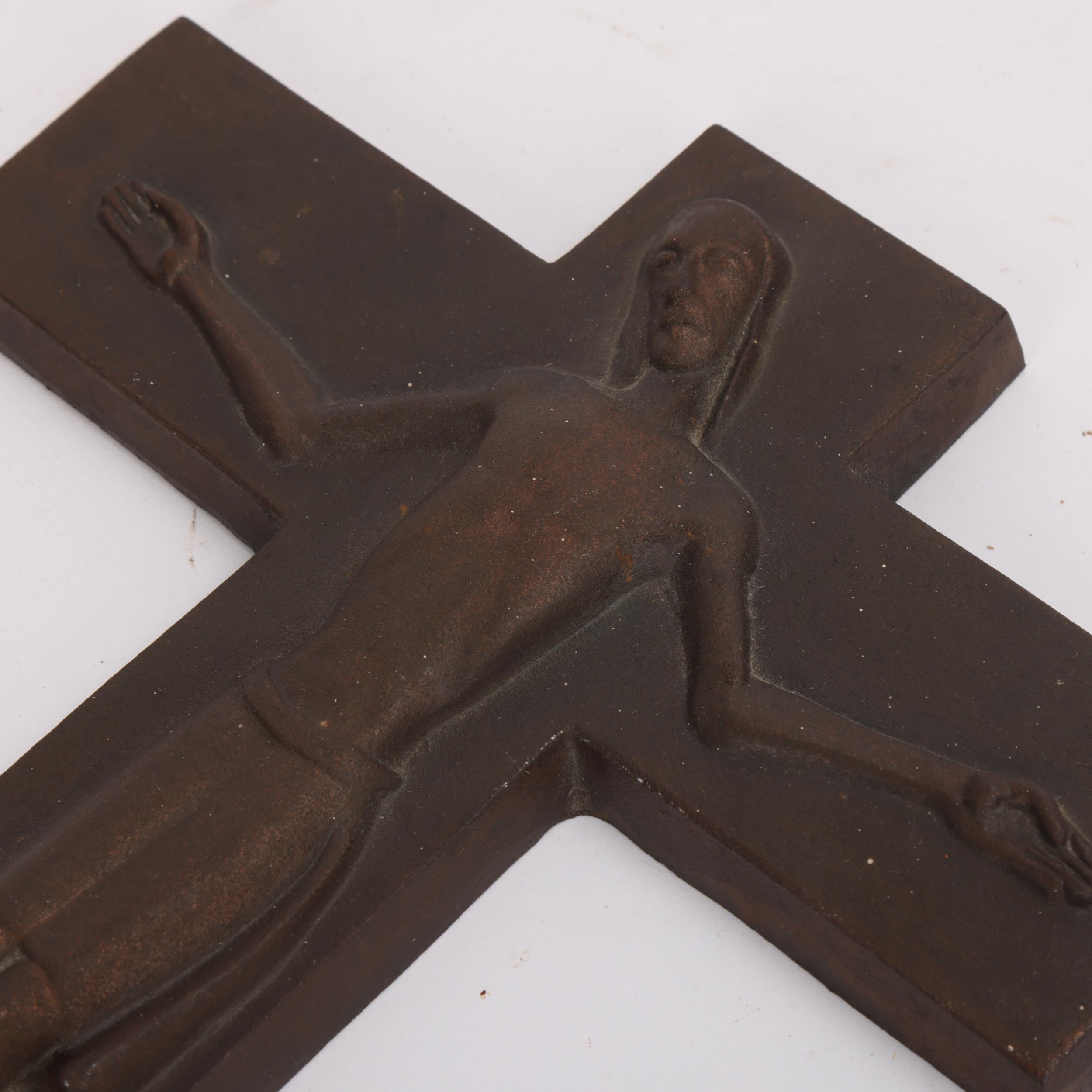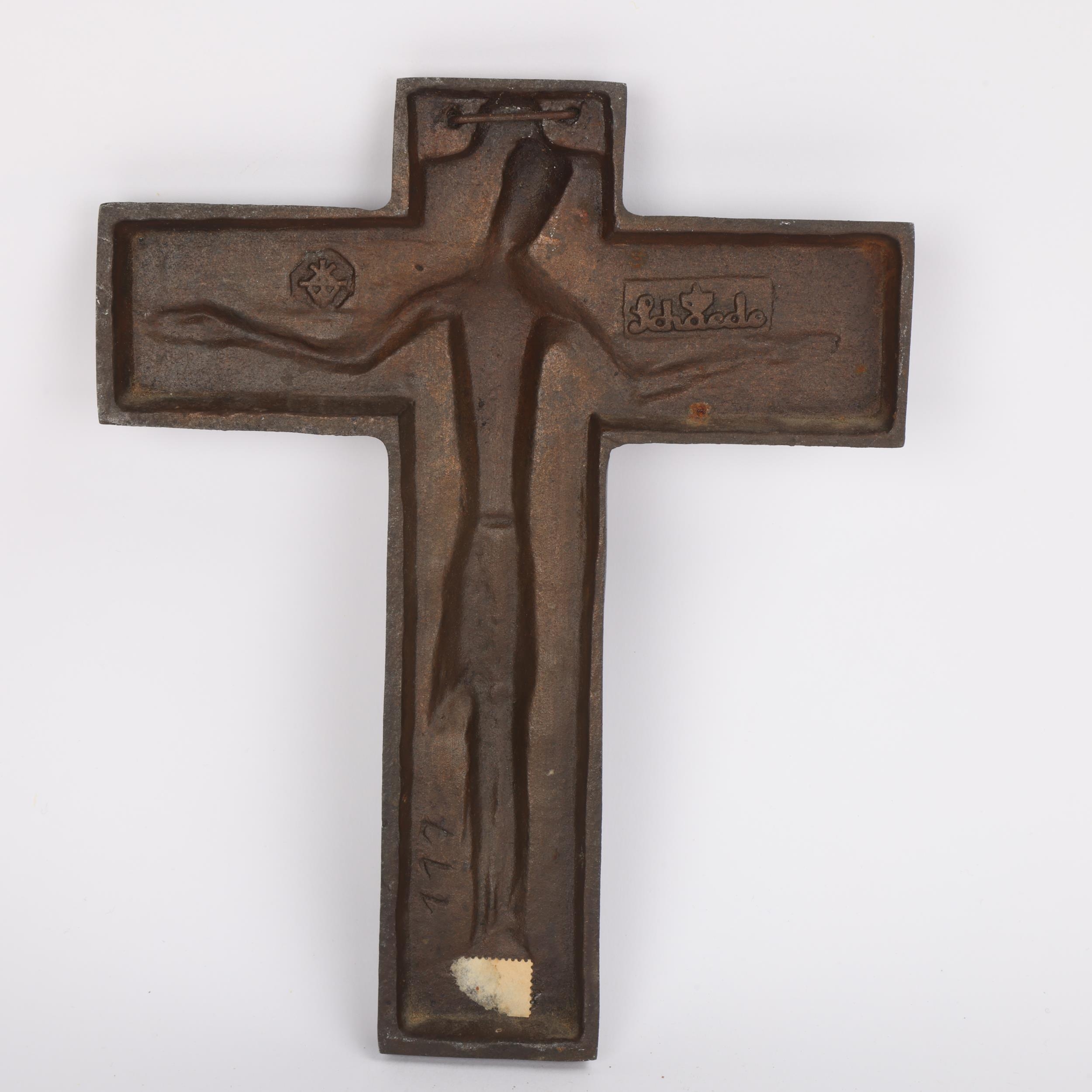 A Brutalist/Modernist cast bronze crucifix, makers marks to reverse, Schaede, numbered 117, height 22cm, width 17.5cm
