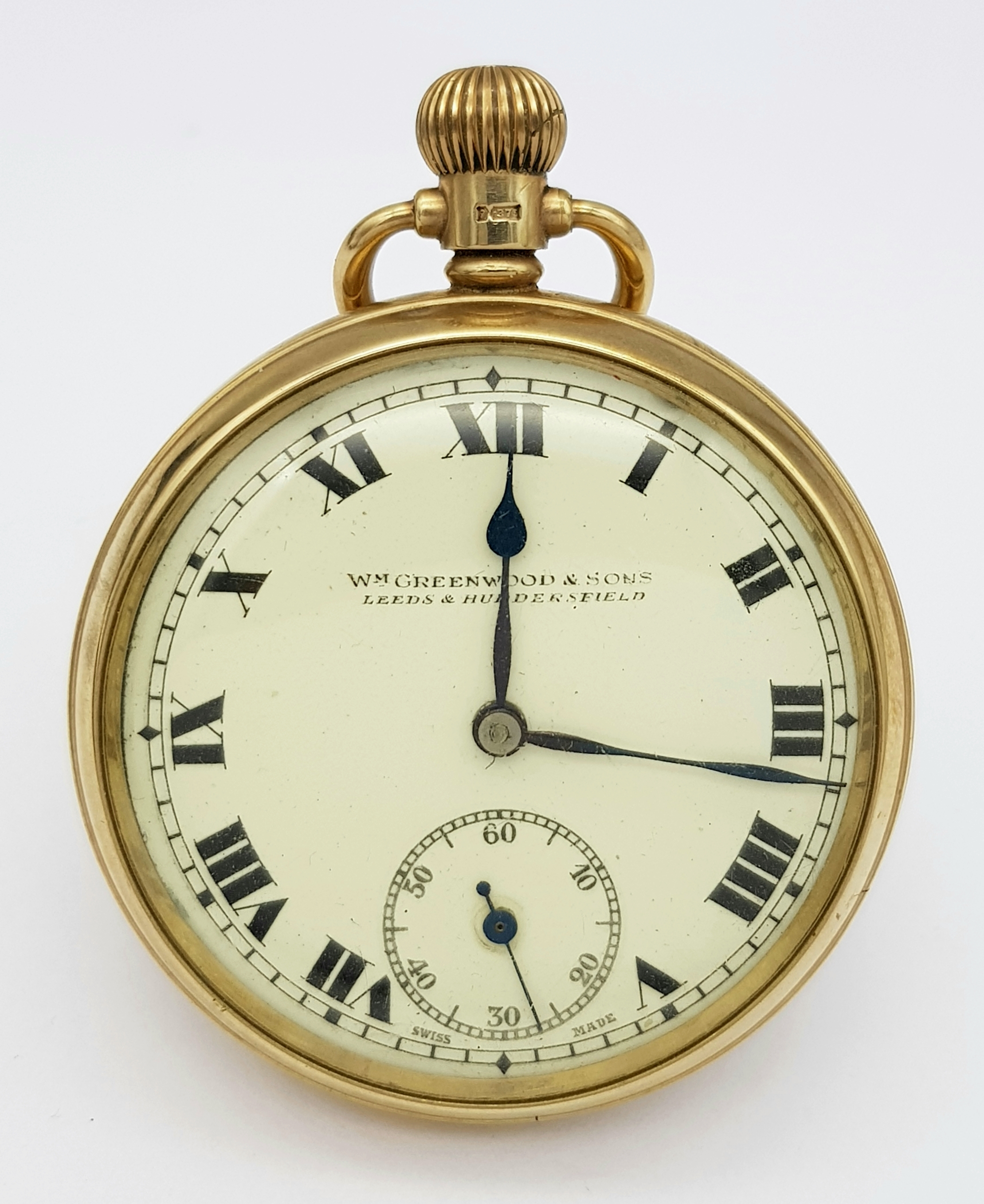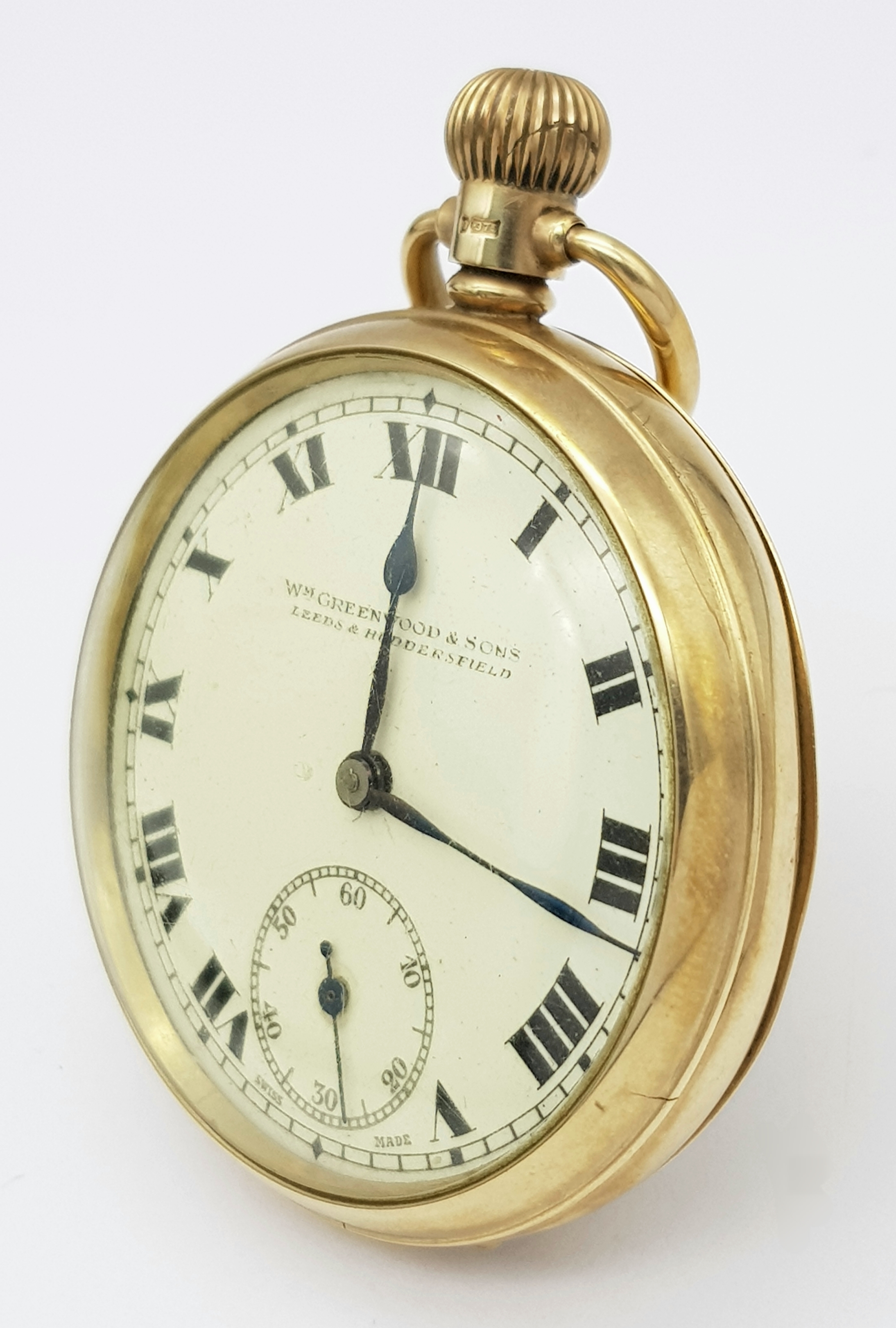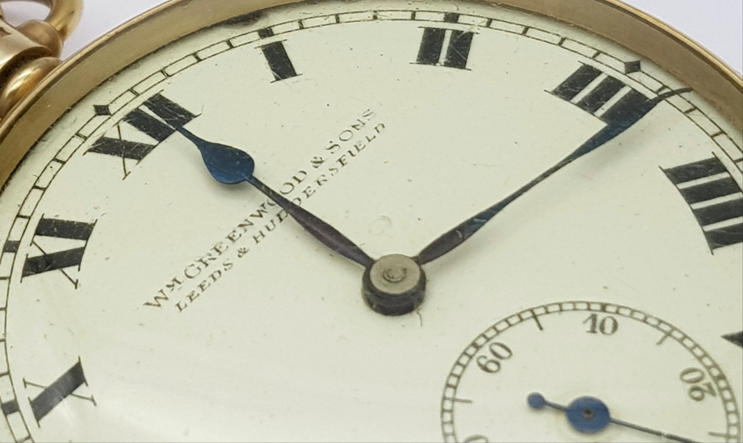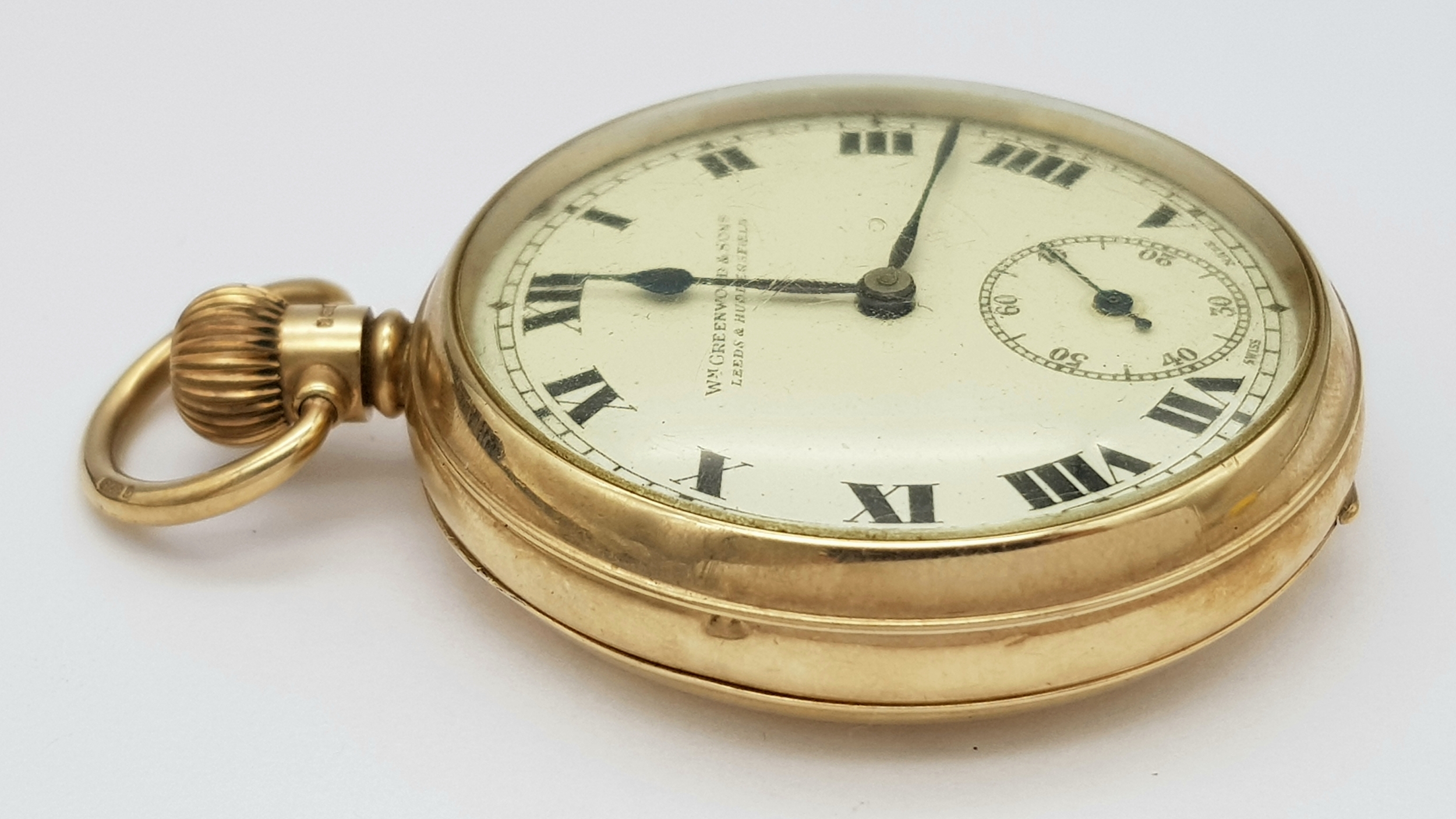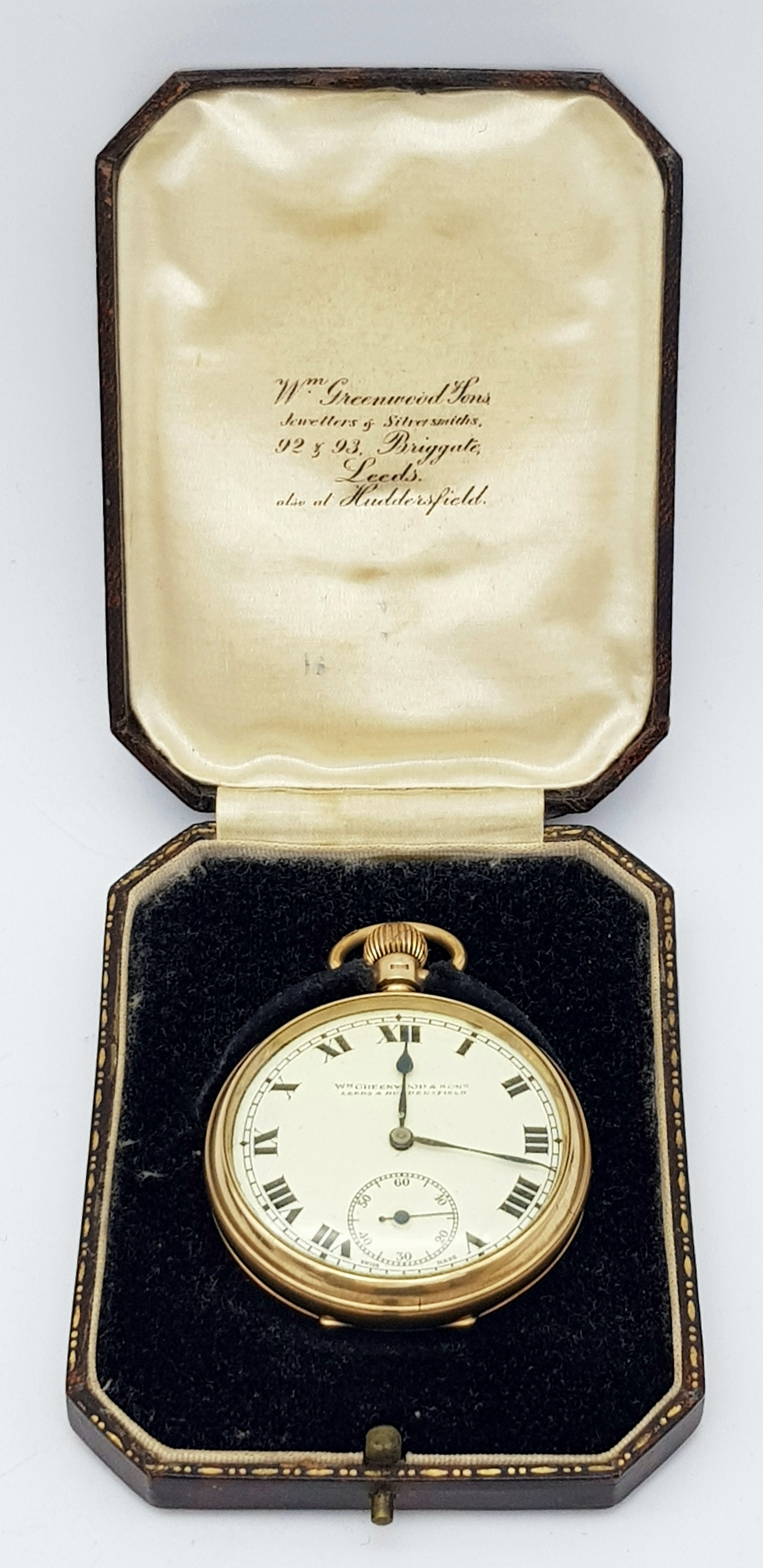 An Antique 9K Gold Greenwood and Sons Double Rear Cased Pocket Watch. Top winder. White dial with second sub dial and Roman Numerals. 50mm diameter. In working order but because of age no guarantees. Comes with original fitted case. 75g total weight.