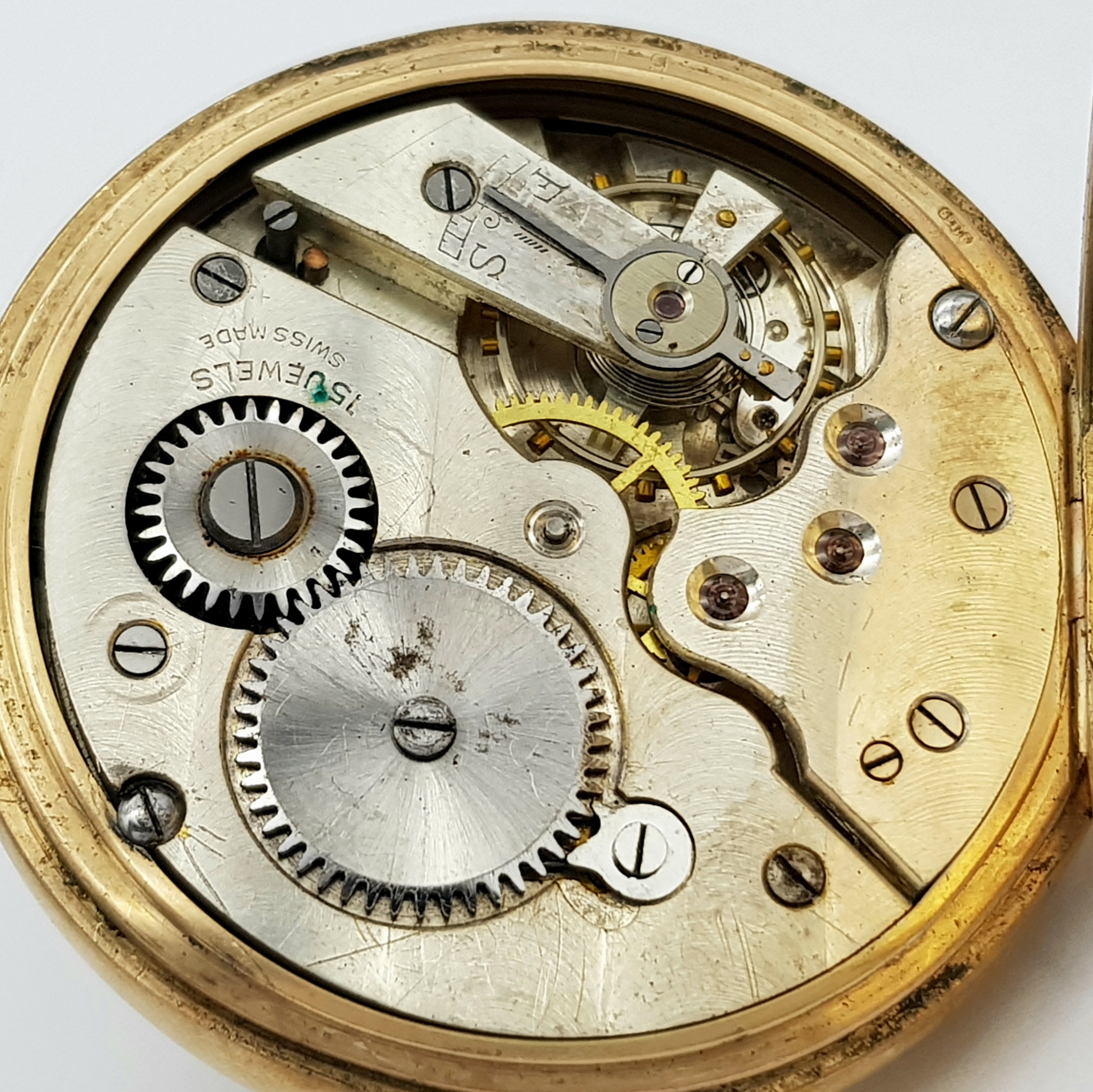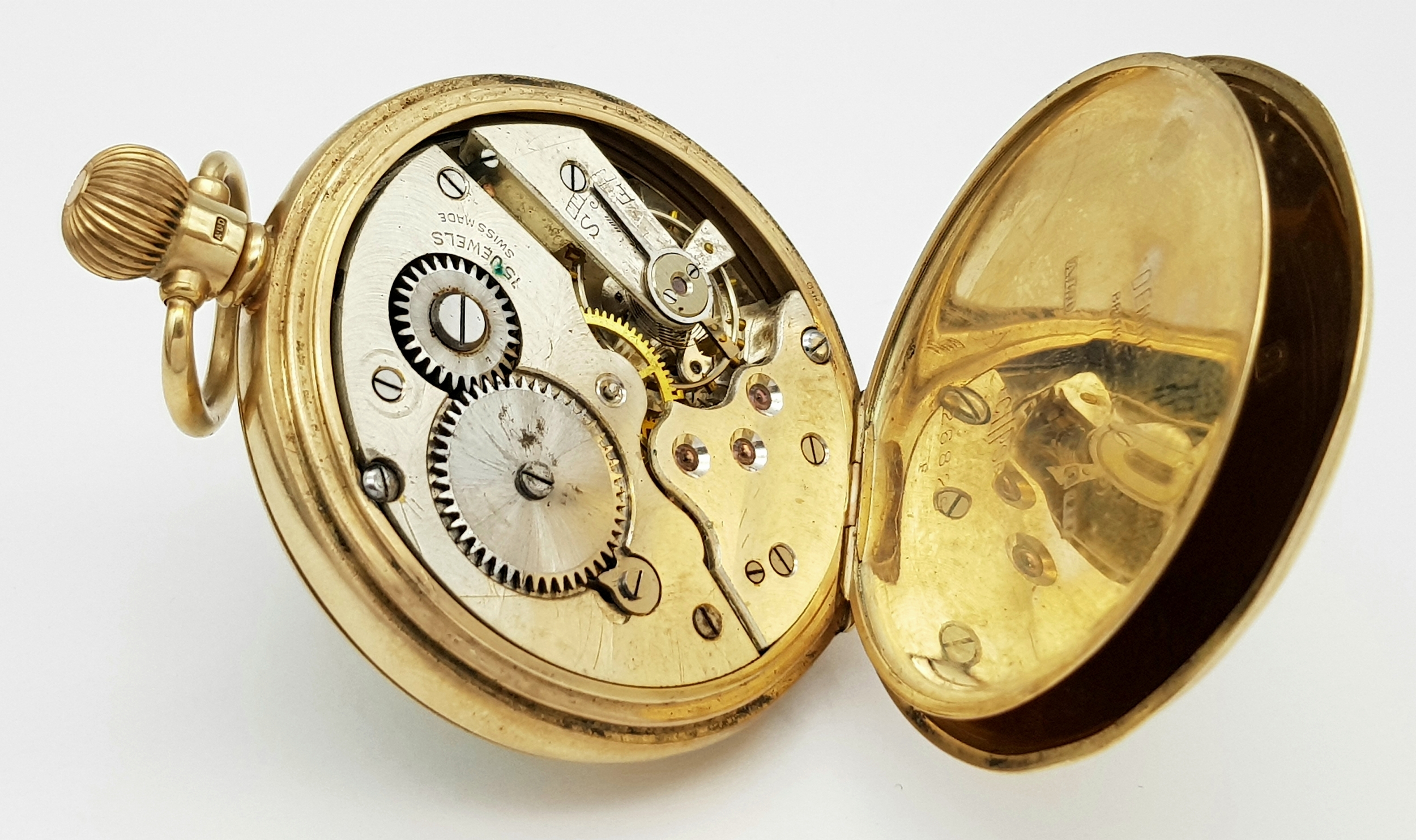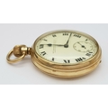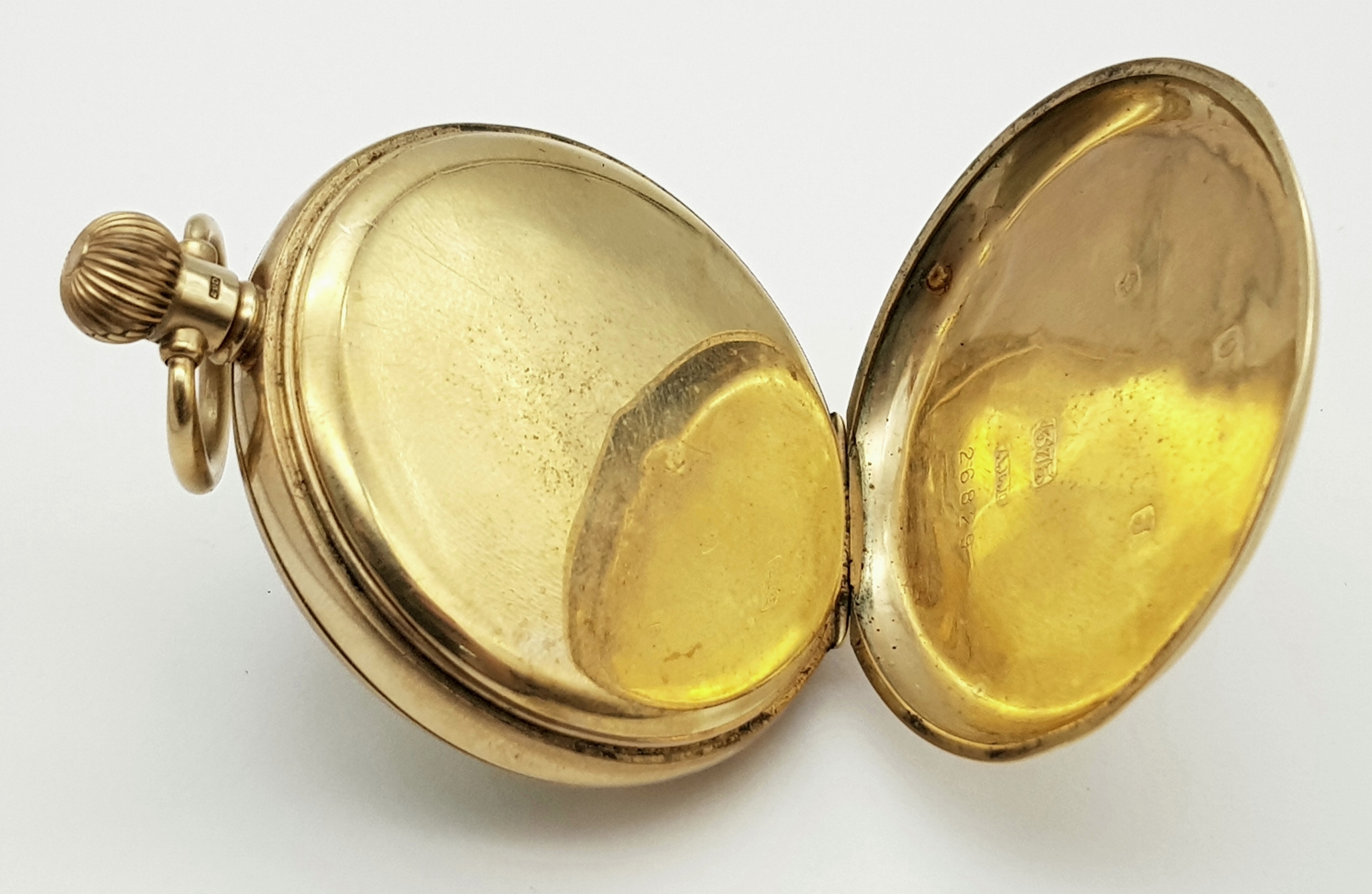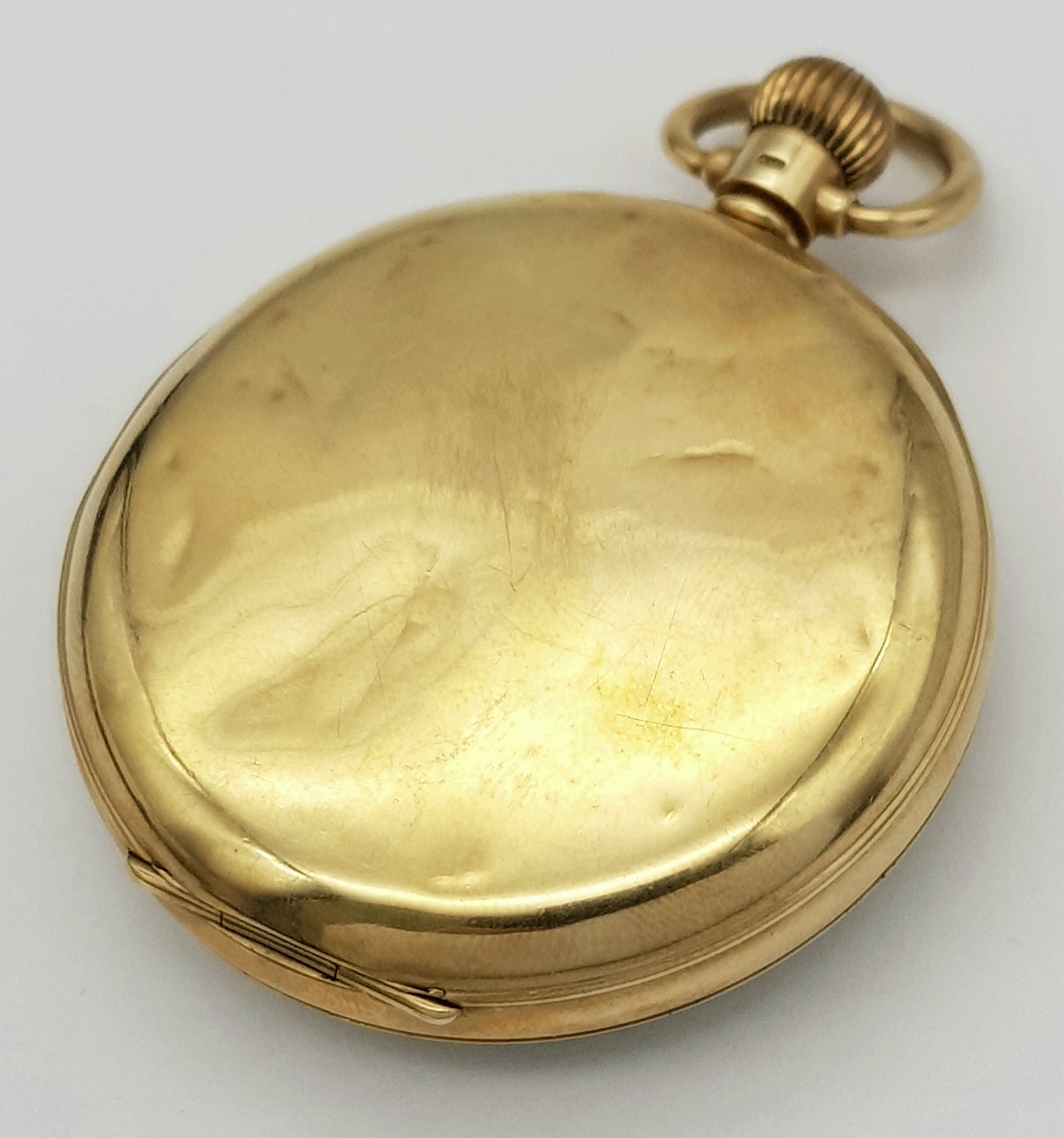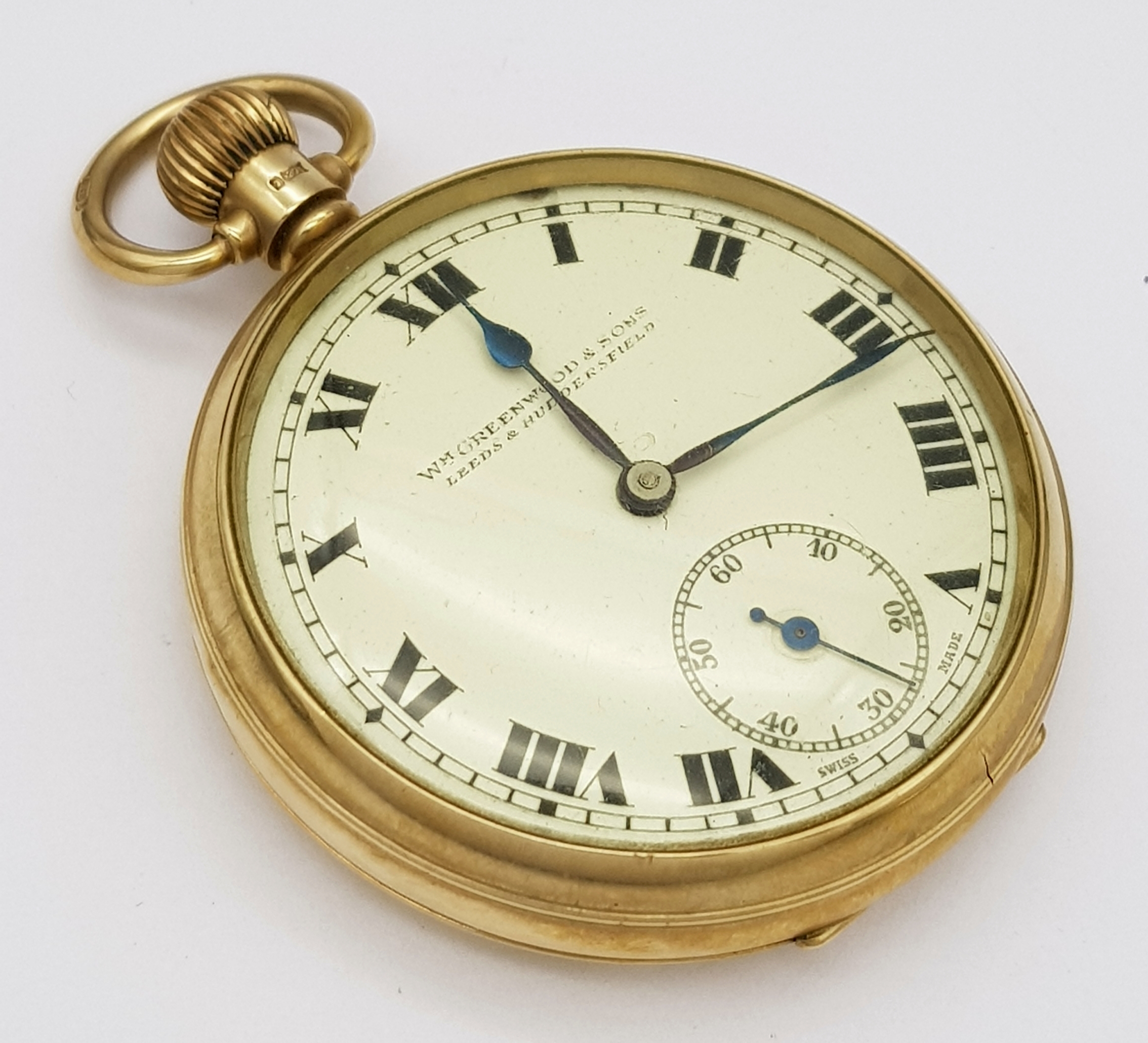An Antique 9K Gold Greenwood and Sons Double Rear Cased Pocket Watch. Top winder. White dial with second sub dial and Roman Numerals. 50mm diameter. In working order but because of age no guarantees. Comes with original fitted case. 75g total weight.