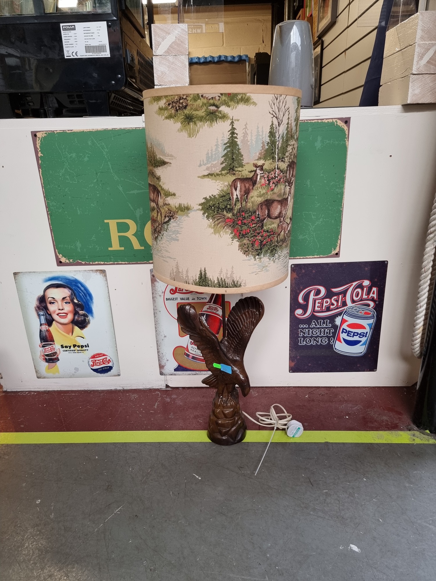 Unusual large Wooden sculptured lamp of eagle and lampshade of nature scene
