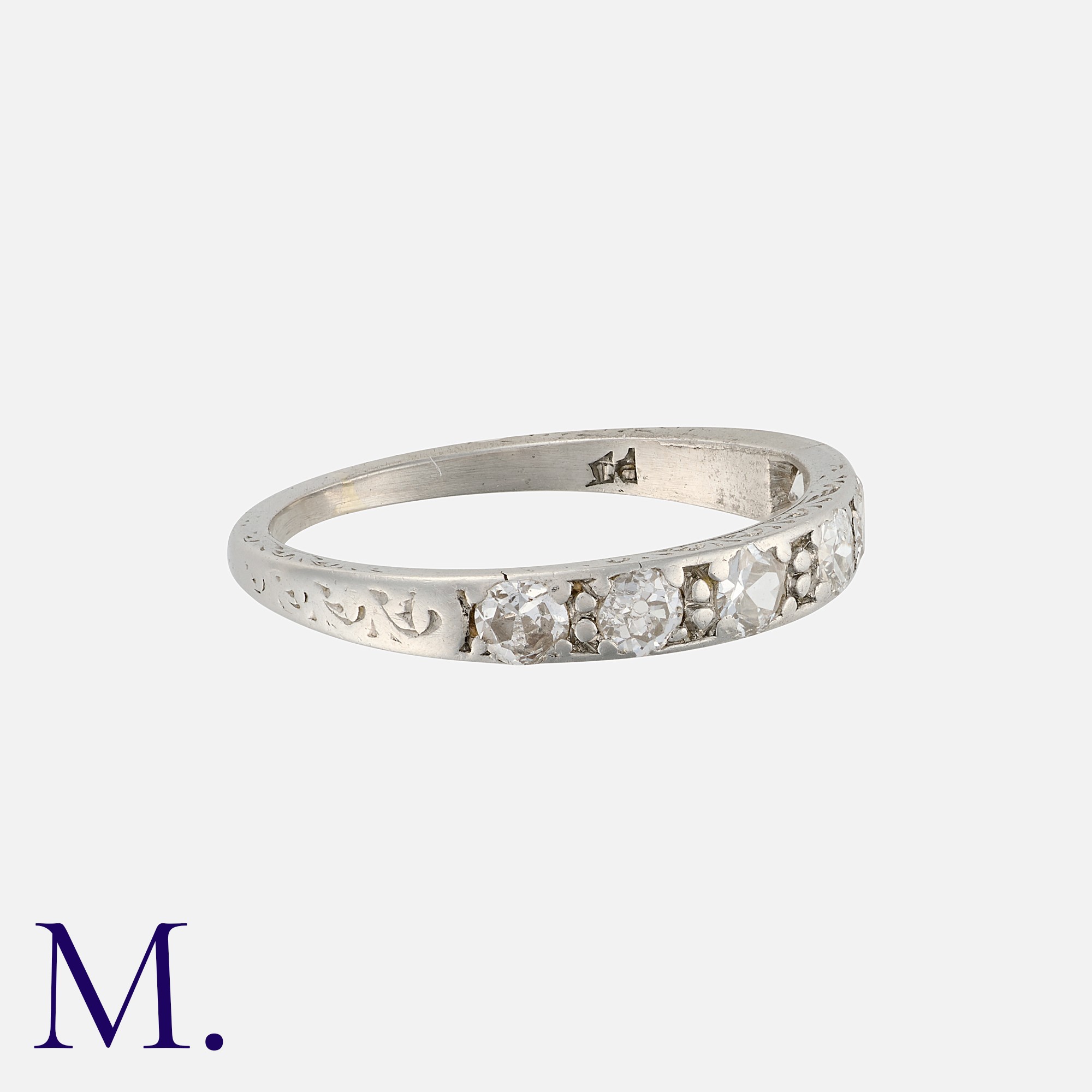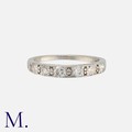 A Diamond Band, in platinum, set with a row of six round cut diamonds. Marked indistinctly PT.