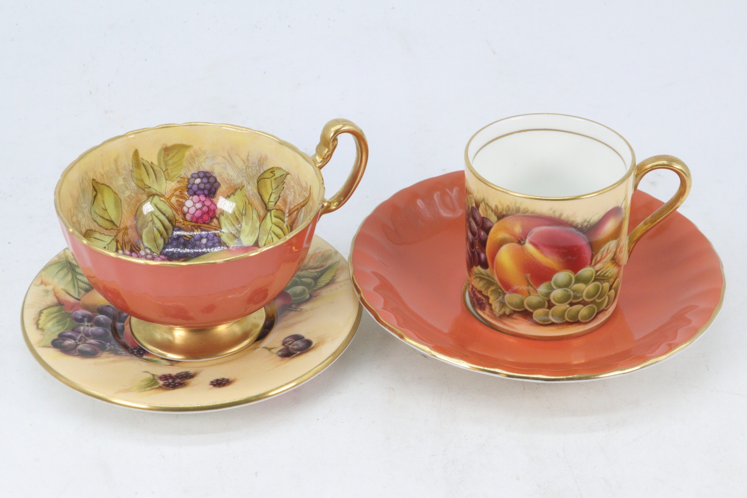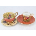 Aynsley gold fruit coffee can and saucer together with a similar tea cup and saucer