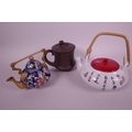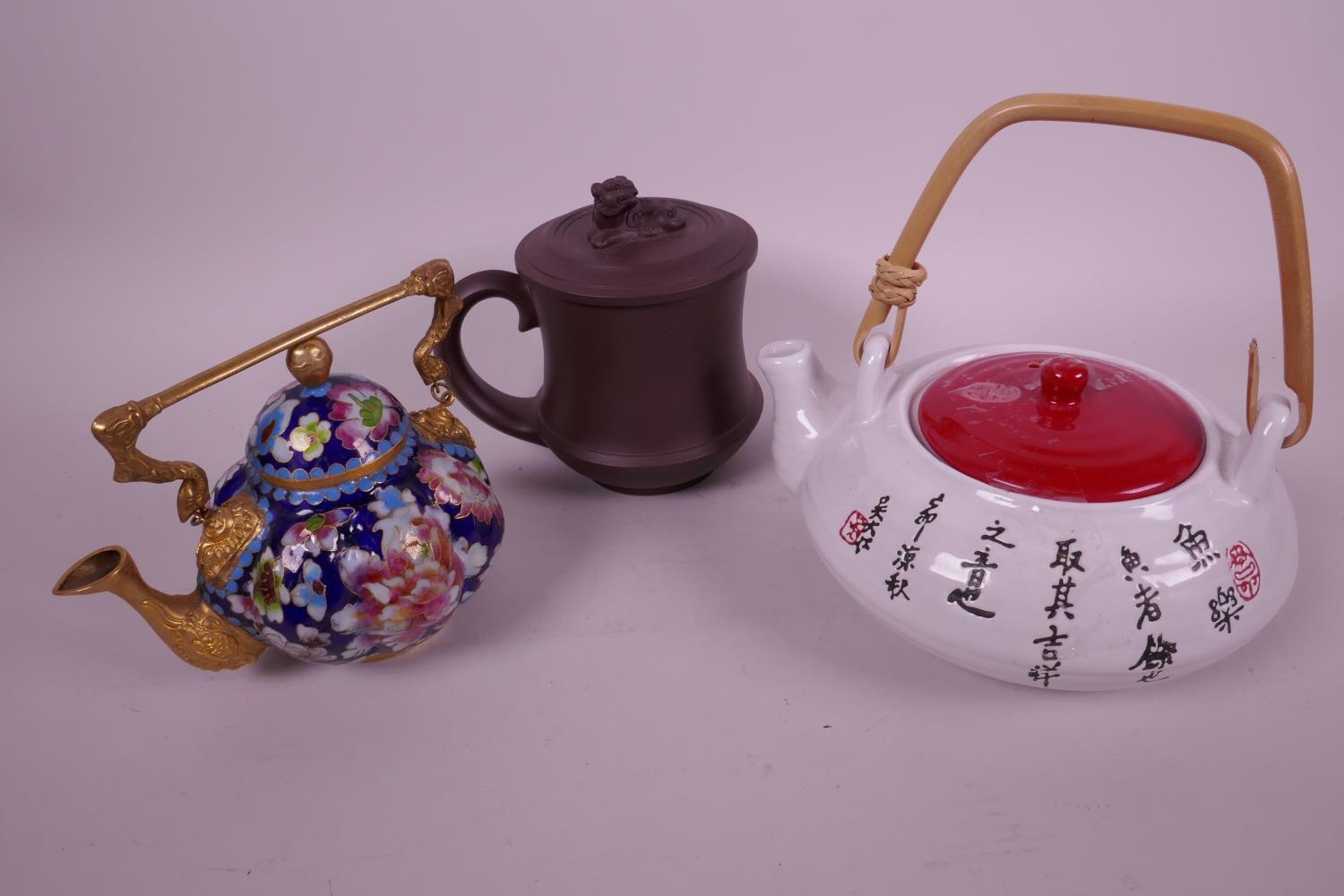 A Chinese cloisonné teapot decorated in bright floral enamels, 4½" high, together with a Chinese red earthenware Yixing style teapot and a white glazed pottery teapot of squat form decorated with calligraphy