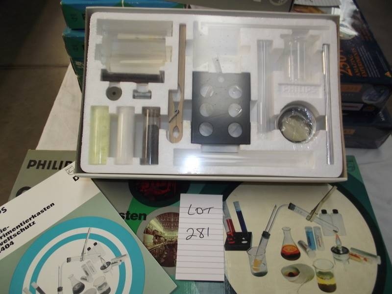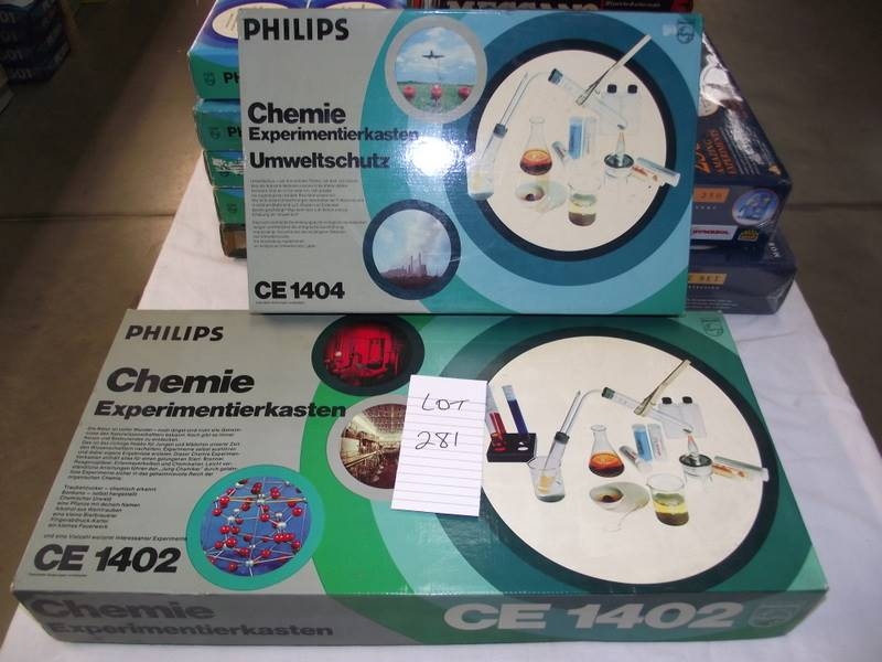 2 Philips chemistry sets (German) CE1404 and CE1402, small one is sealed inside, some components may be missing so being sold as seen, collect only