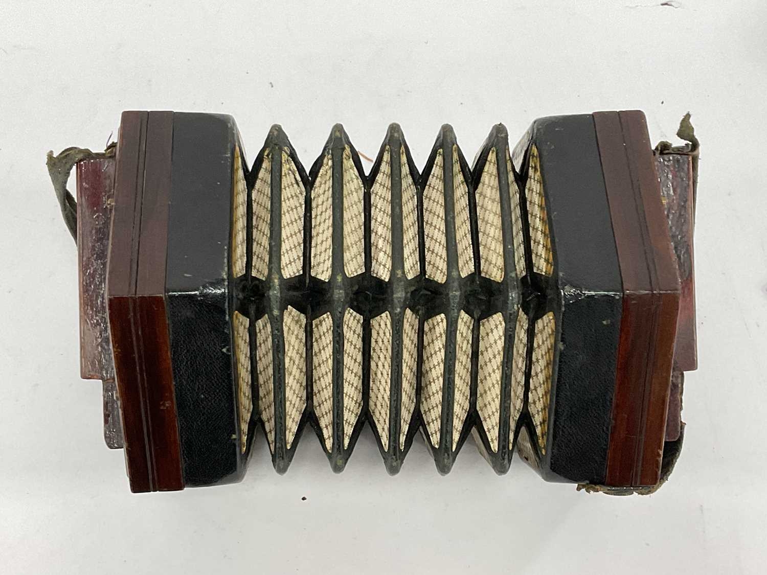 When shut approx. 11.5cm wide, 16cm wide. Wear commensurate with age, handles a/f, bellows with some cracks and marks but appear generally intact, box a/f.
