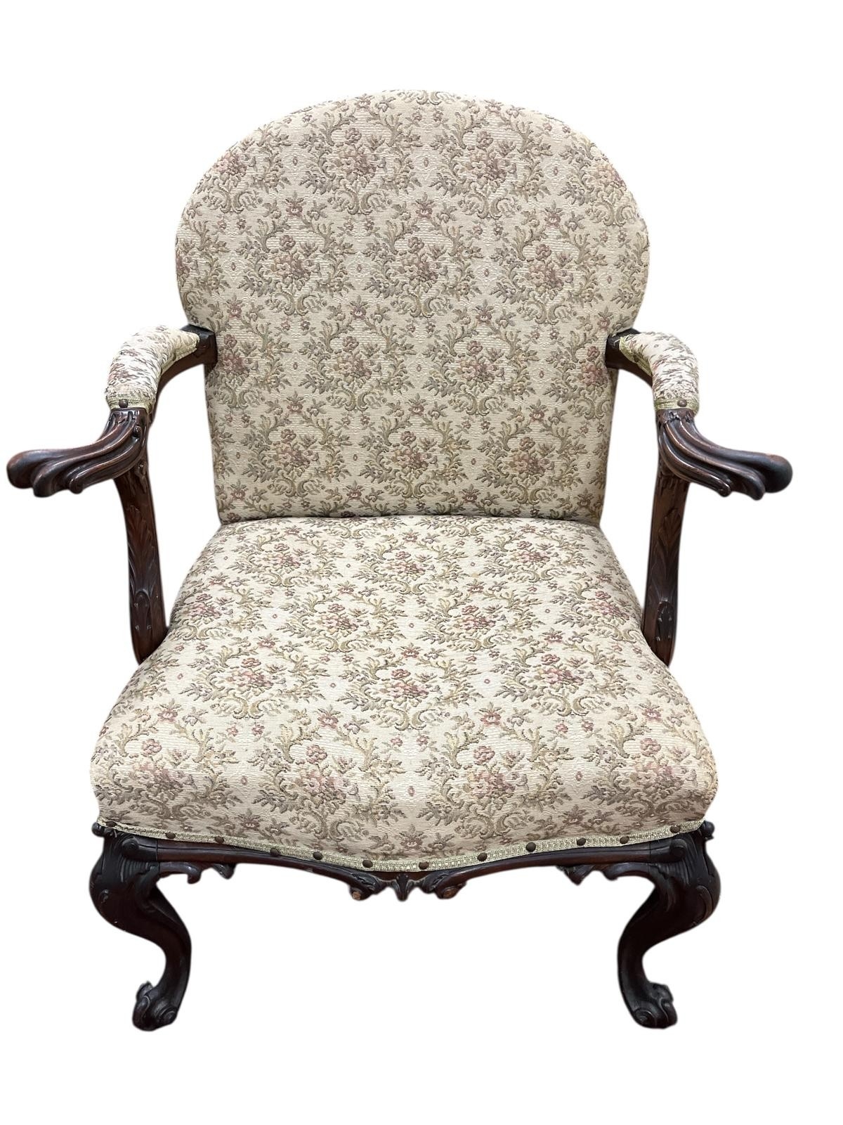 A GOOD 19TH CENTURY CARVED MAHOGANY AND UPHOLSTERED ELBOW CHAIR the rectangular arched upholstered back and seat with carved scroll arms on cabriole legs with scroll toes