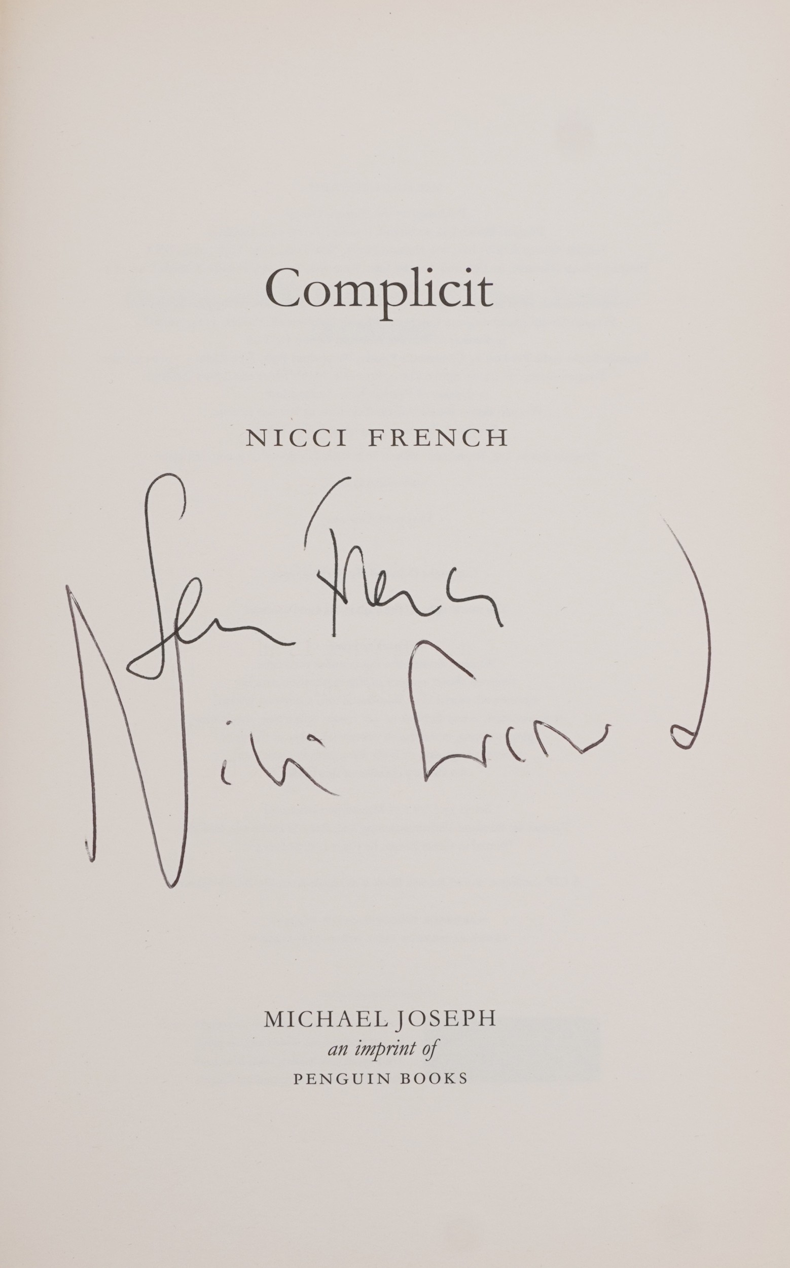Complicit by Nicci French, a signed hardback edition, published in 2009, 16cm wide.