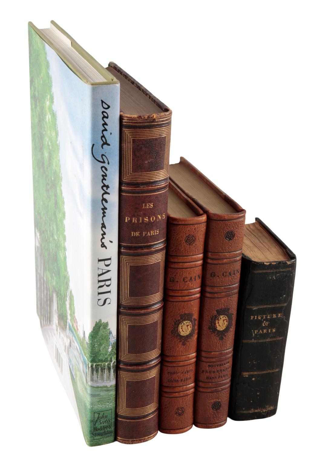 fourteenth edition, printed for Samuel Leigh, London 1824, gilt tooled black leather bound; together with Alhoy and Lurine: 'Les Prisons de Paris', new edition, published by Gustave Havard, 1846, half gilt tooled red leather bound; Cain, G.: 'Promenades Dans Paris' and 'Nouvelles Promenades Dans Paris', both half brown leather bound; and Gentleman, David - 'Paris', first edition, published by Hodder and Stoughton, 1991, hardbound with dustwrapper (5)