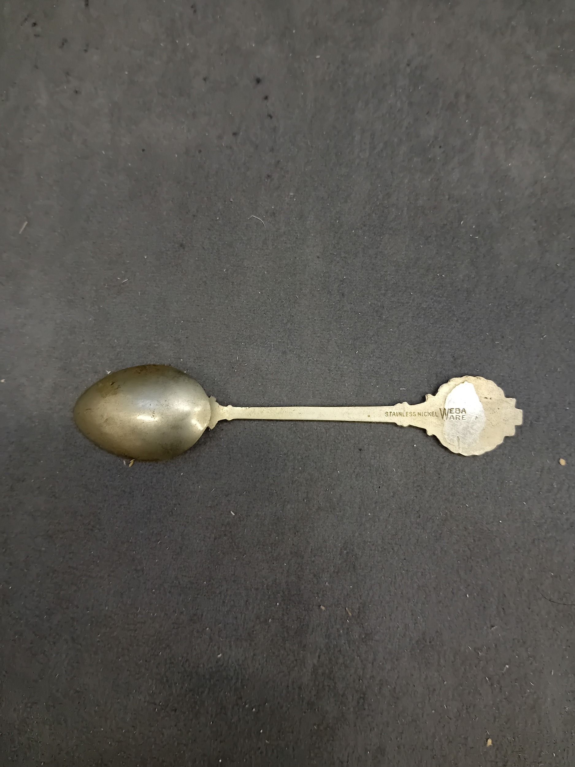 A mid-20th century commemorative souvenir spoon, explicitly marked "Festival of 1951 Britain" in its bowl. The spoon features an ornate finial depicting a stylized bird or phoenix in a copper-toned metal, encircled by a silver-toned wreath and frame. The reverse of the handle is stamped "STAINLESS NICKEL WEBA WARE".