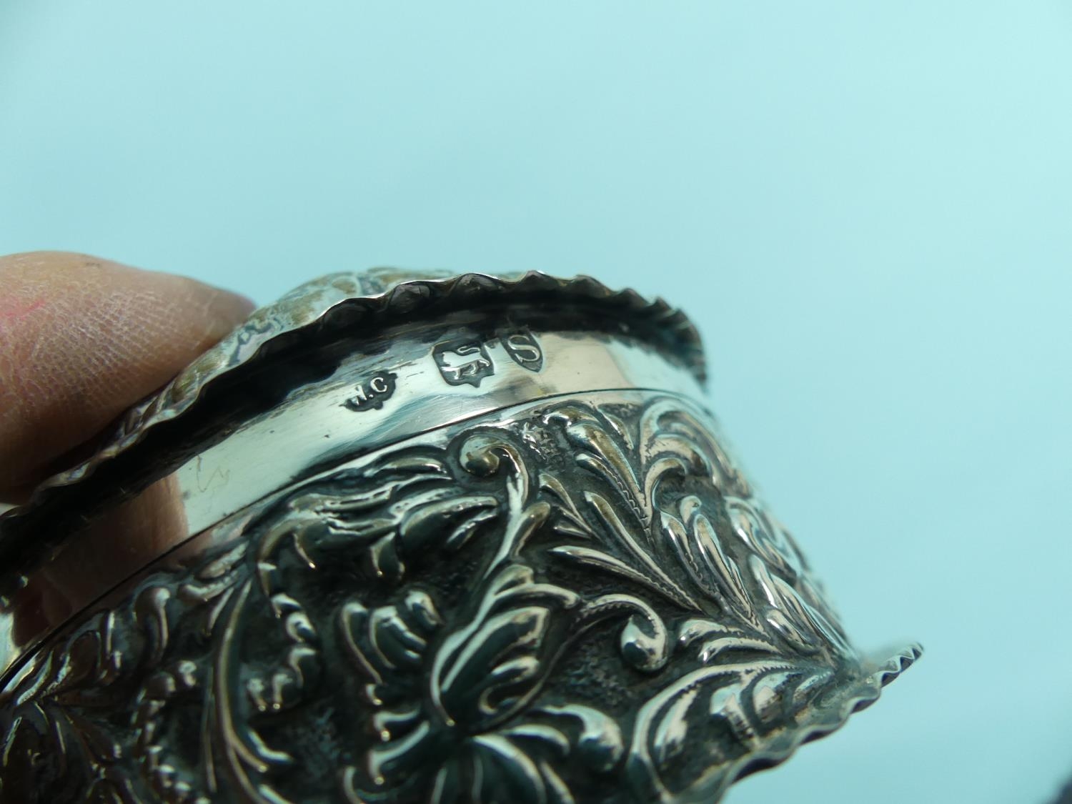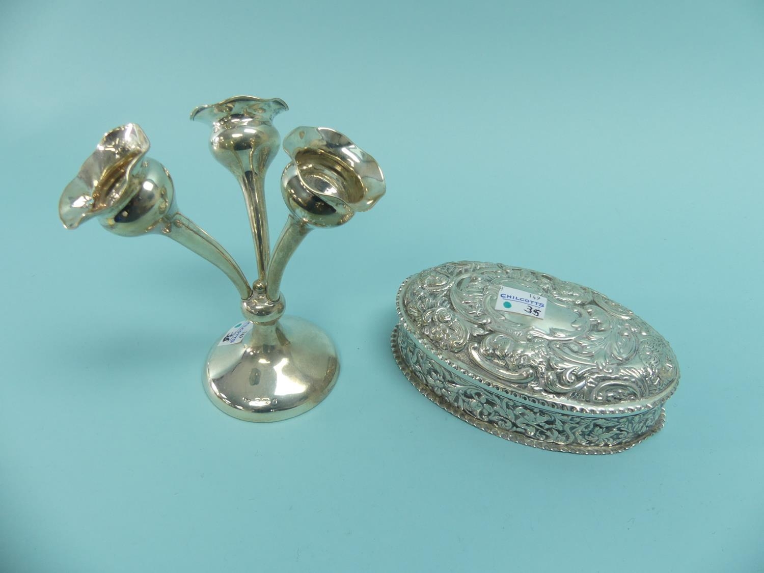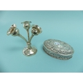 A late Victorian silver oval hinged Box, by William Comyns, hallmarked London, 1893, chased with cherubs and scrolling foliate decoration, 6in (15cm) wide, 4.8ozt, together with a small Edwardian silver three branch flower epergne, hallmarked Birmingham, 1906, weighted (2)
