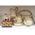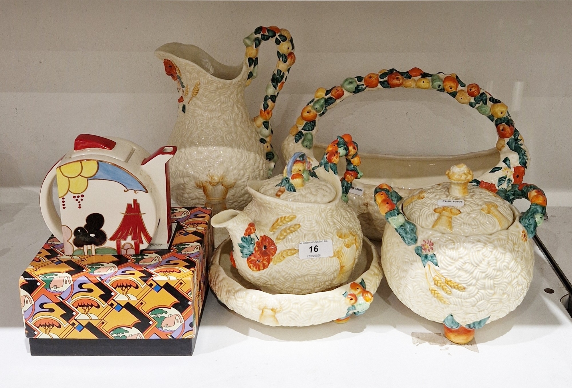 Collection of Clarice Cliff Celtic Harvest pattern wares, printed green Newport Pottery marks, moulded England shape numbers, comprising a baluster water jug, an oval basket, a teapot and cover, a circular straining dish, a two-handled globular jar and cover and a Wedgwood Clarice Cliff Collectors Club Bizarre teapot in original box, circa 1997, printed black marks (6)