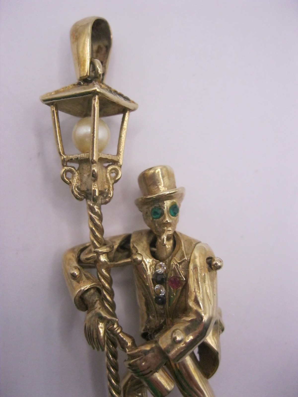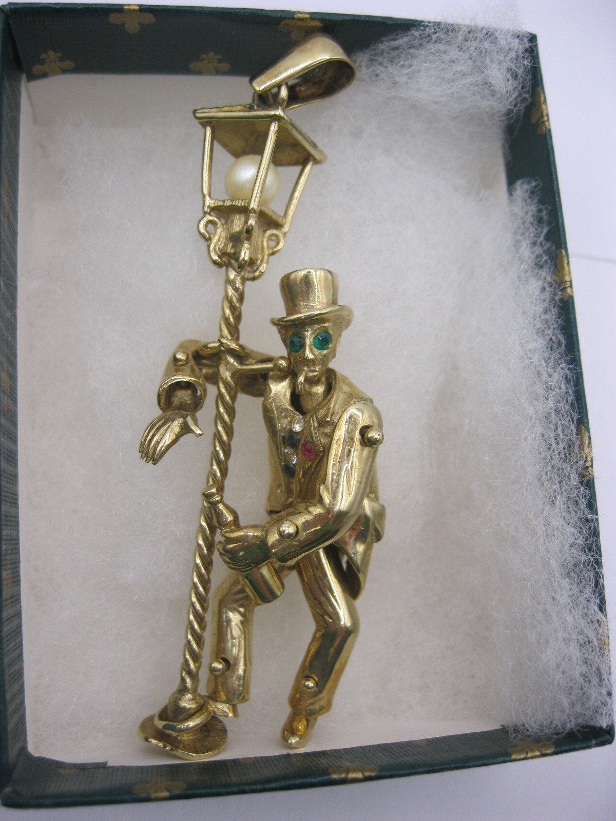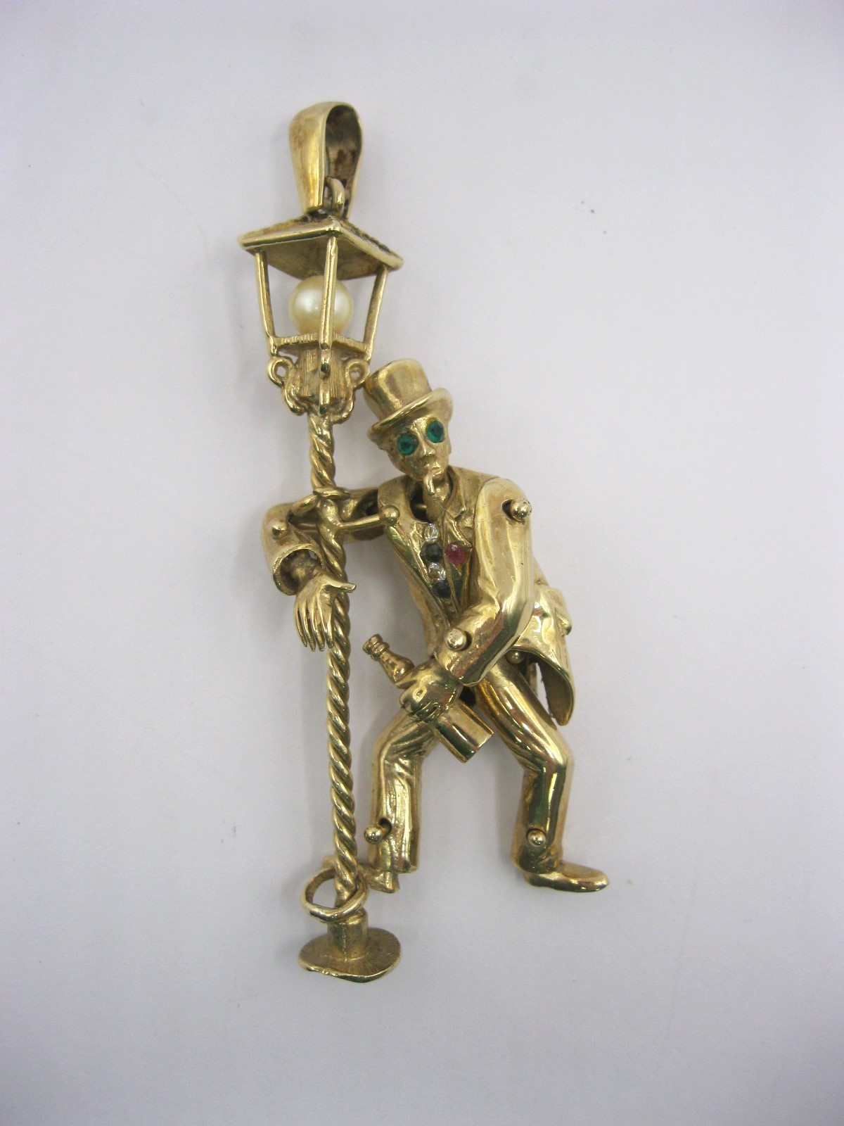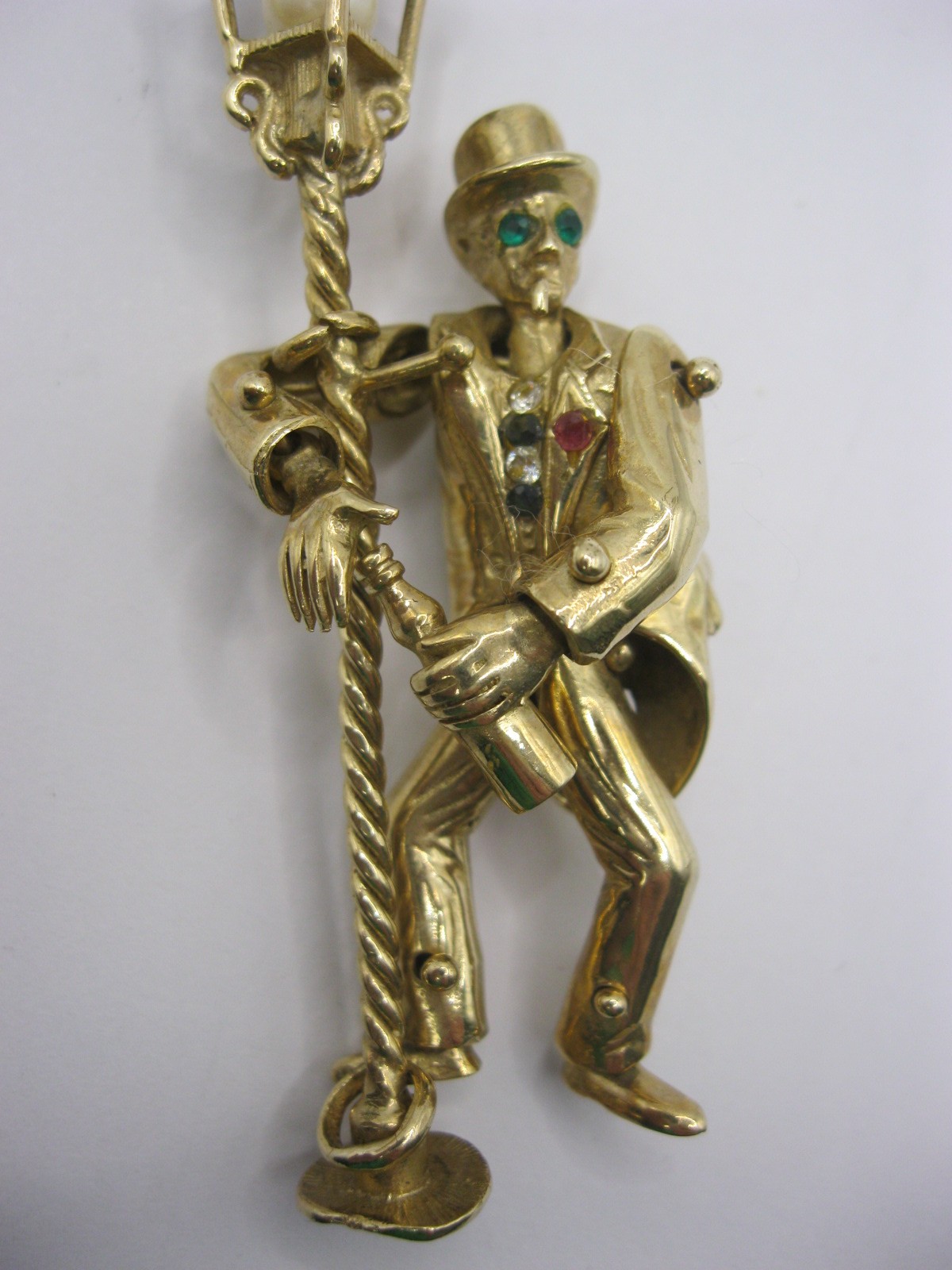 The figure is articulated at his neck, shoulders, wrists, hips and ankles. He wears a top hat and is holding a wine bottle and has a limp cigarette in his mouth. The figure is enhanced with applied white, blue and green faux stones. The top of the lamppost is set with a simulated pearl within. Height to top of lamppost about 68mm excluding bail. The figure is attached to the post by a loop at an ankle and a loop at his right shoulder. Gross weight of pendant approx. 25.8g. Very good condition. British hallmarks to base of the lamppost. With a green cardboard presentation box.