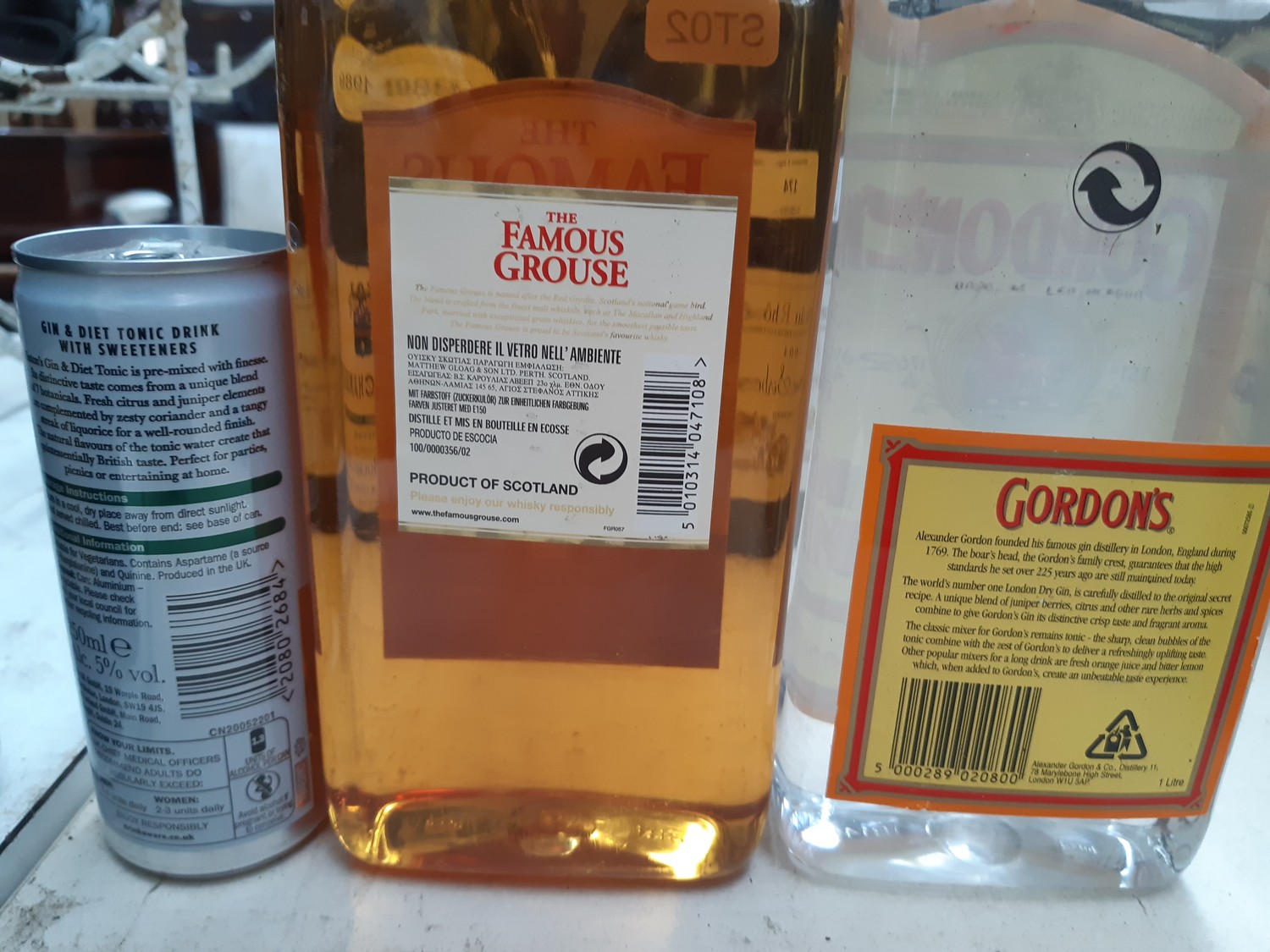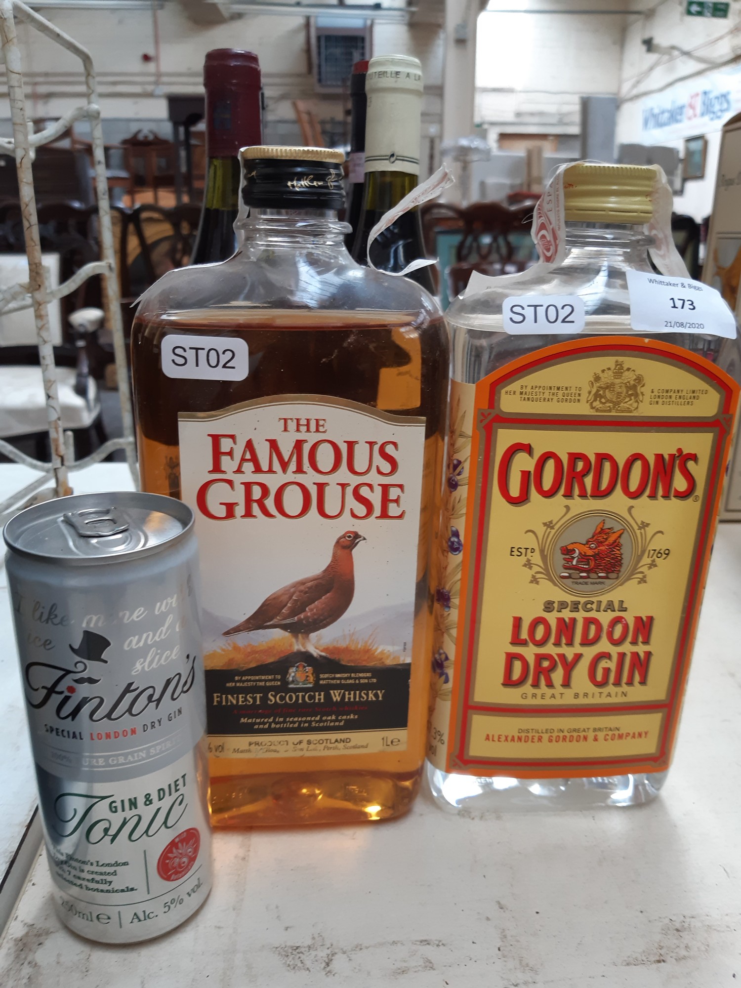 Two 1 litre bottles of spirits to include Gordon's Special London Dry Gin and The Famous Grouse Finest Scotch Whisky together with a can of Finton's Gin & Diet Tonic