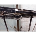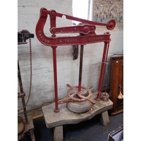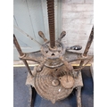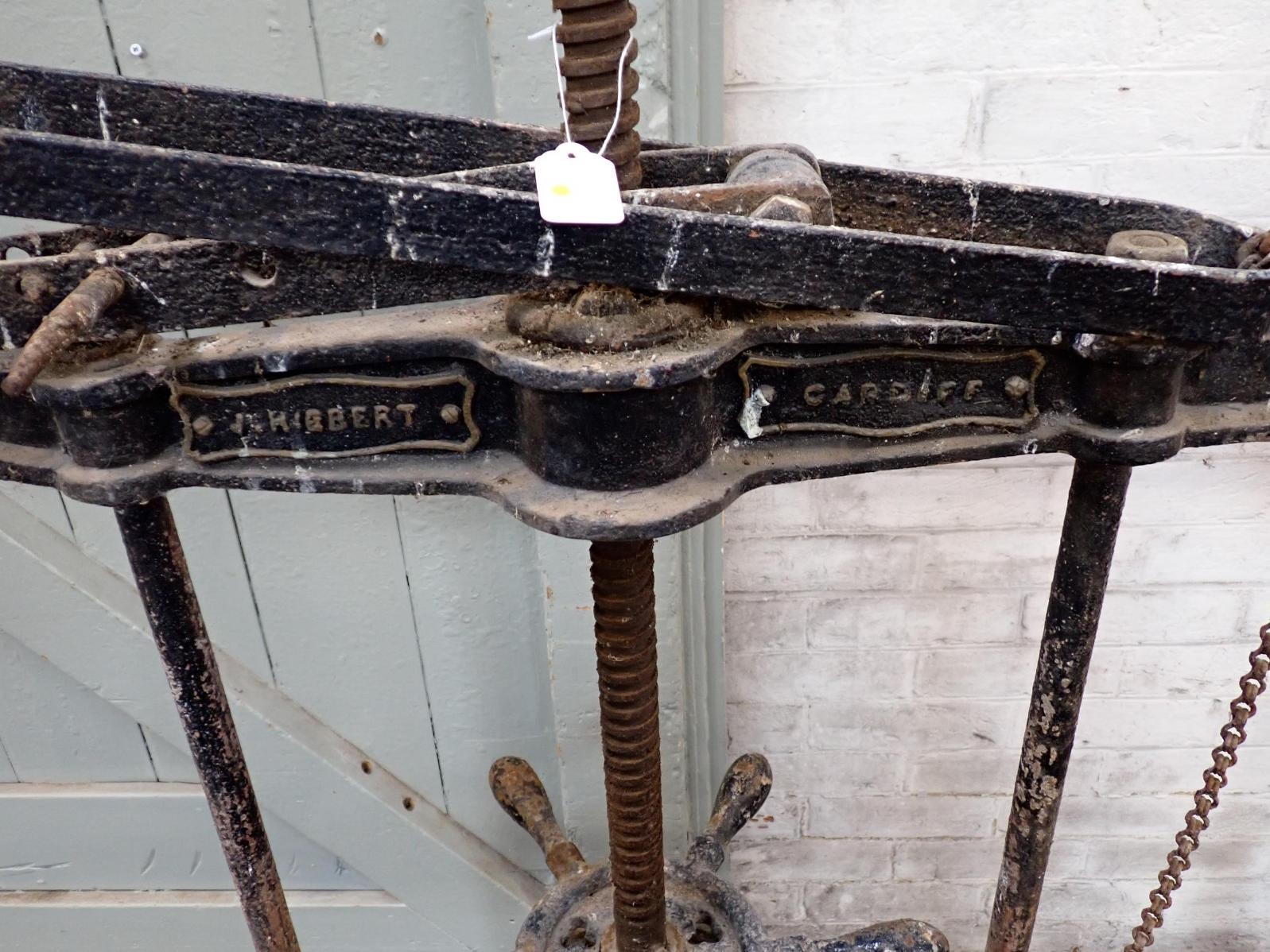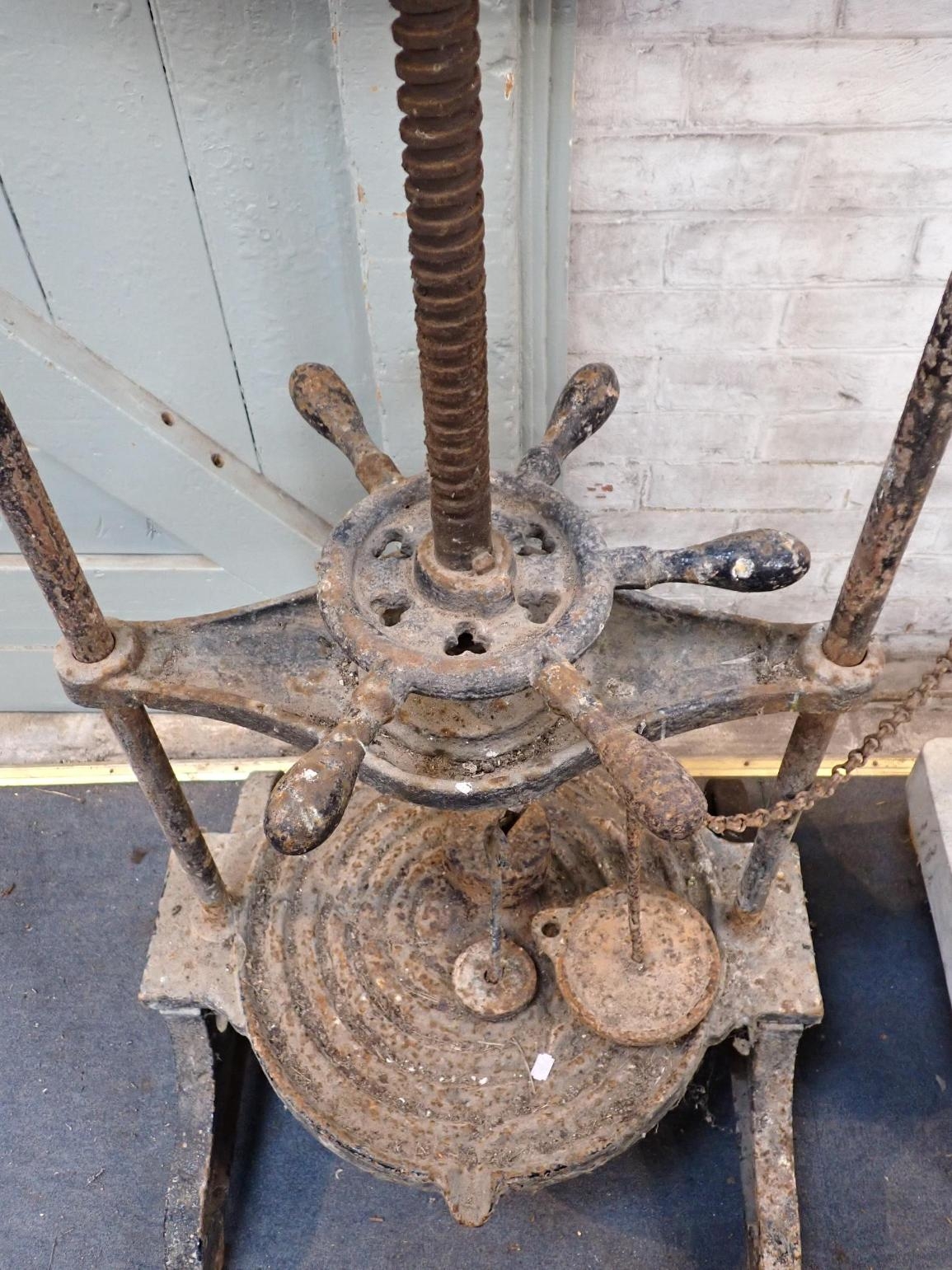 AN ANTIQUE CAST IRON CHEESE PRESSby J. Hibbert, Cardiff, 166cm high (barn stored condition; one spoke handle broken and missing)