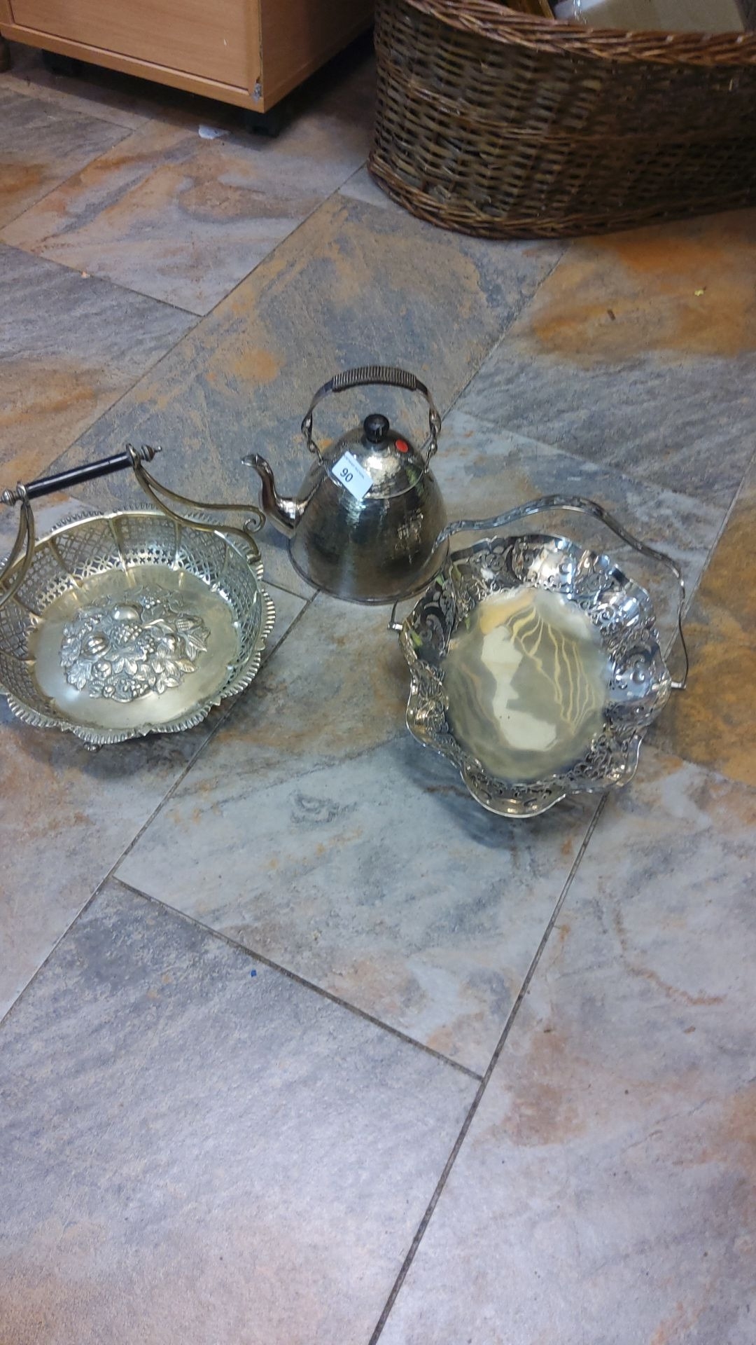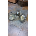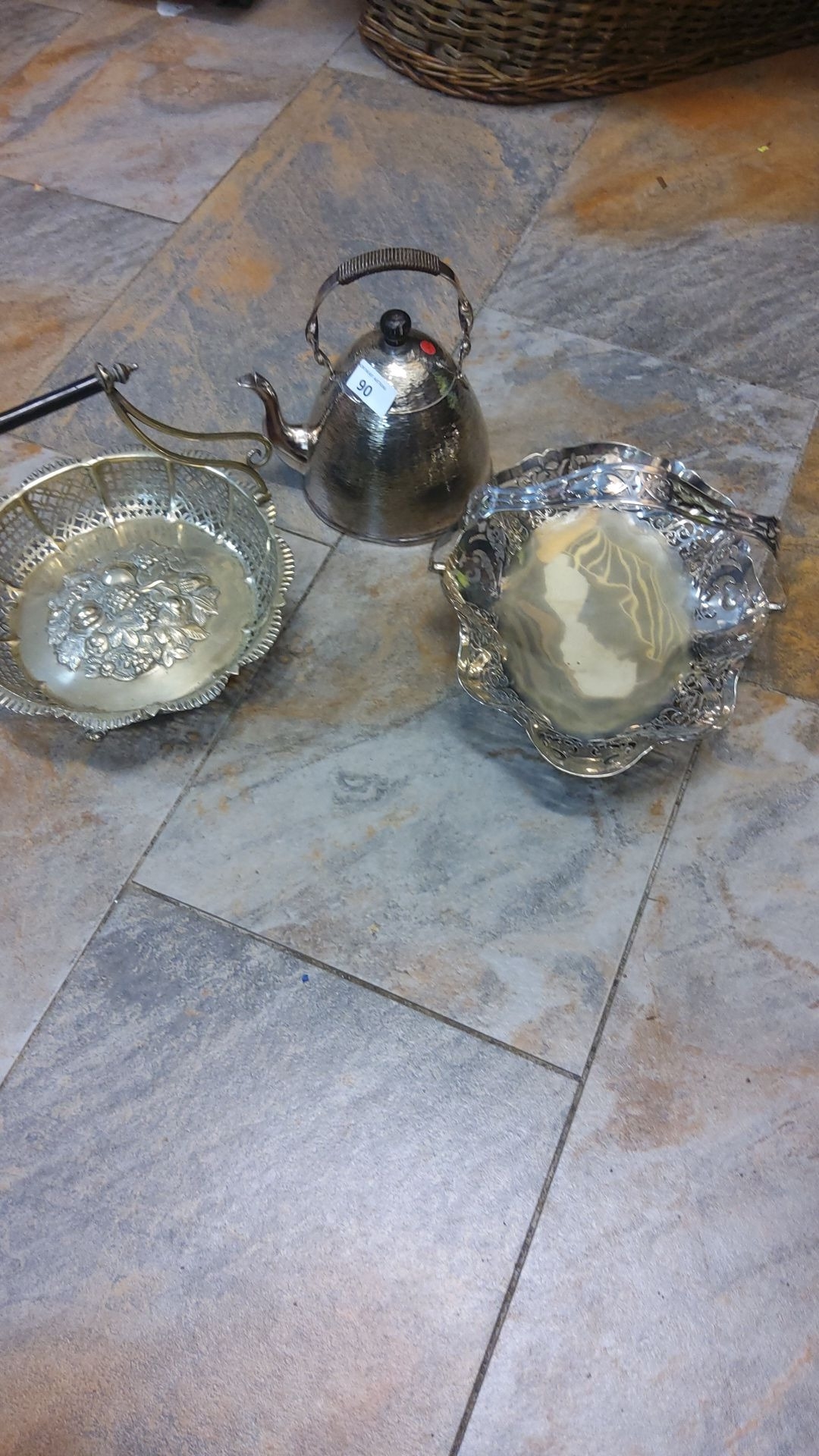 Silver-plated set including a decorative tray, pierced basket with handle, and ornate teapot with distinctive floral and lattice designs.