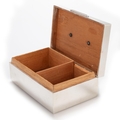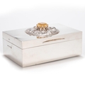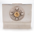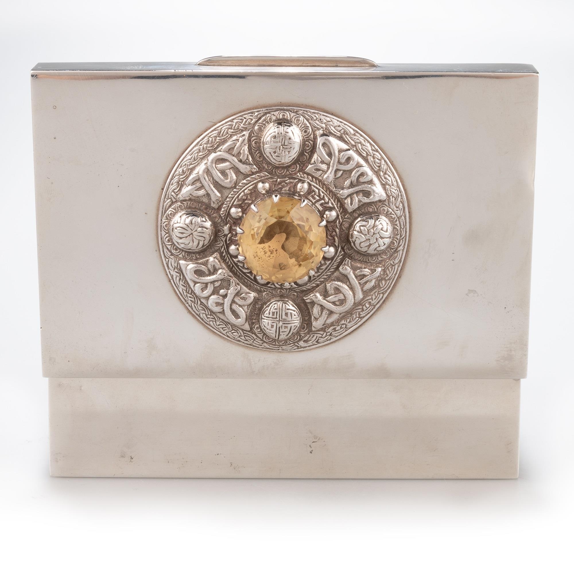 by Padgett & Braham Ltd, London 1953, retailed by A & J Smith, Aberdeen, the hinged rectangular cover, applied with Scottish-style decoration, a citrine or 'Cairngorm' type gemstone within Celtic knotwork and bosses, enclosing a cedar-lined interior of two compartments, weighted. 14cm wide