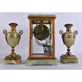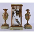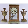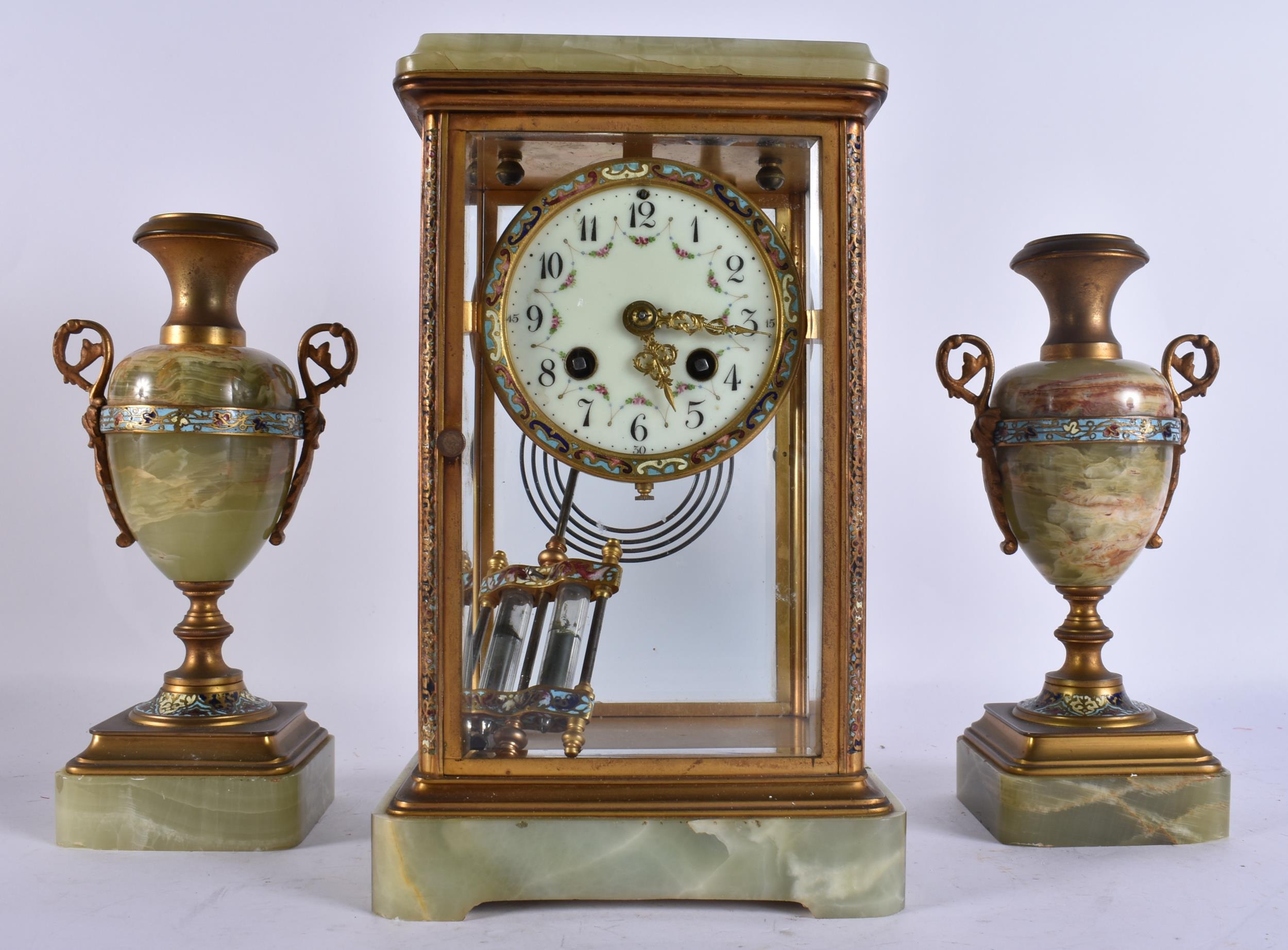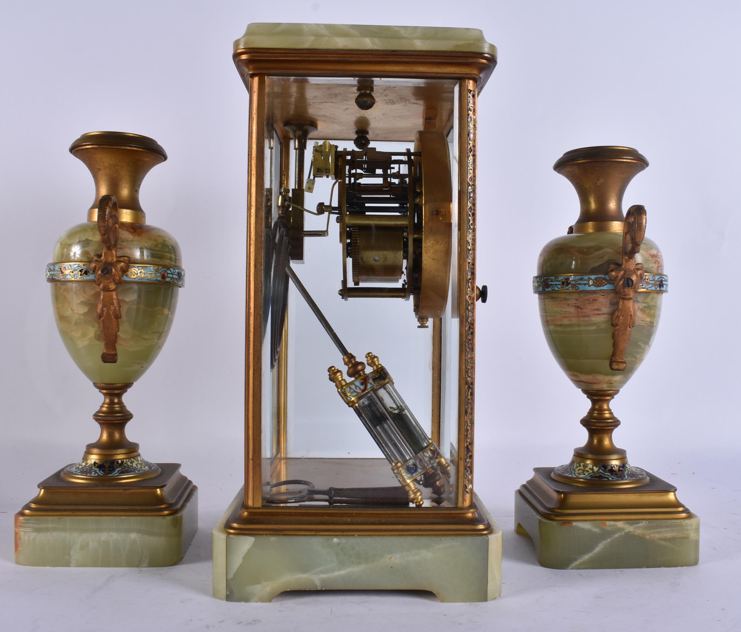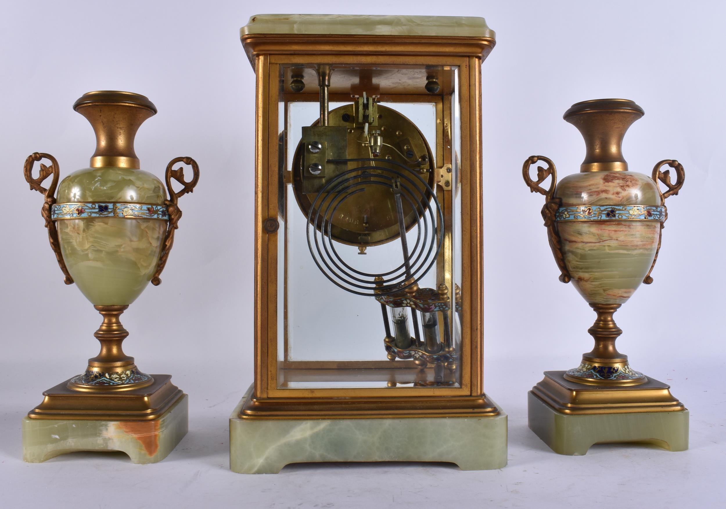 AN EARLY 20TH CENTURY FRENCH BRONZE AND CHAMPLEVE ENAMEL ONYX CLOCK GARNITURE. Mantel 27 cm x 13 cm. (3)