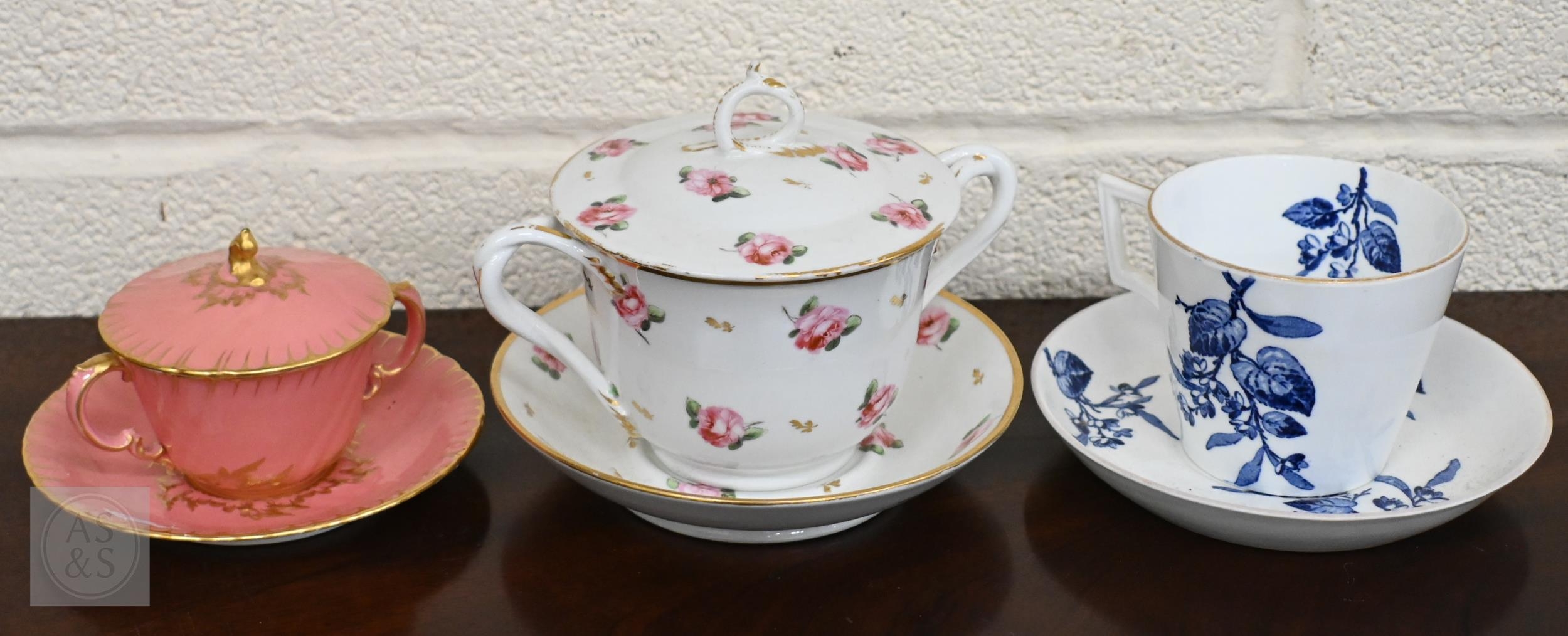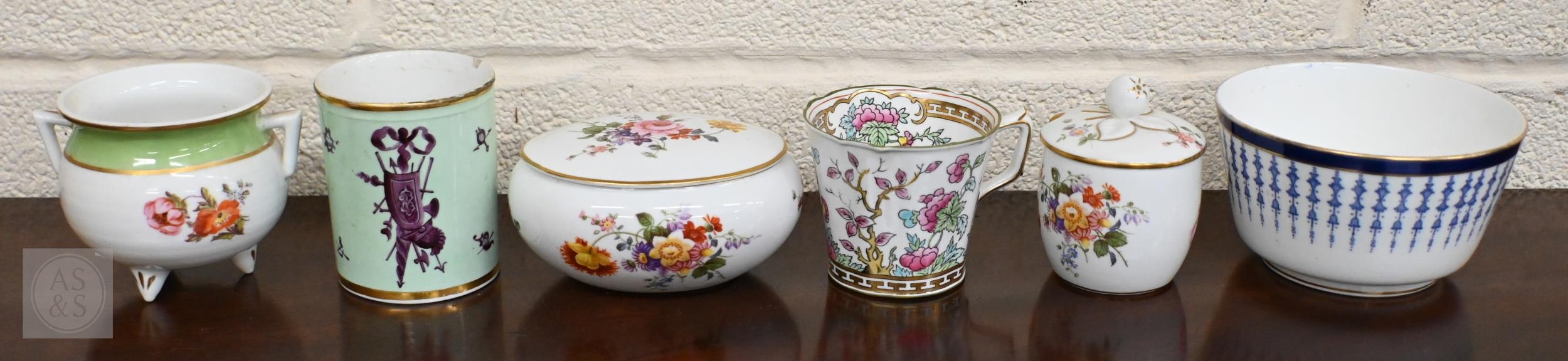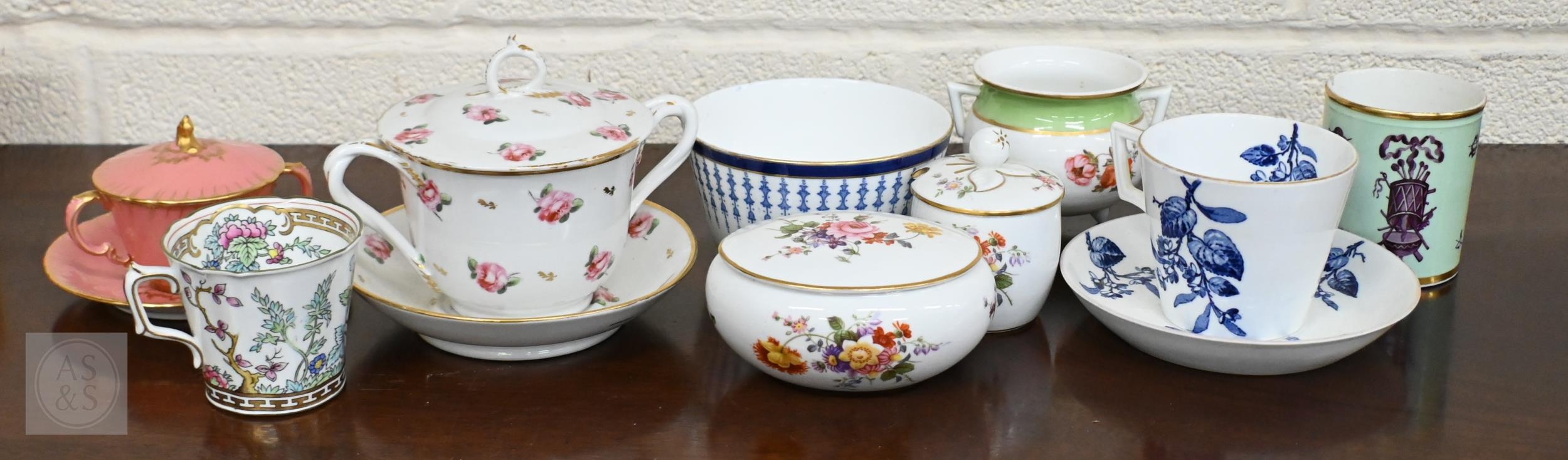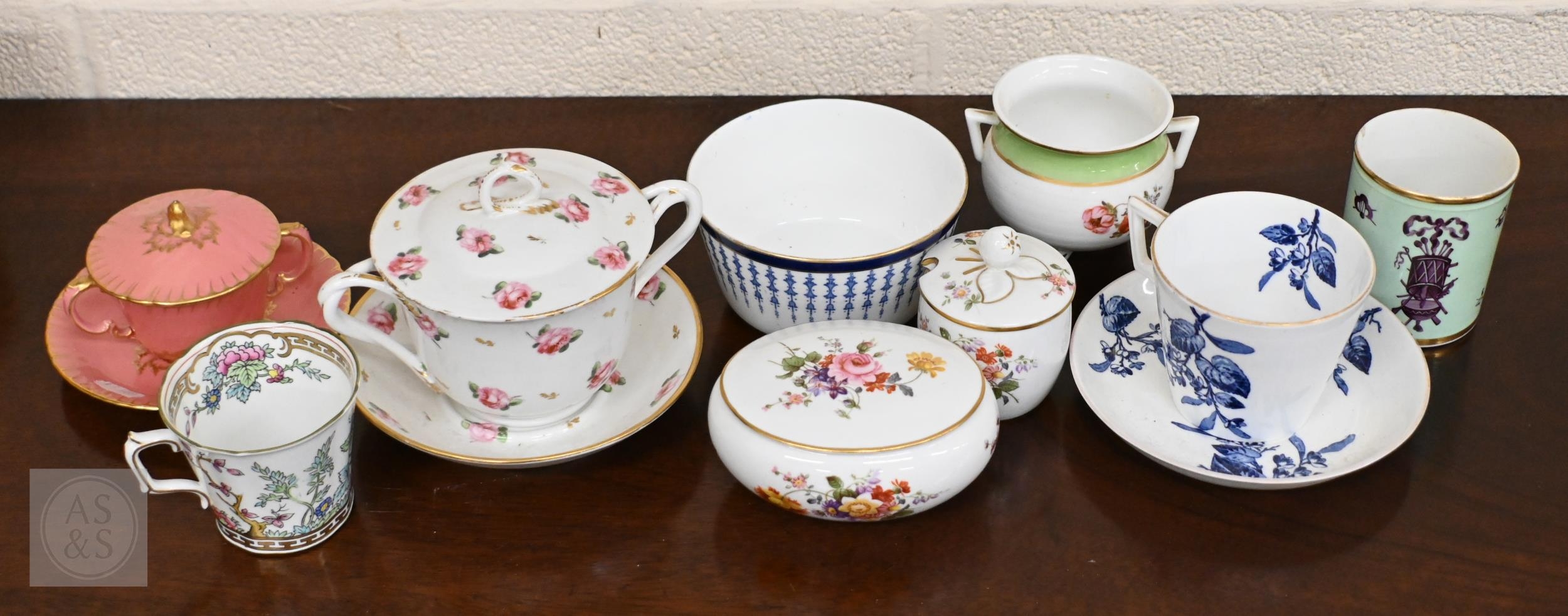 An early Victorian Stevenson & Hancock Derby twin-handled cup and cover painted with roses to/w a Victorian Royal Crown Derby pink and gilt example, a Georgian Duesbury cylindrical pot painted with puce military trophies on a pale green ground and various other Victorian and later Royal Crown Derby (box)
