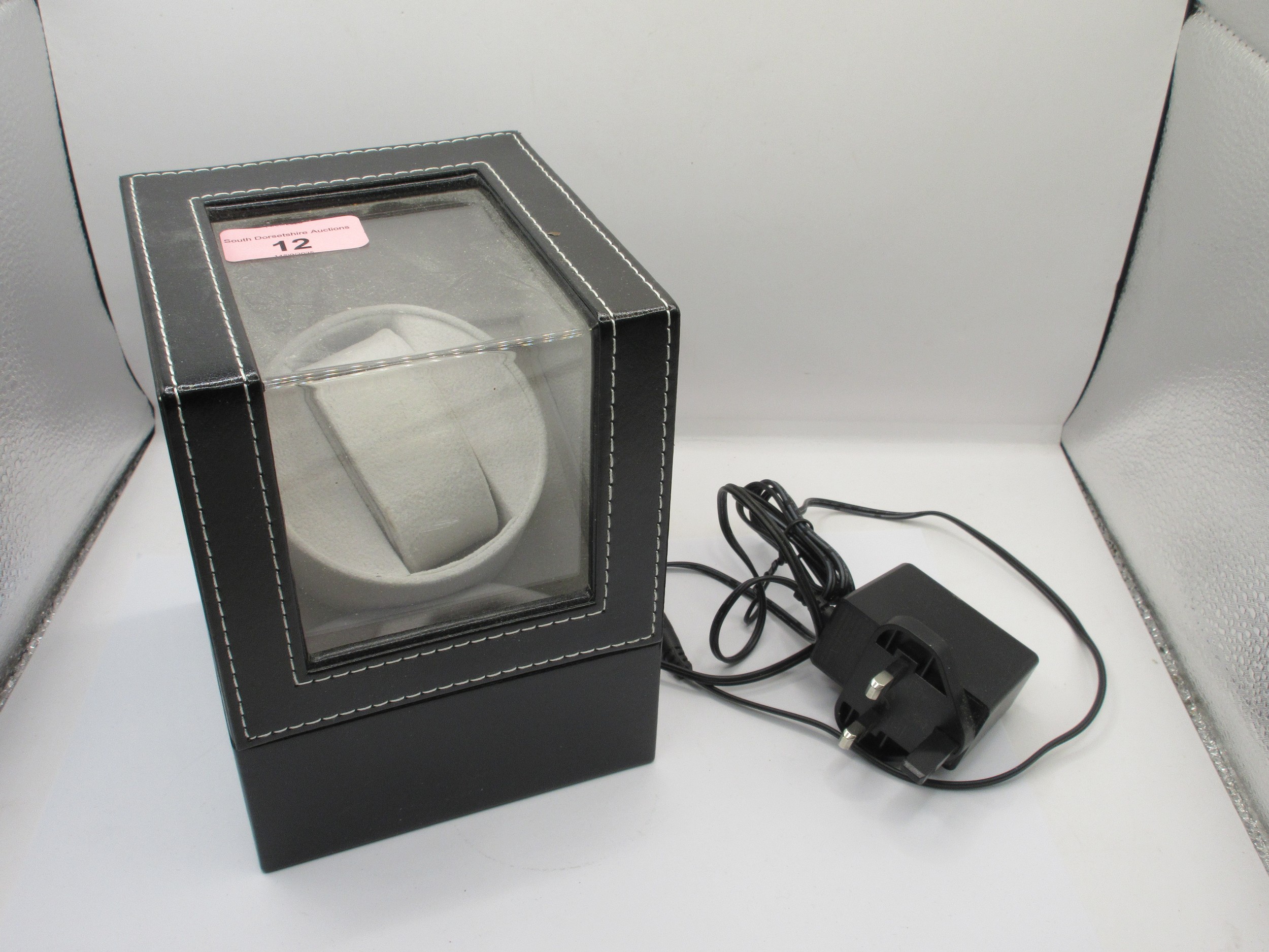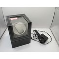 An automatic watch winder, black leather effect finish and grey interior. With power adaptor