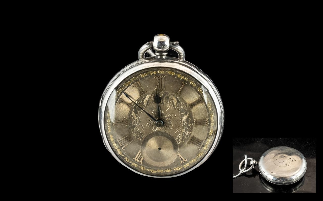 Mid Victorian Period Large and Impressive Sterling Silver Fusse Driven Open Faced Pocket Watch, With Ornate Silver Dial and Gold Markers + Secondary Dial, Dial, Movement and Case Excellent Condition - Please Confirm with Photo.