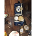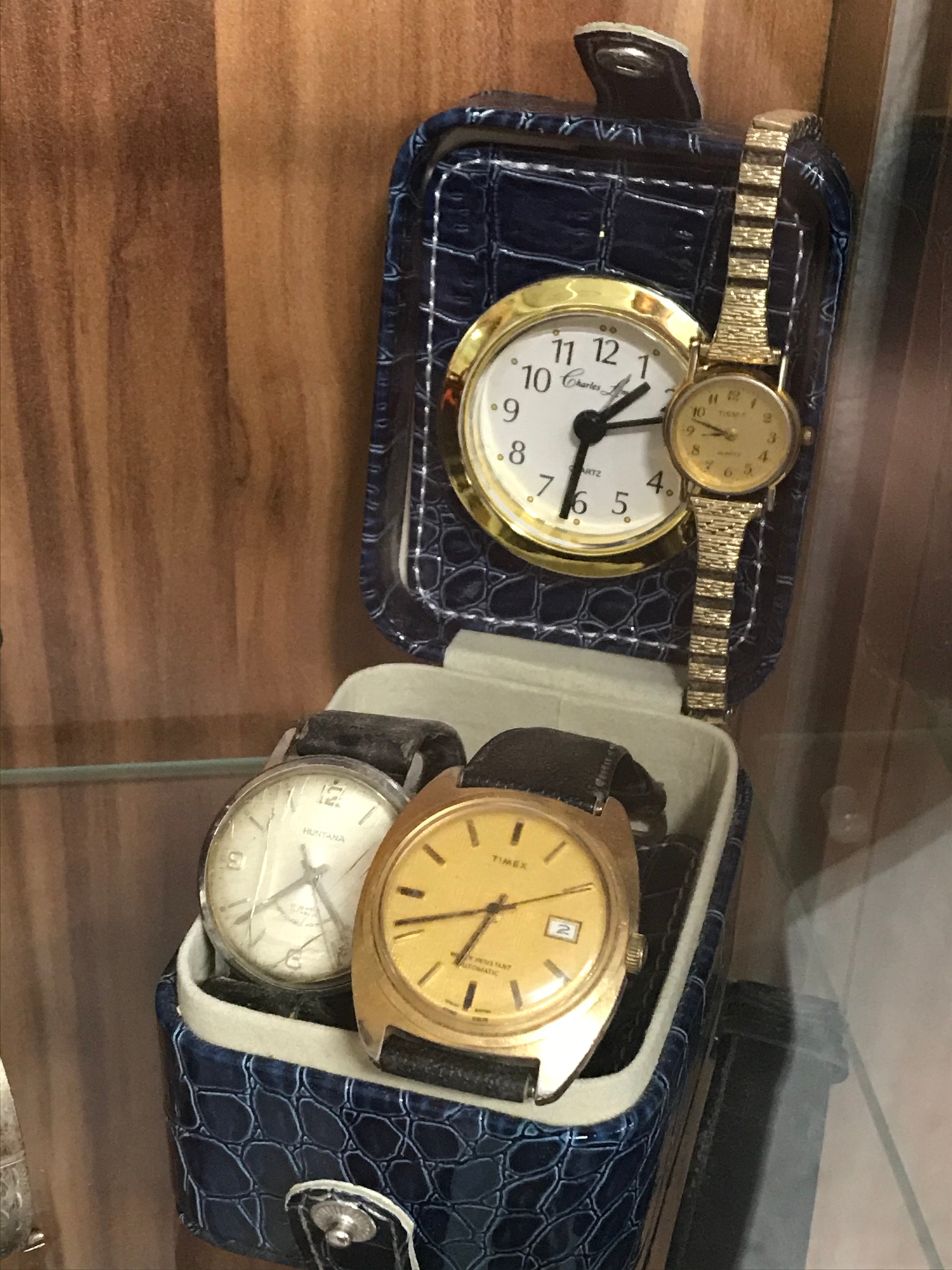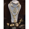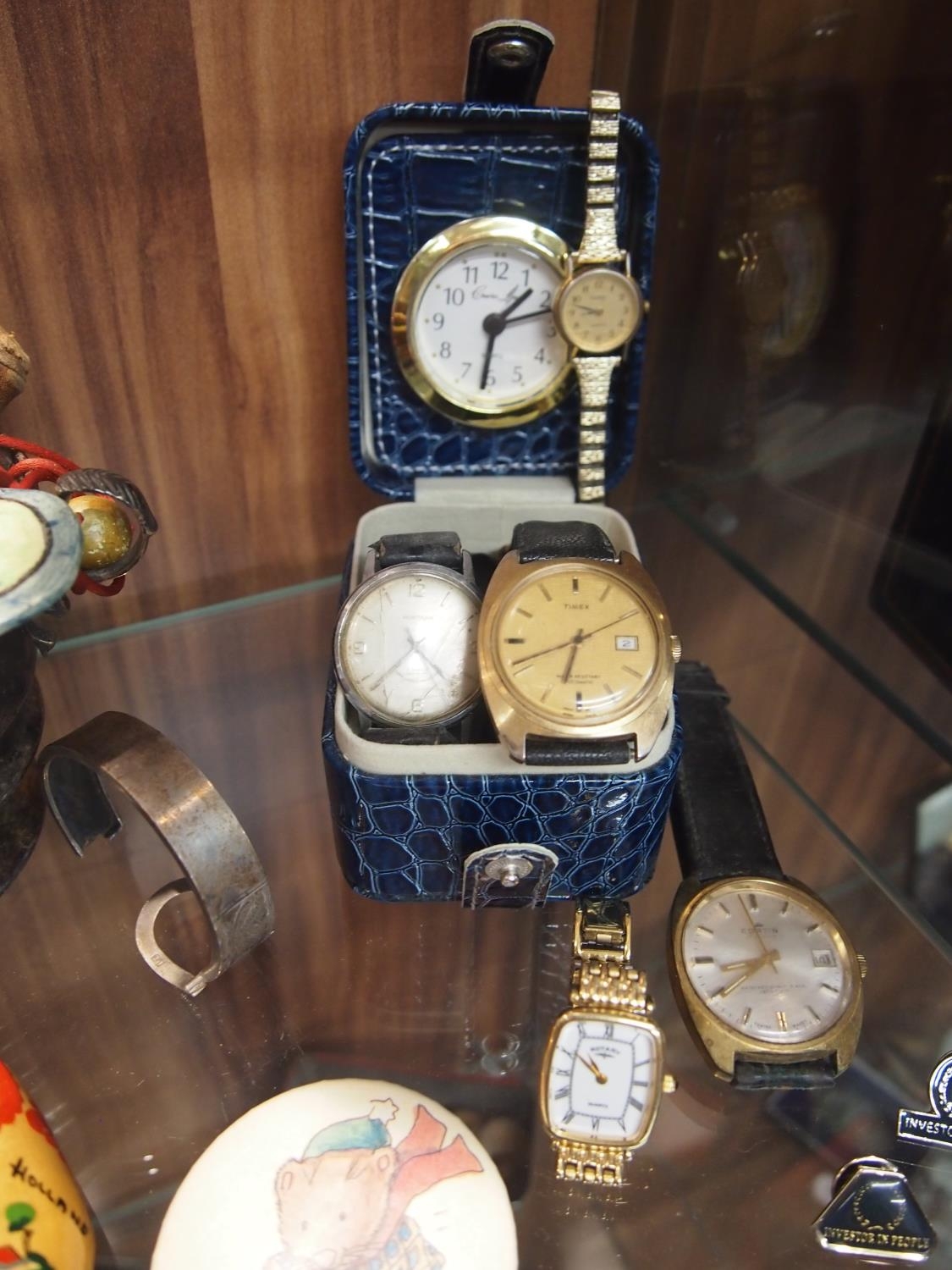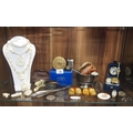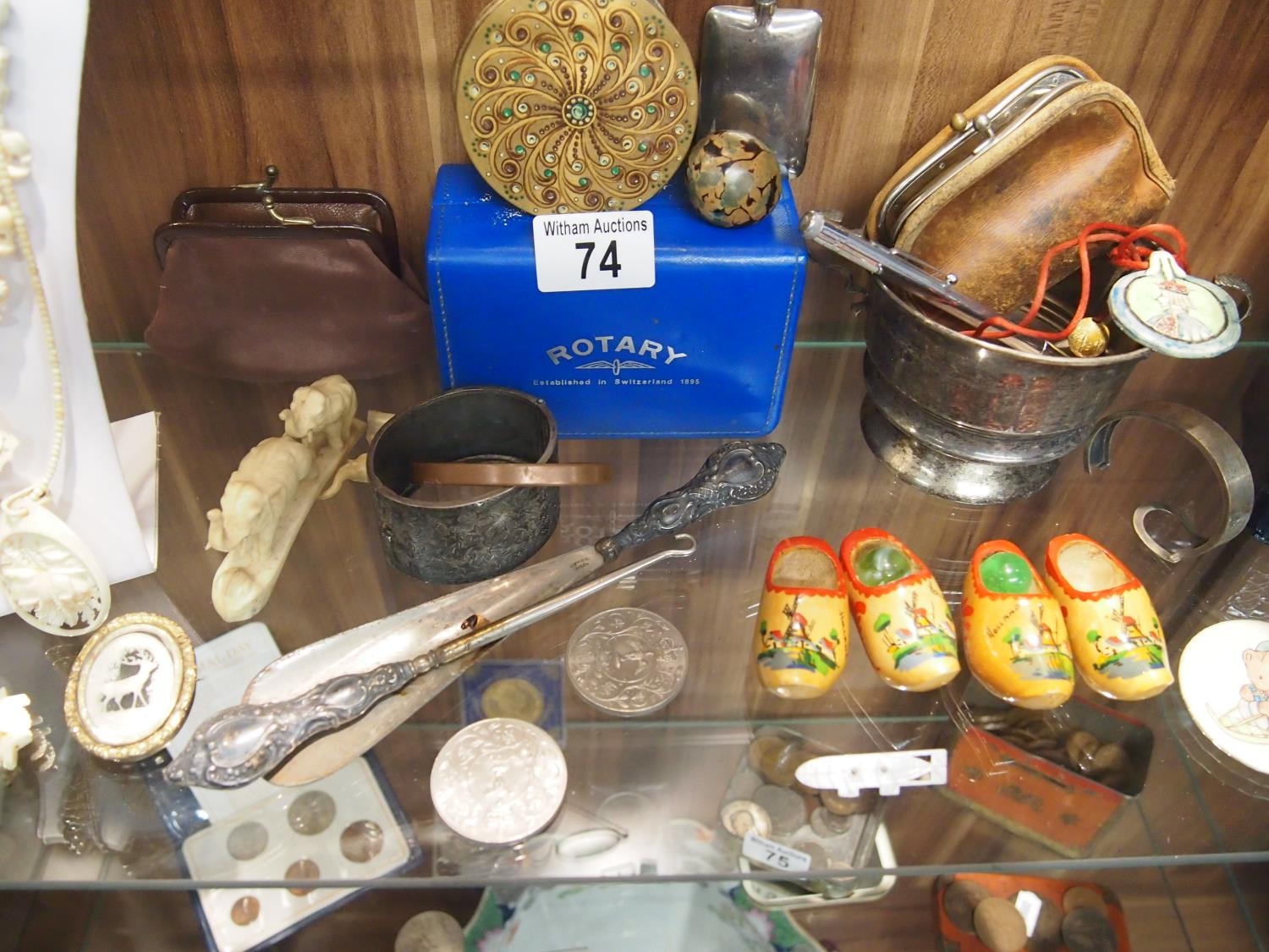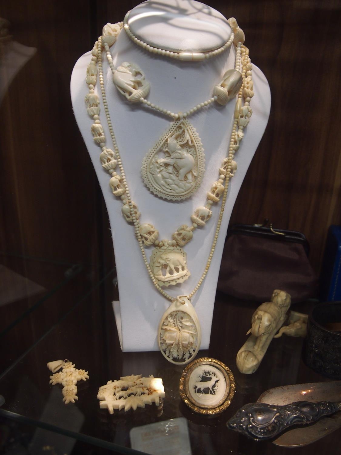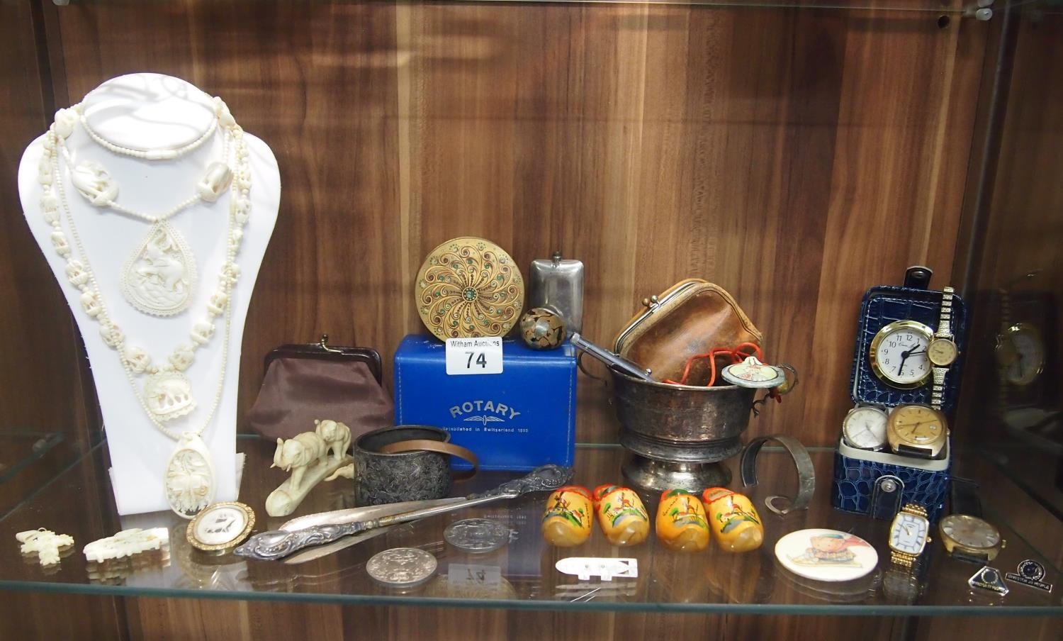 Three vintage gentleman wrist watches plus two lady's wrist watches, various hand carved necklaces and brooches depicting elephants, deer, and floral patterns plus other silver plate retro items