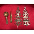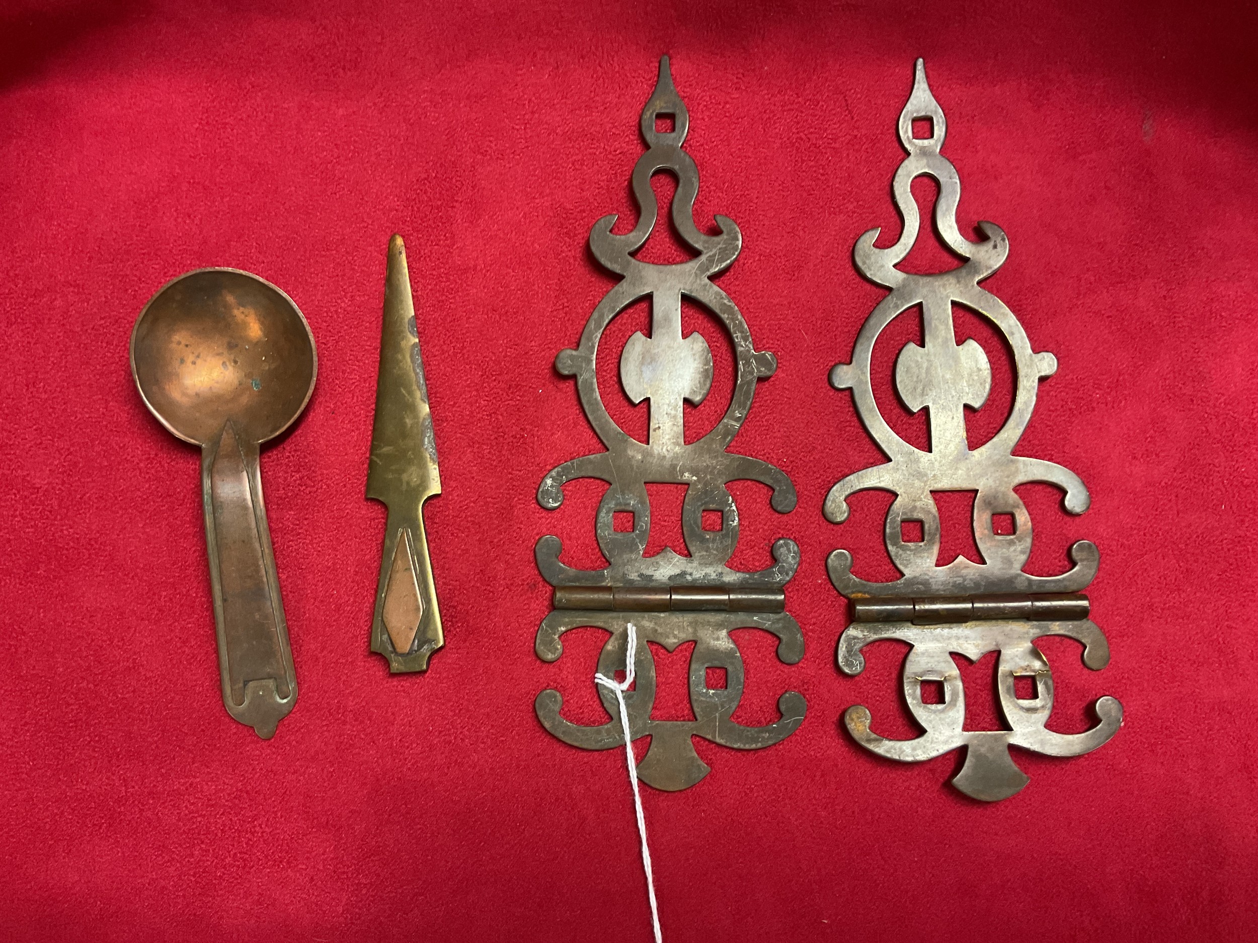 A pair of vintage brass hinges, a copper ladle spoon and a letter opener
