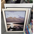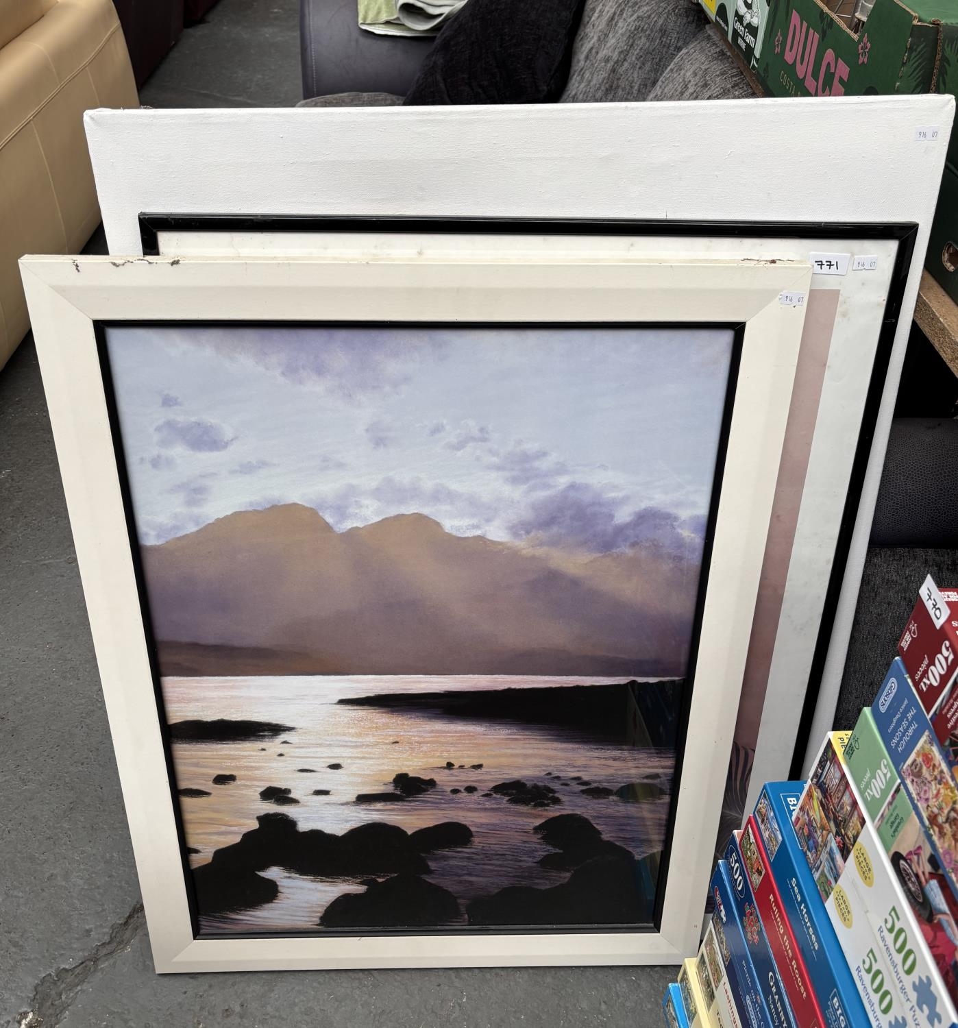 Blank canvas and 2 framed and glazed artworks including Japanese trumpet flowers