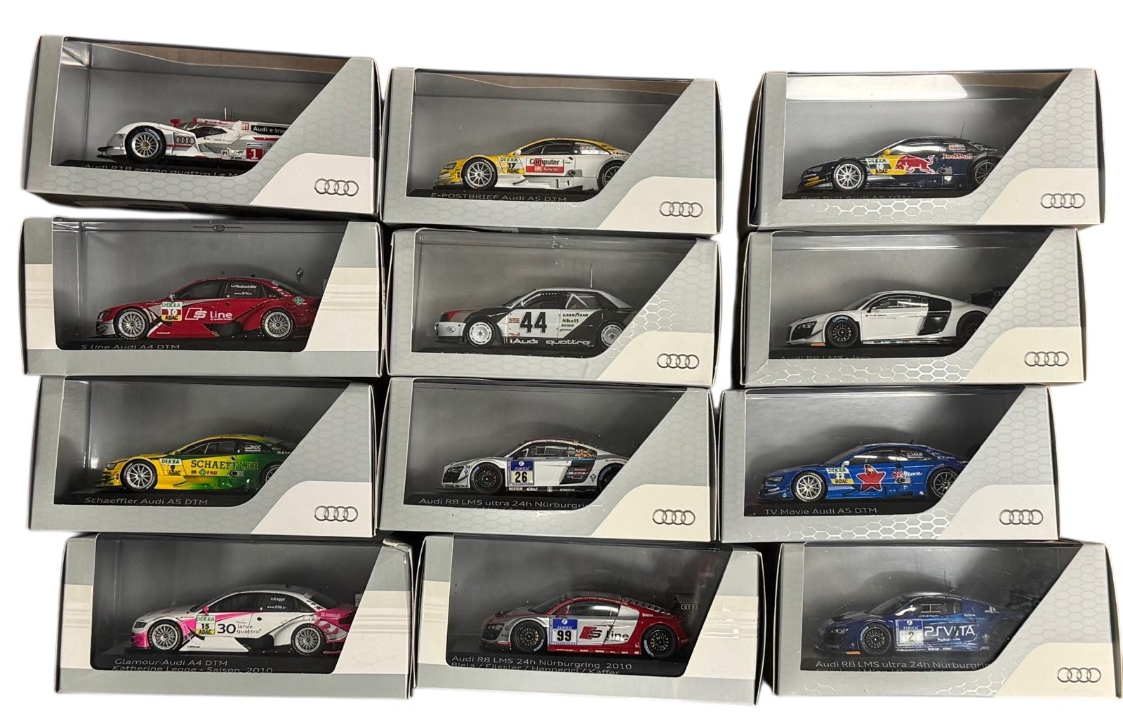 Audi Collection 1/43rd scale motorsport collection, official licensed models, generally excellent in excellent to good plus plastic cases and card outer sleeves, including A4, TT, R8, etc. Contents appear complete but unchecked. Viewing recommended. Qty 12