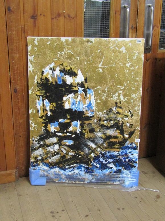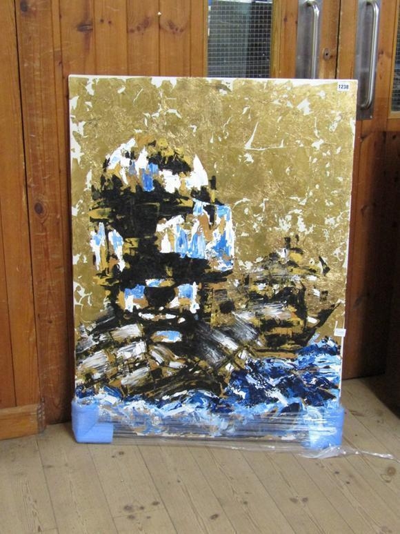 ELMO HOOD - EVERYTHING I LOVE IS OUT TO SEA, OIL ON CANVAS WITH GILT HIGHLIGHTS, 105CM X 76CM