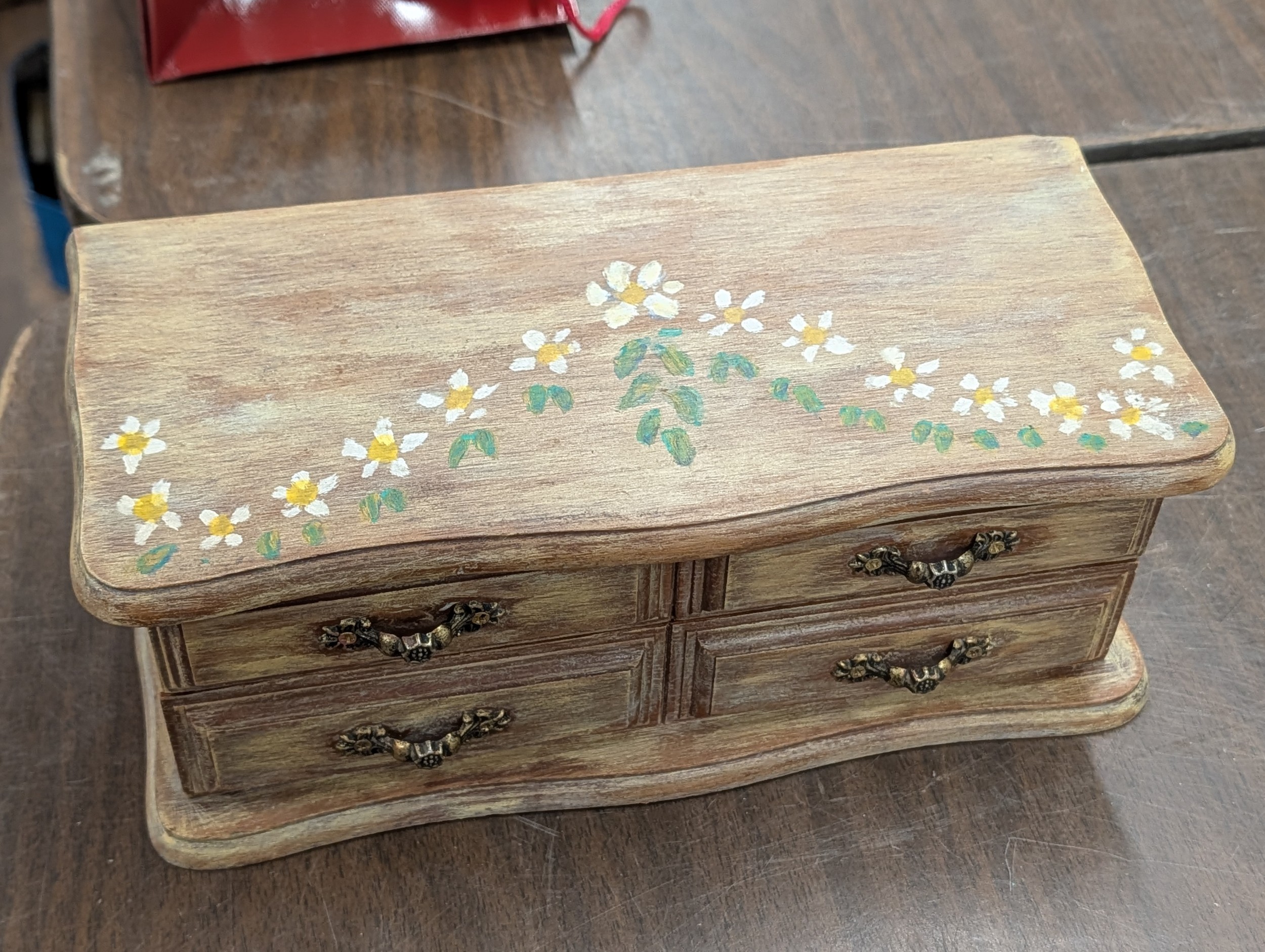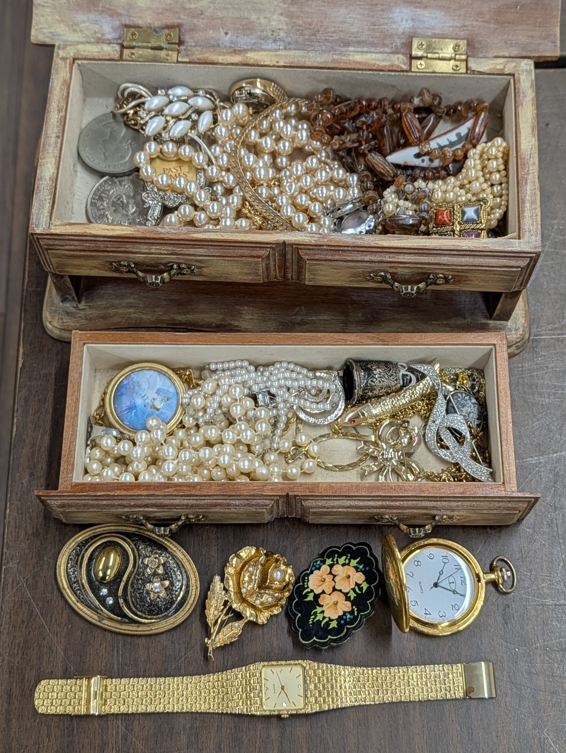 A Collection of Vintage Costume Jewellery and Watches in a Hand-Painted Wooden Box