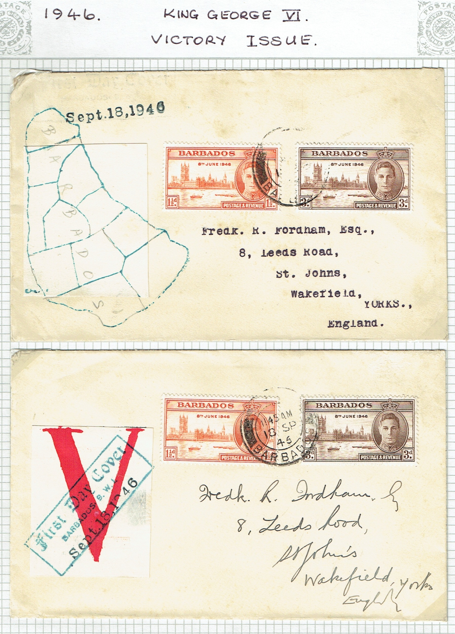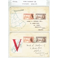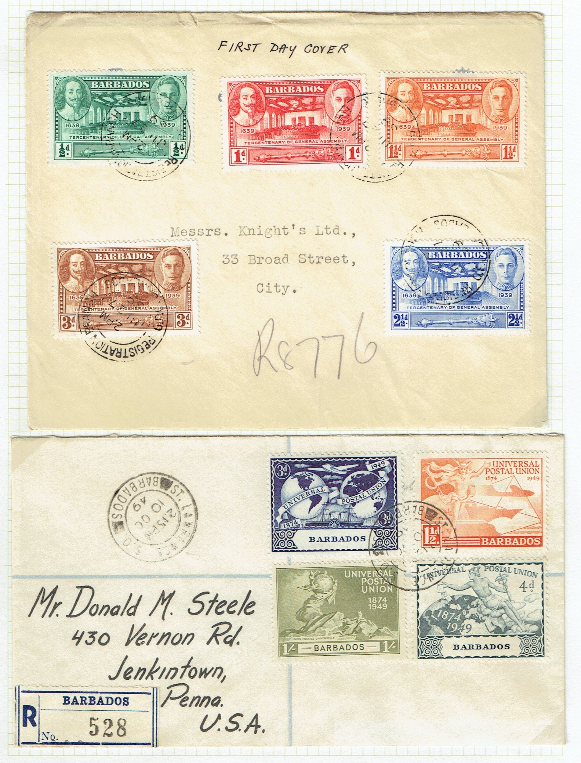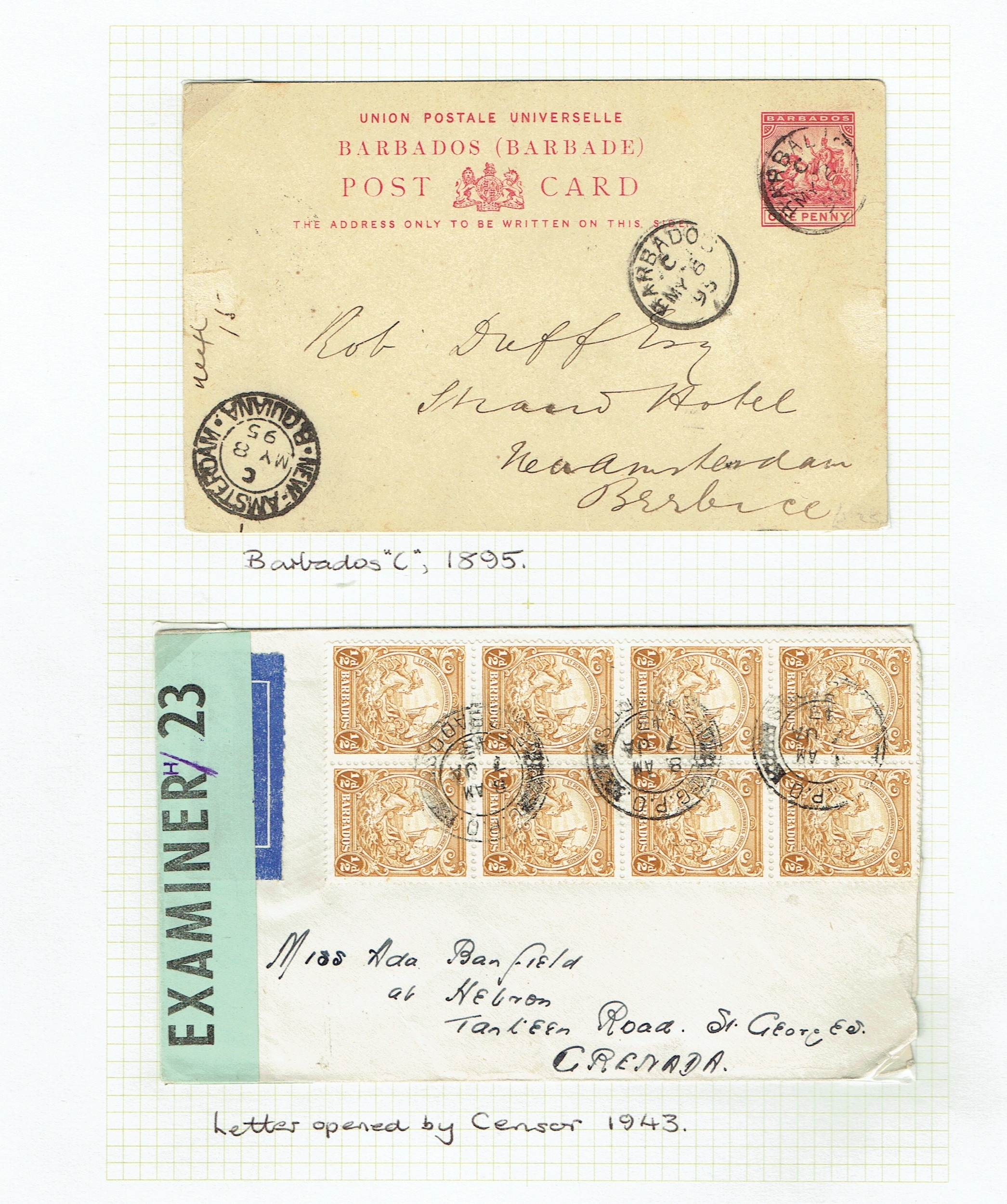 BARBADOS - Postmarks and postal history small but useful collection including QV-QEII postmarks noted St Philip, Welches Road, 1937 KNSM MS Columbia boxed d/s, St Lucy, St John, St Peter, St Lawrence, QV Britannia's Bridgetown numeral 1, Christchurch No.2, 1943 Censored cover to Grenada with Green Examiner H/23 green sealing label, 1949 UPU regd cvr, 1946 Victory hand made illus covers (2), 1950 $2.40 on regd cvr, two 1905 PPCs to UK bearing ½d green, few ship mail. (25 covers, 75+ pmks).