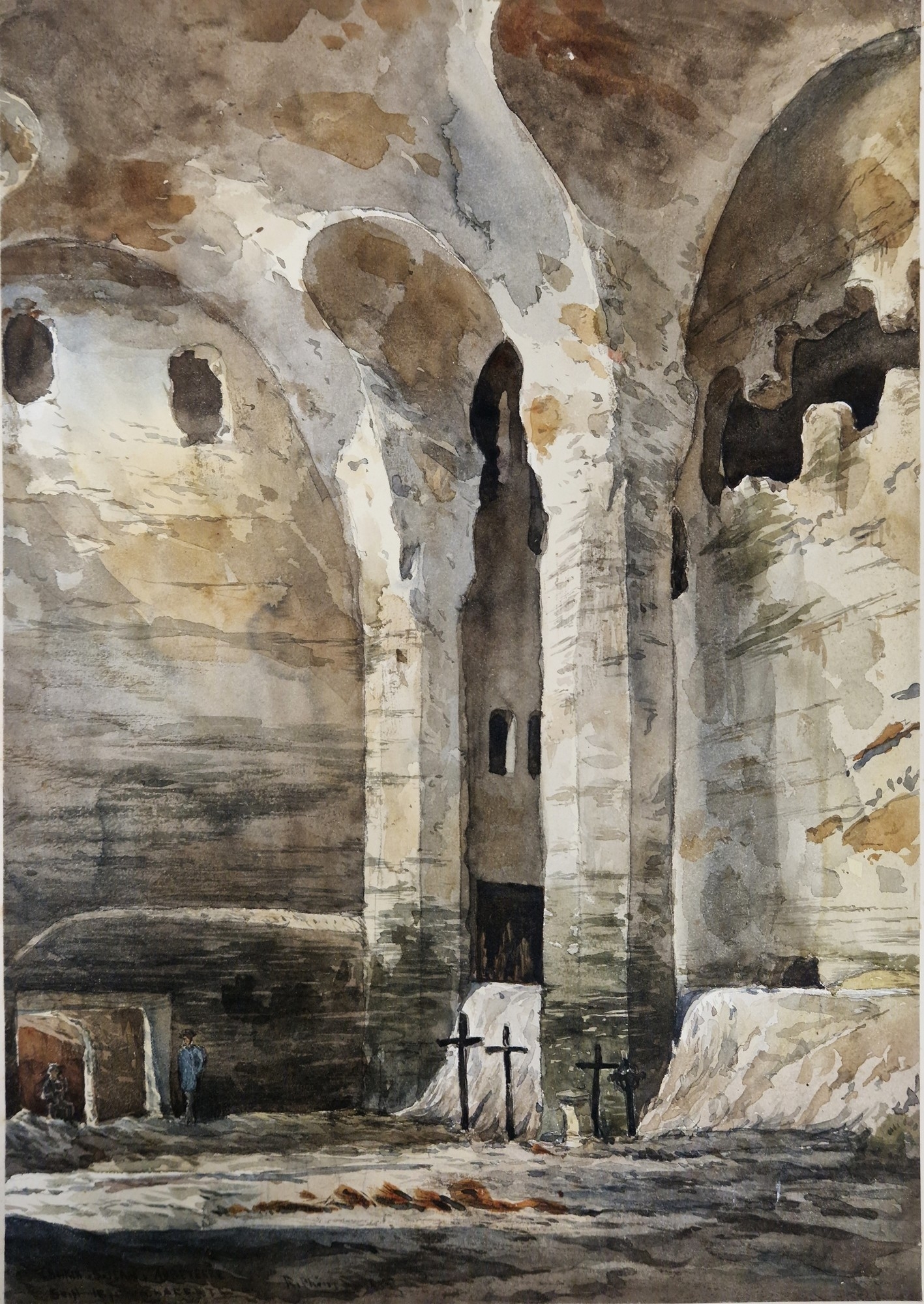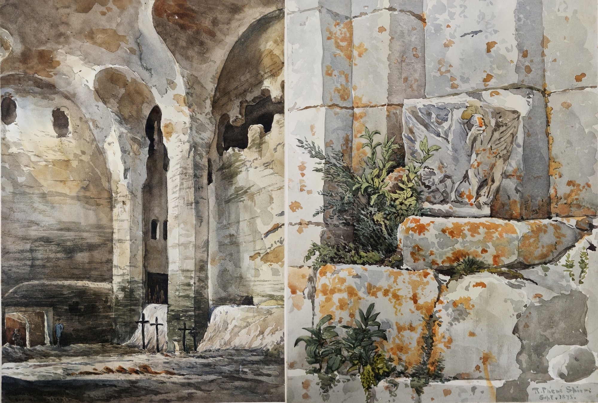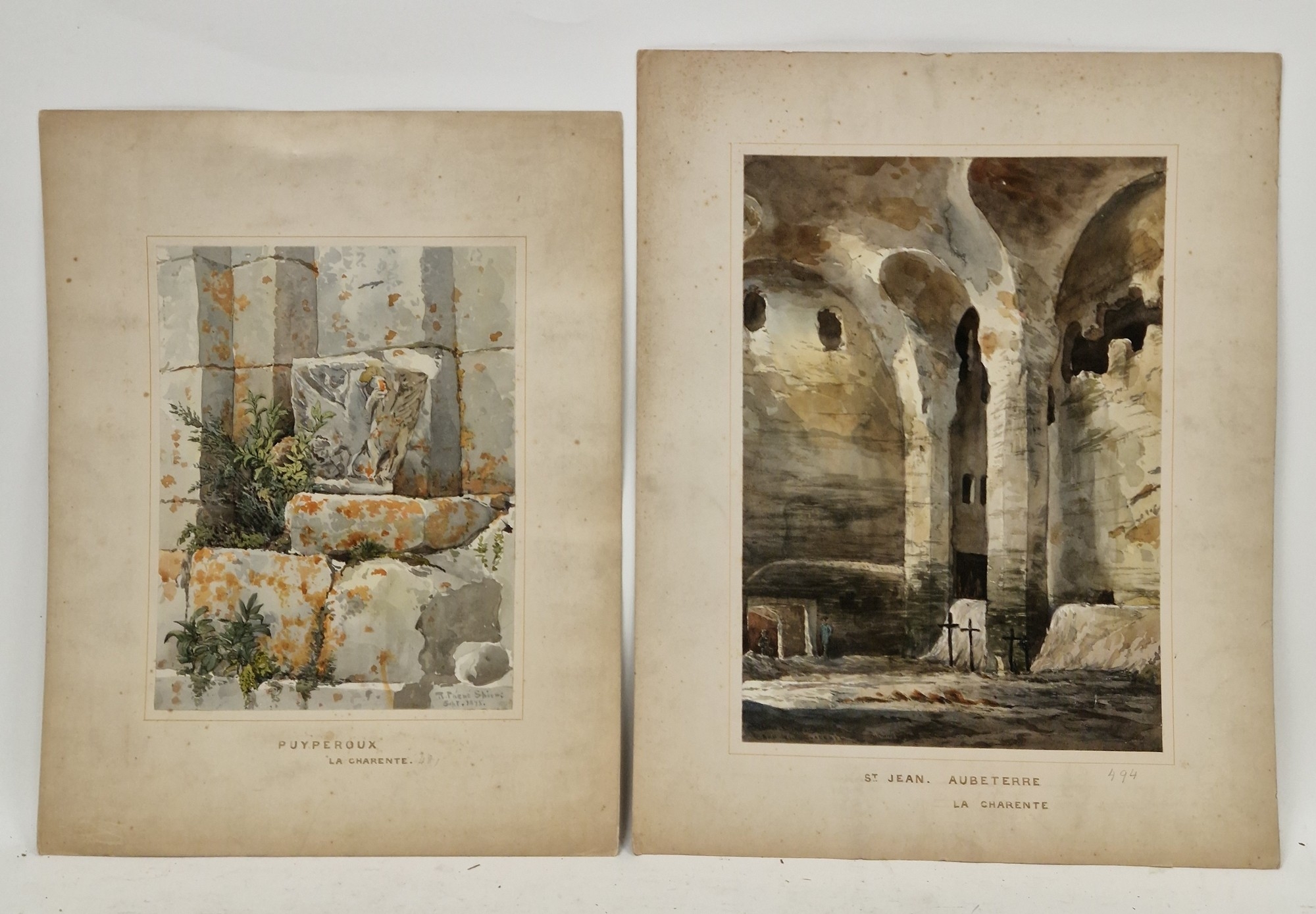 "Puyperoux, La Charente", study of stone building exterior, signed and dated September 1875 lower right, unframed but mounted on card, 29.5cm x 22.5cm, together with another watercolour by the same hand, "St. Jean, Aubeterre, La Charente", interior study of the monolithic church, signed, titled and dated 1875 lower left, unframed but mounted on card, 37.5cm x 26cm (2)