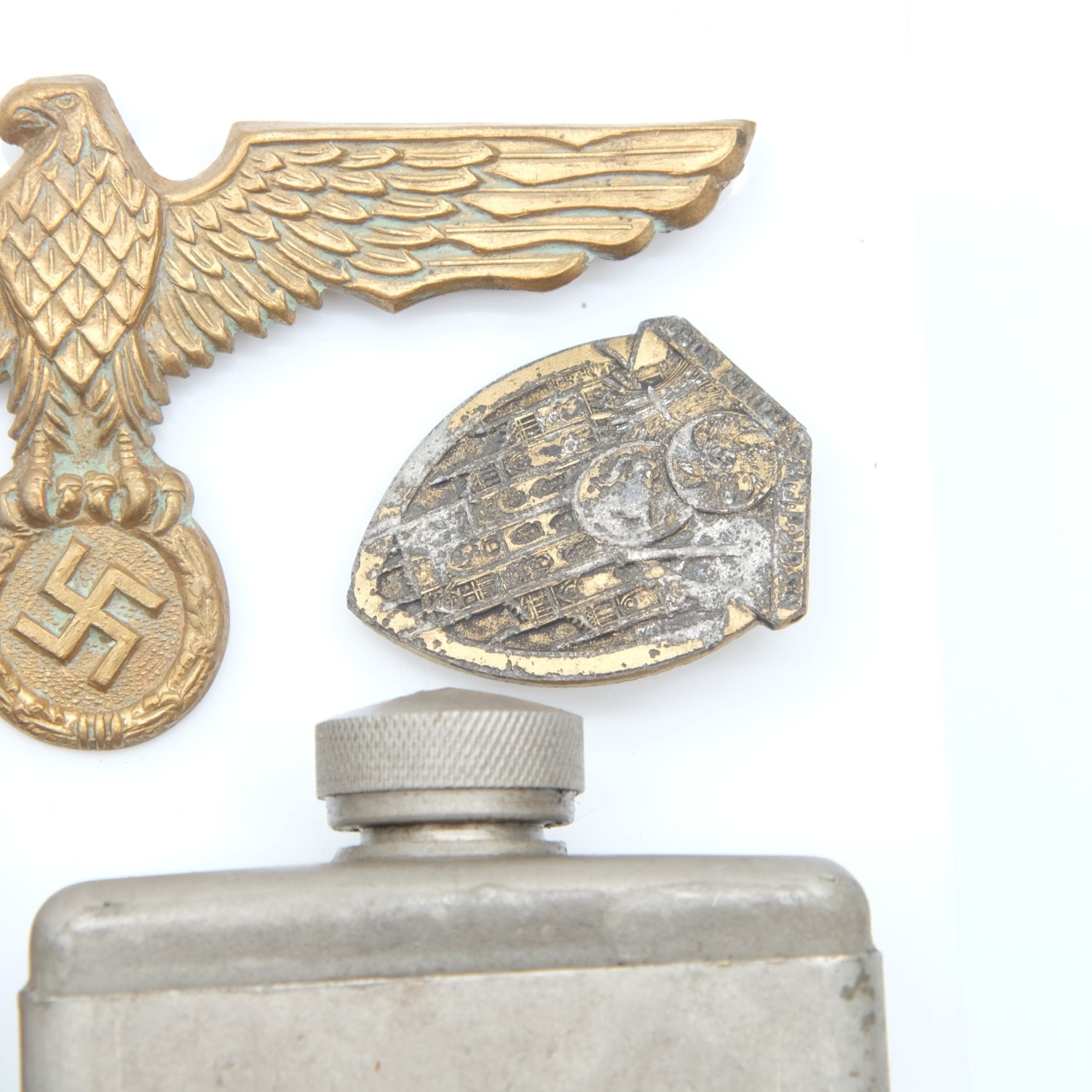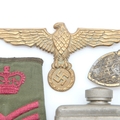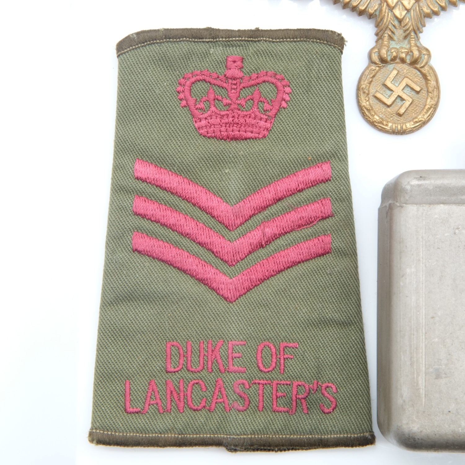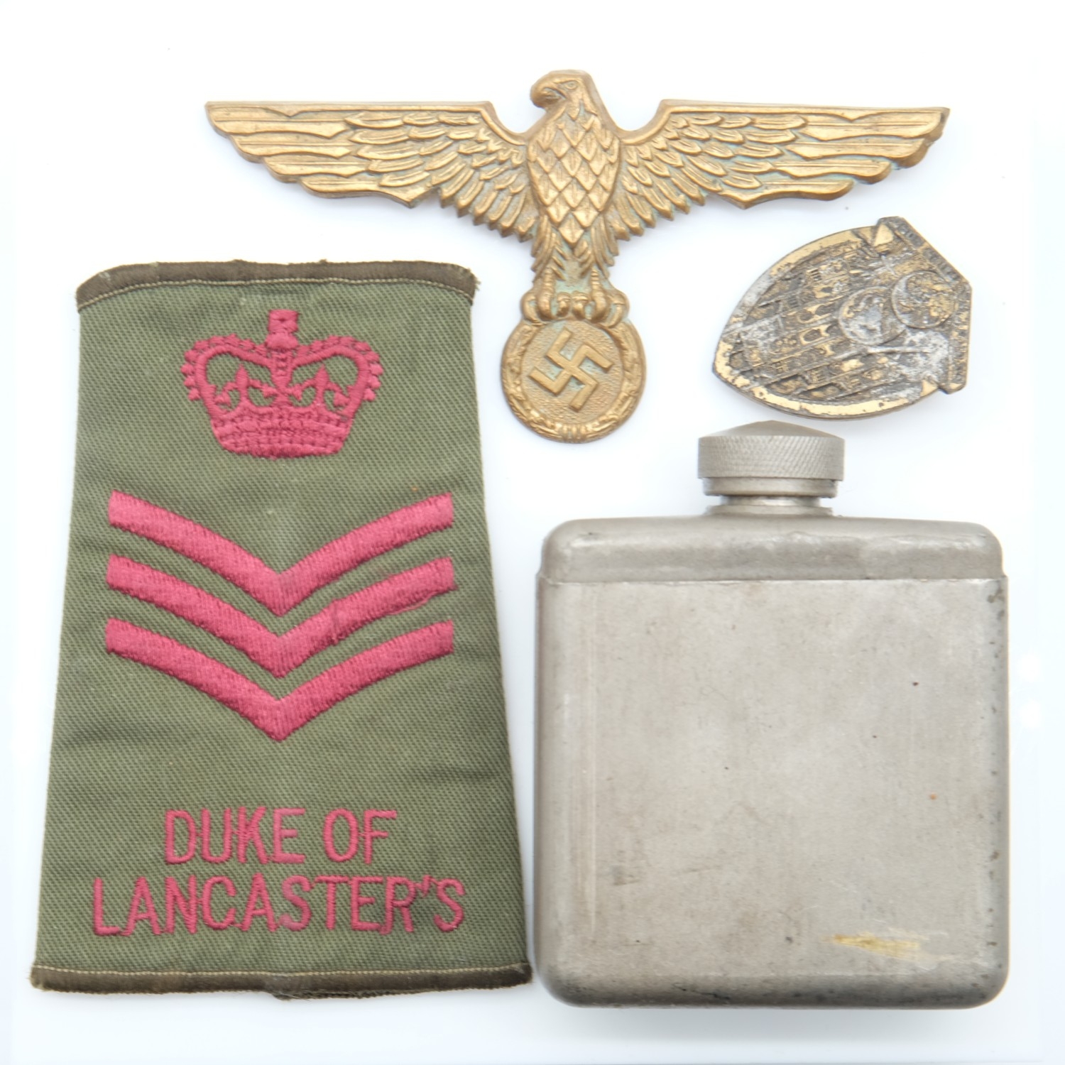 Kriegsmarine tunic breast eagle with a gau badge in semi-relic condition, a Military gun oil bottle with brush to cap marked BE./6167 with crows foot and J&O 1952 and a Duke Of Lancasters sergeant stripes. UK P&P Group 1 (£18+VAT for the first lot and £2+VAT for subsequent lots)
