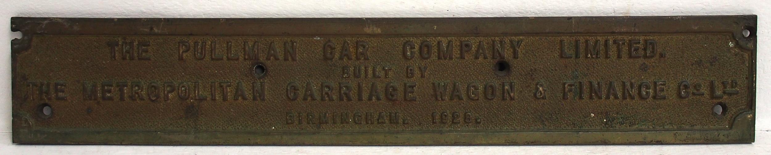 THE PULLMAN CAR COMPANY LIMITED BUILT BY THE METROPOLITAN CARRIAGE WAGON & FINANCE CO LTD BIRMINGHAM 1928 cast brass 24½"x 4 1/8", damage to top L/H bolt hole. (A3) (Dispatch by Mailboxes/Collect from Banbury Depot)