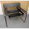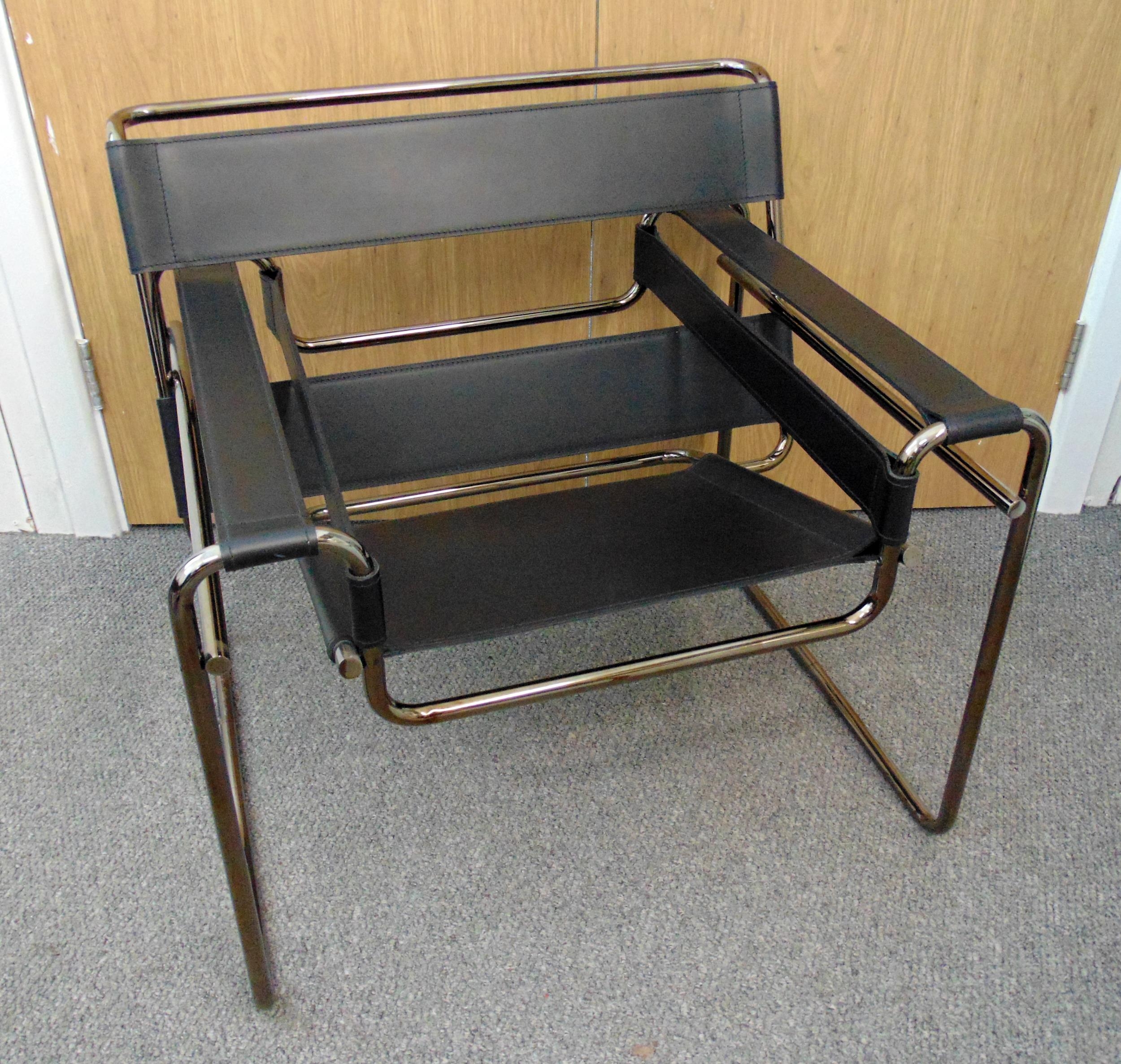 Knoll Wassily armchair designed by Marcel Breuer constructed of leather straps stretched across a tubular steel frame, originally inspired by the bends in a bicycle. It was the first chair of its kind in 1925, and it remains a celebrated symbol of modernism today