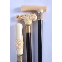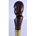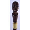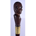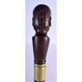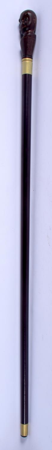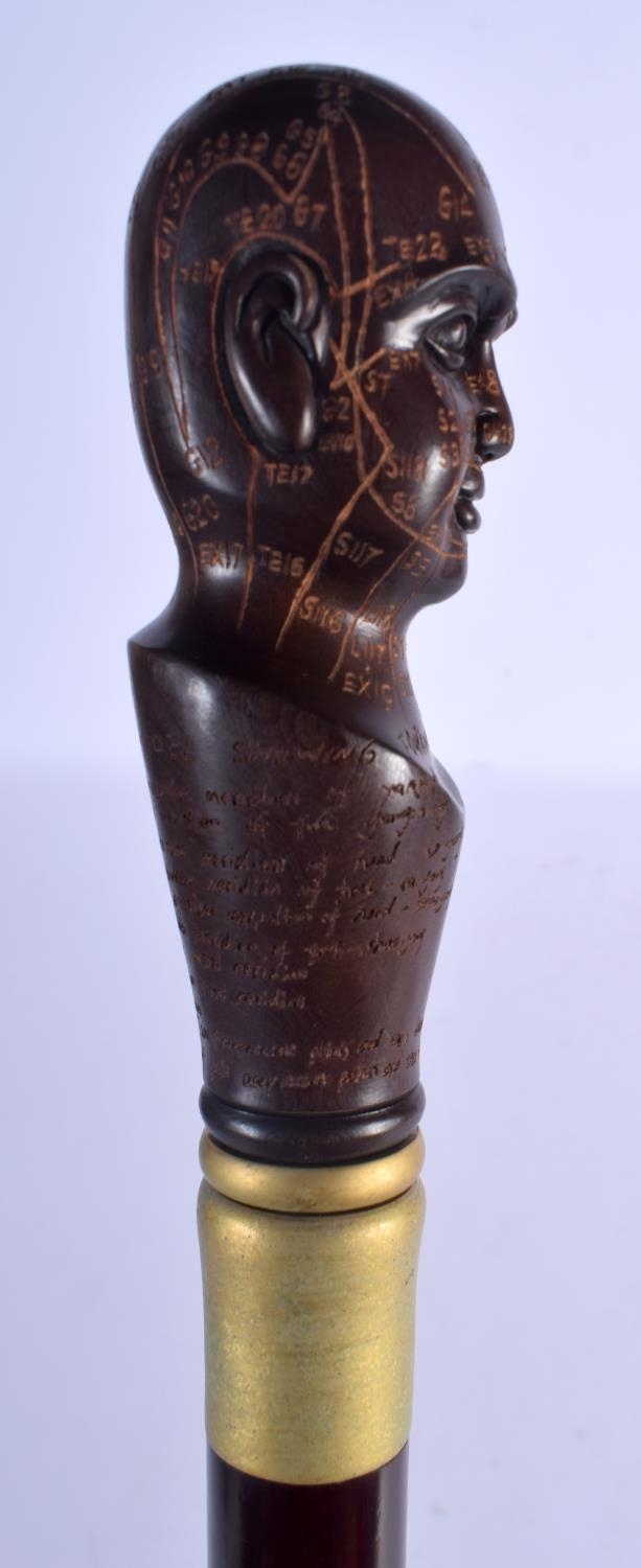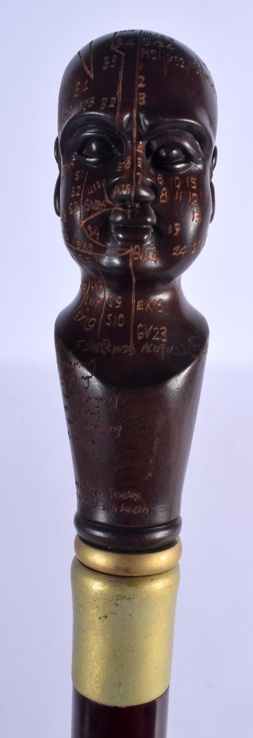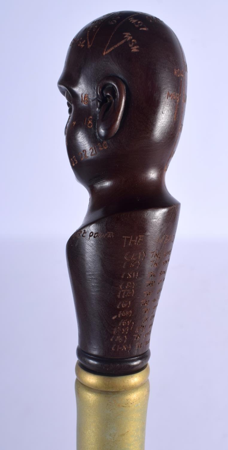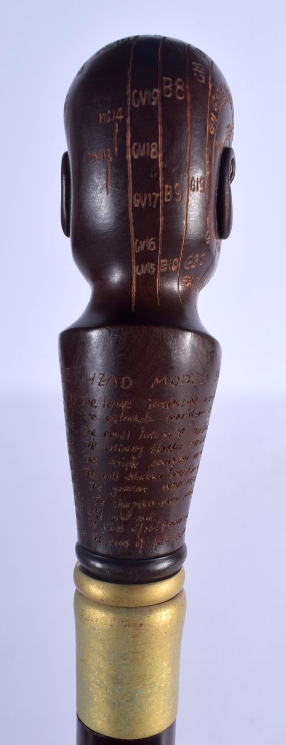 A CONTEMPORARY CARVED WOOD PHRENOLOGY HEAD WALKING CANE. 90 cm long.