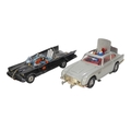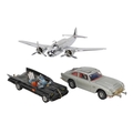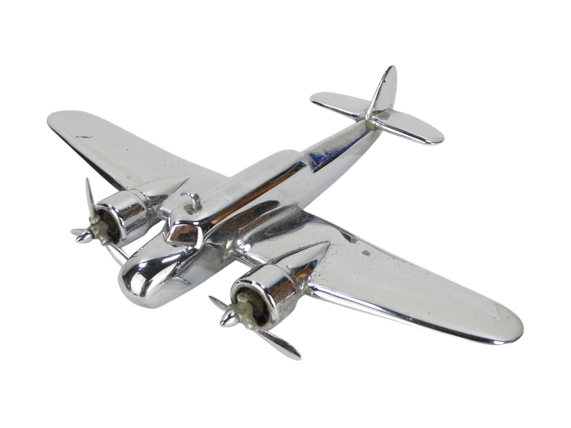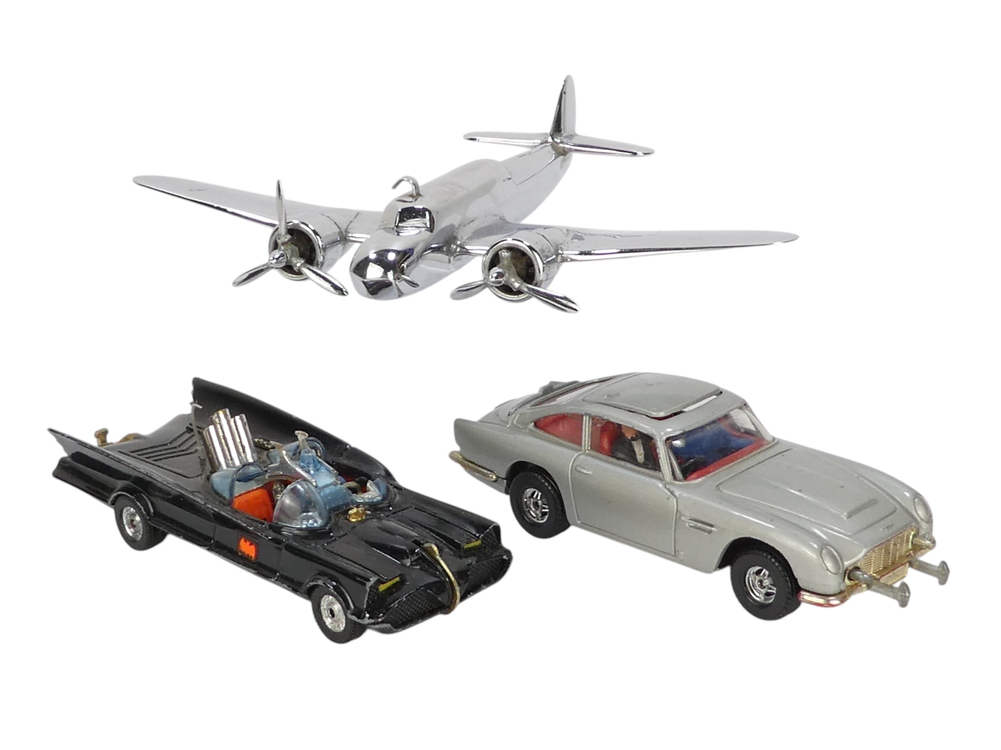 A chrome aircraft desk weight - modelled as a Bristol Beaufort, 15cm long, together with two Corgi cars.