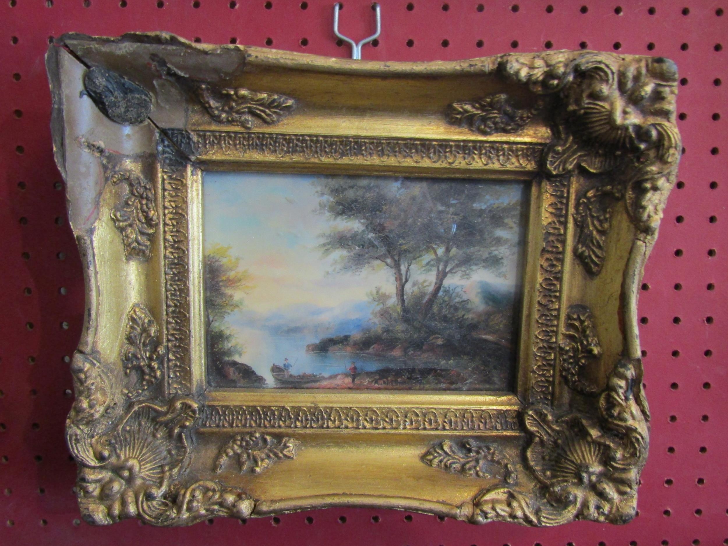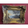 In the manner of Alexander Nasmyth (1758-1840) an ornate gilt framed painting, tree lined lake scene. Unsigned. 11.5cm x 16.5cm