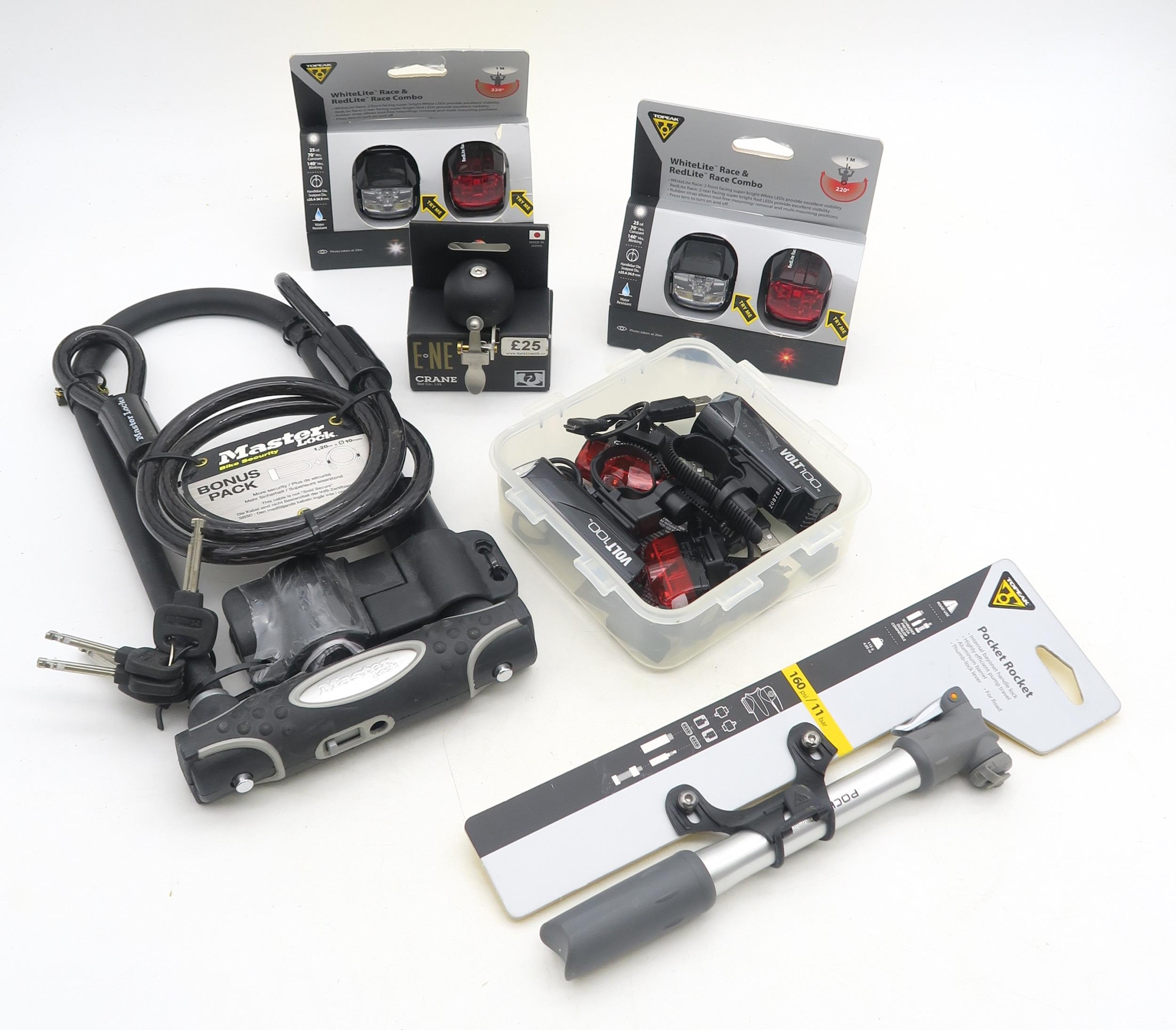 Bicycle equipment, consisting of Masterlock D-lock with cable, bell by Crane of Japan, two sets of Topeak WhiteLite/RedLight lights, Topeak Pocket Rocket pump, and two unpackaged sets of Cateye lights