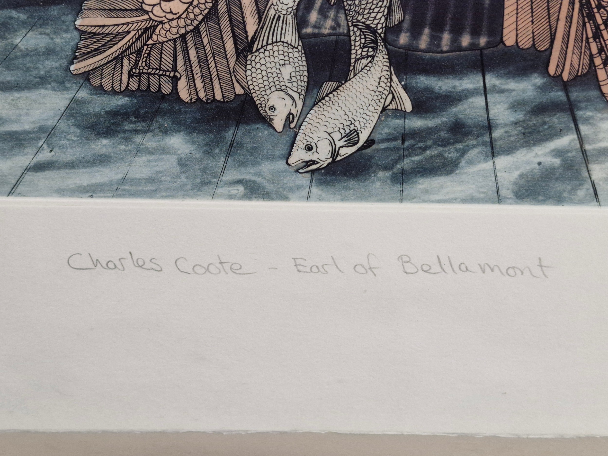Star Lot: 'John Kindness' An original hand signed Artists Proof 'John Kindness' etching on paper titled 'Charles Coote-Earl of Bellamount'. The etching portrays Charles Coote, Earl of Bellomont, rendered in Kindness’s characteristic style, blending historical subject matter with modern, ironic interpretation. Signed and titled in pencil to base. Housed in a black wooden frame behind glass.