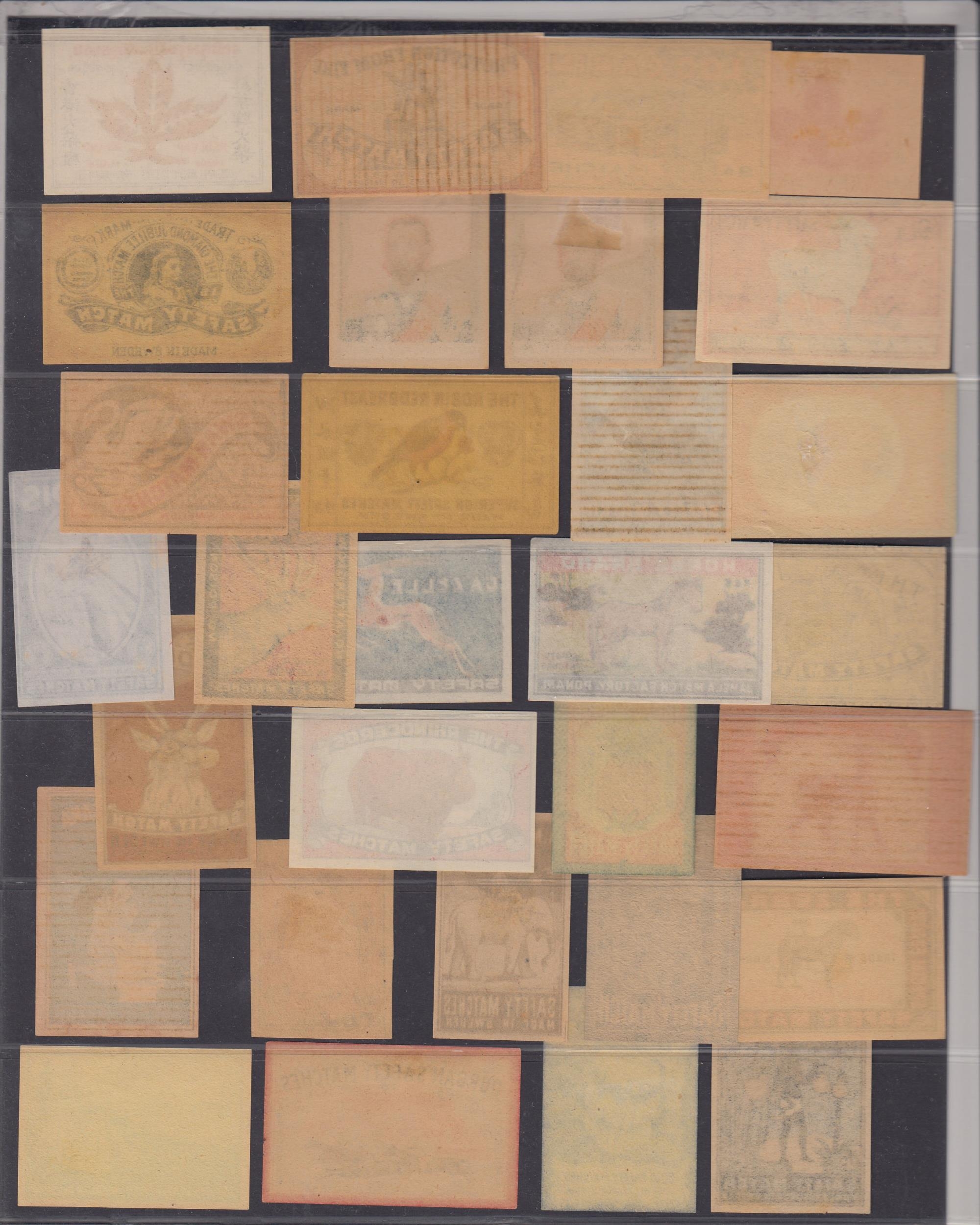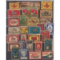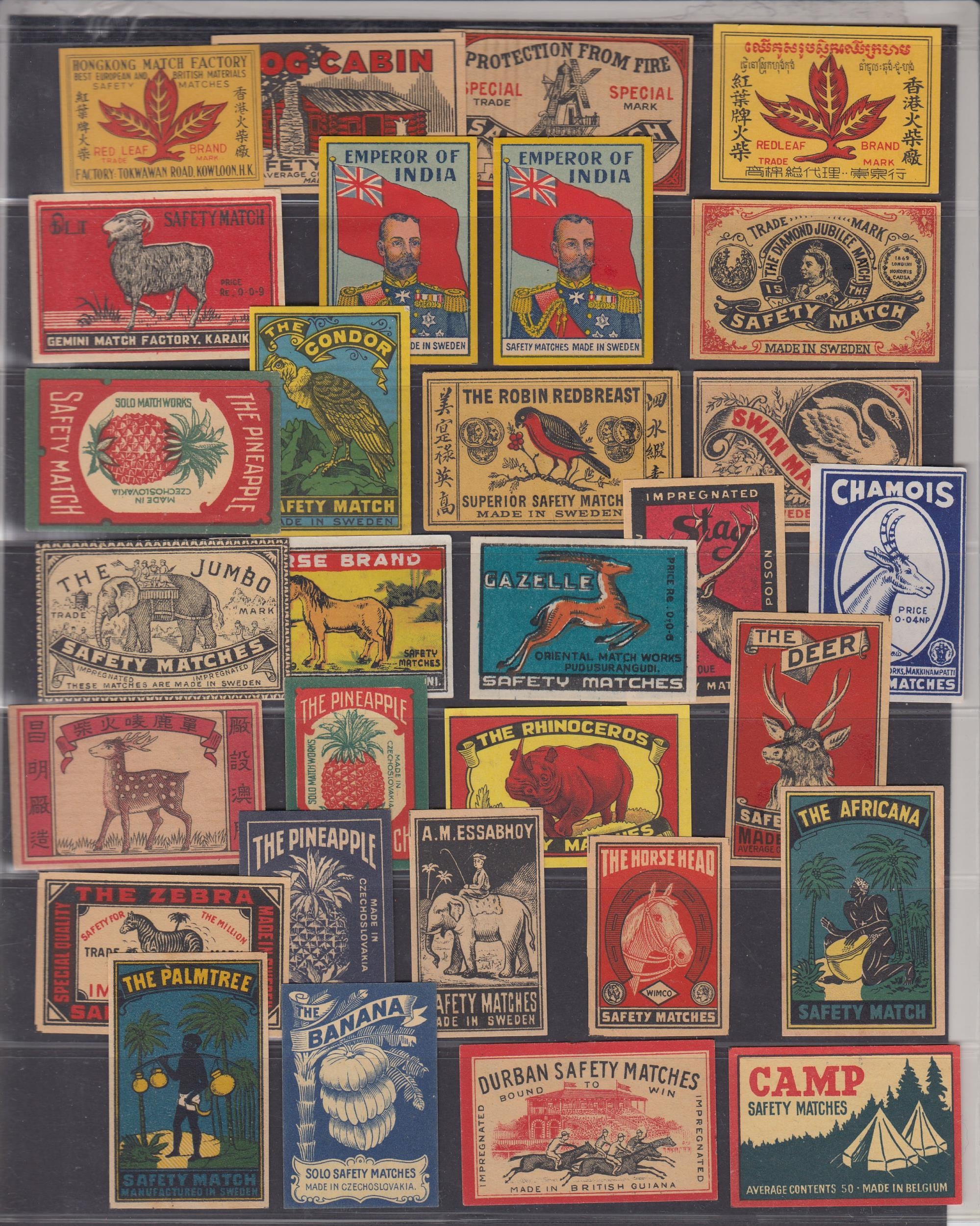 An album page of illustrated matchbox labels, various companies including Redleaf, Wimco and Durban