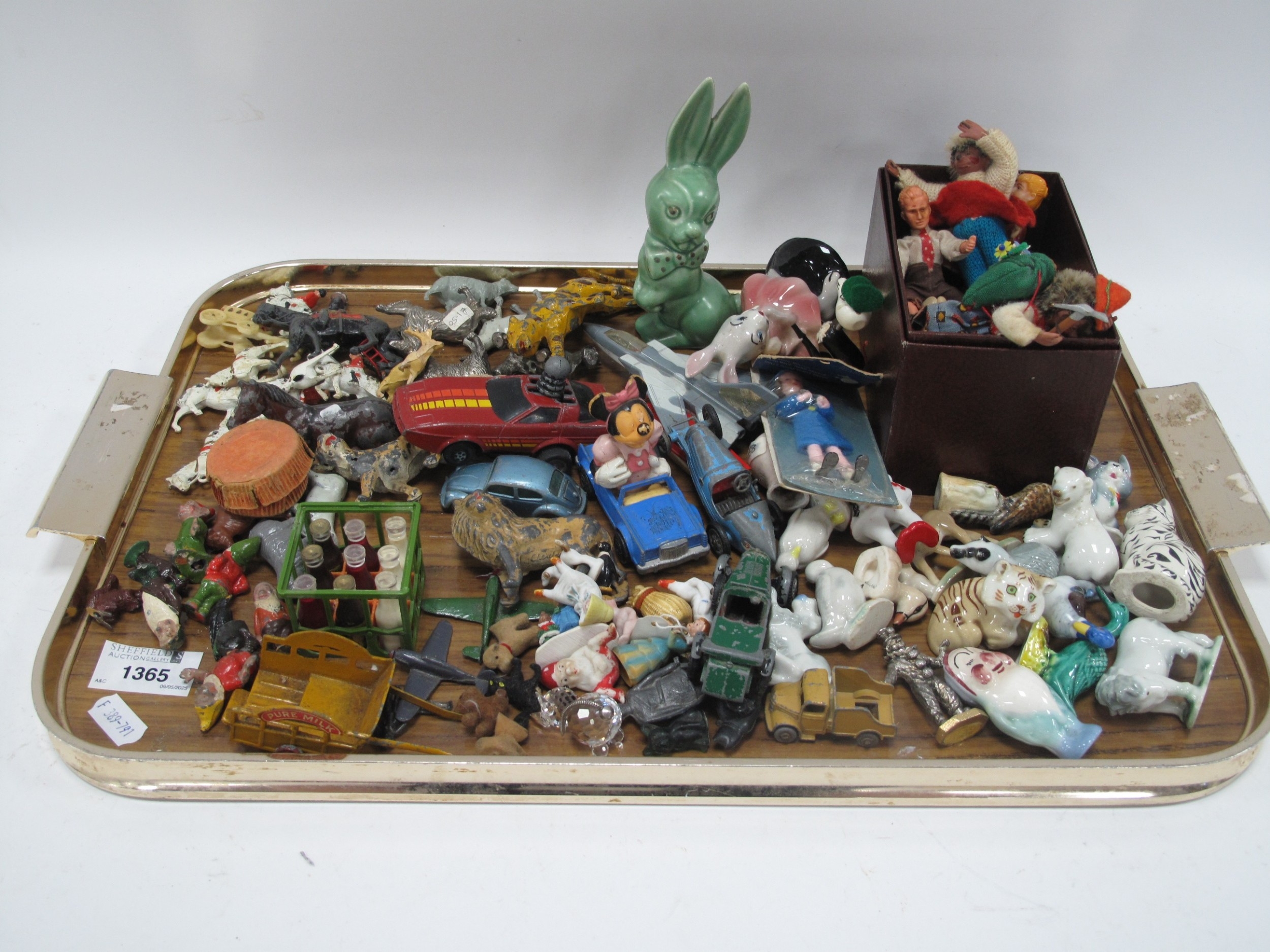 Flyde and Other Metal Animals, Swarovski cat, Matchbox mini mouse in car, Lesney vehicles, Dol-Toi and other figures. Sylvac rabbit, Wade, etc:- One Tray.