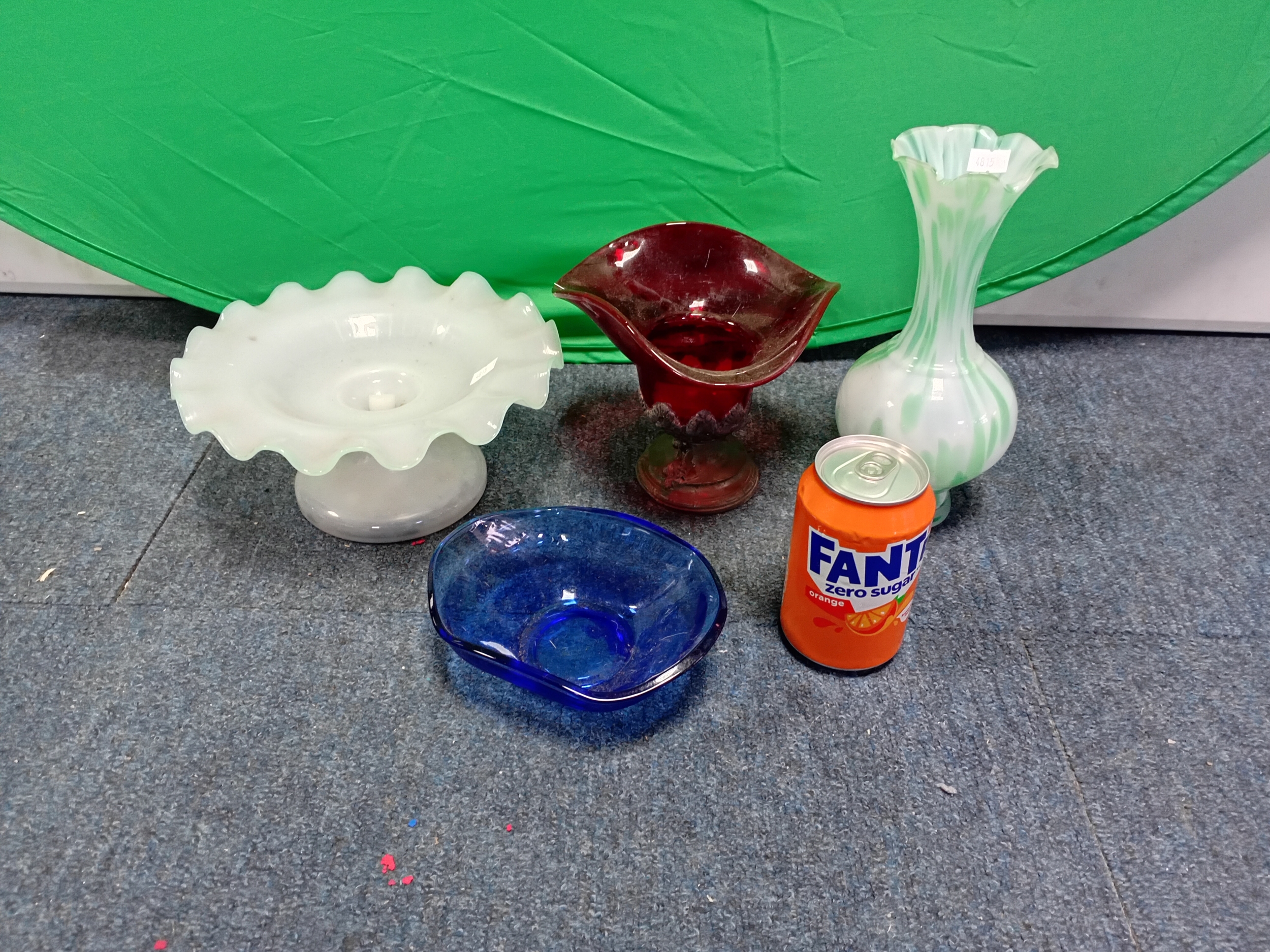 A collection of vintage glassware, to include, a vase and 3 bowls. Some damage as shown in photos.