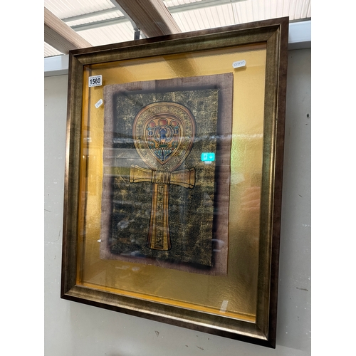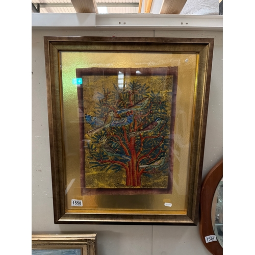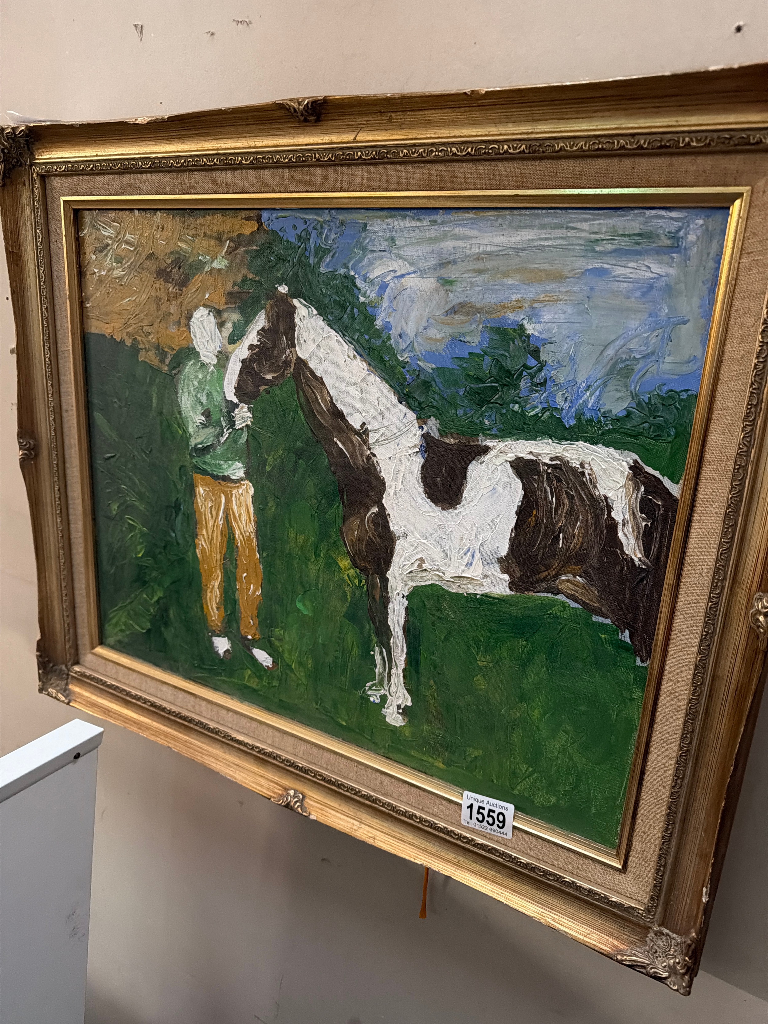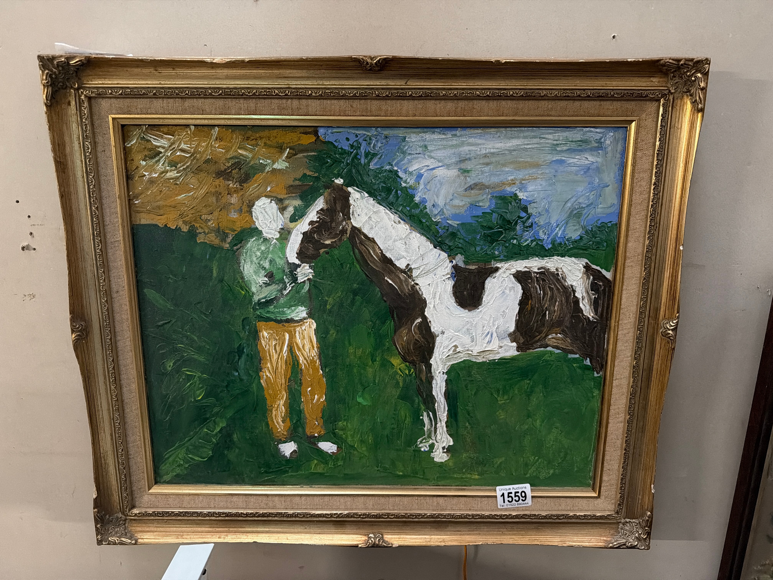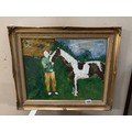A gilt framed painting on canvas of a man & horse in meadow