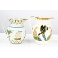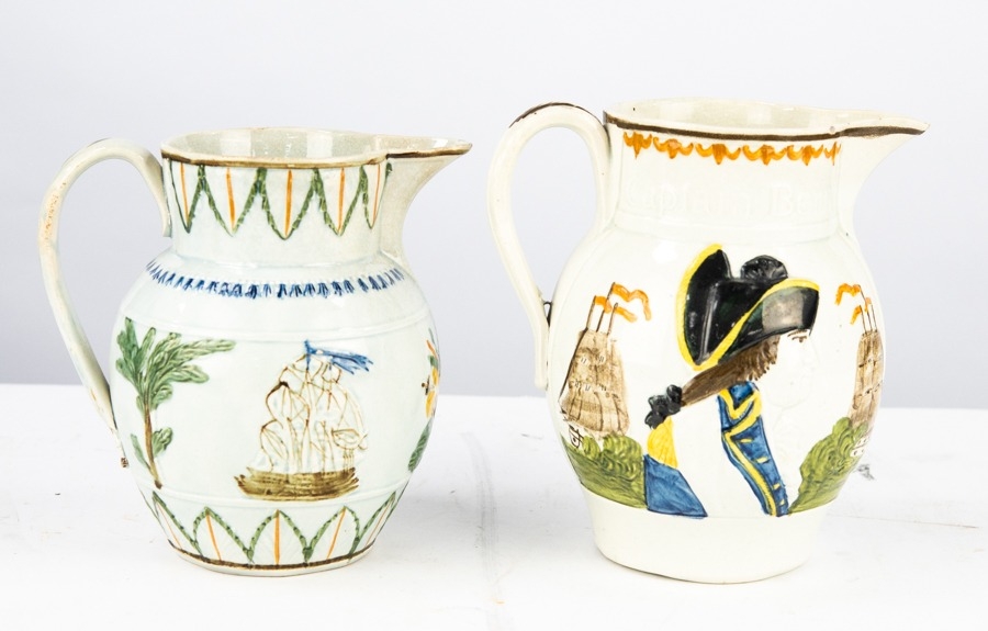 TWO NINETEENTH CENTURY PRATT TYPE MOULDED PEARLWARE POTTERY JUGS TO COMMEMORATE ADMIRAL NELSON, one with portrait and ships portrait, 5 ½” (14cm) high, the other with two portraits, named ADMIRAL NELSON and CAPTAIN BERRY, 6 ¼” (15.8cm) high, both unmarked, (2) C/R- first jug with chips and hairlines to the spout, restored rim chip and related minor losses, the other with minor chips to the spout, small firing crack and minor hairlines from the base, both with heavy crazing and minor chips and losses to the enamels