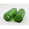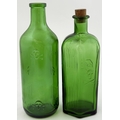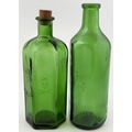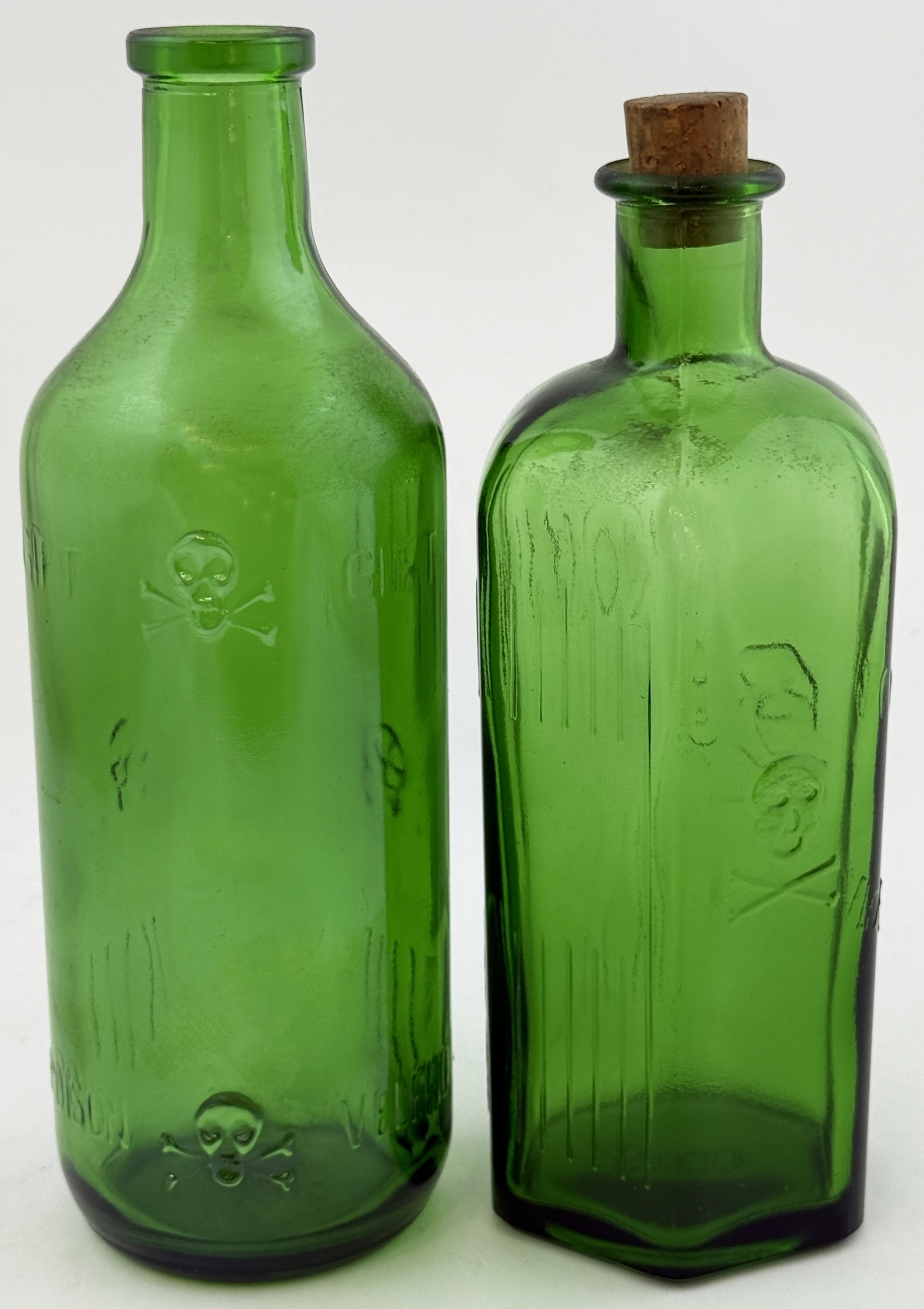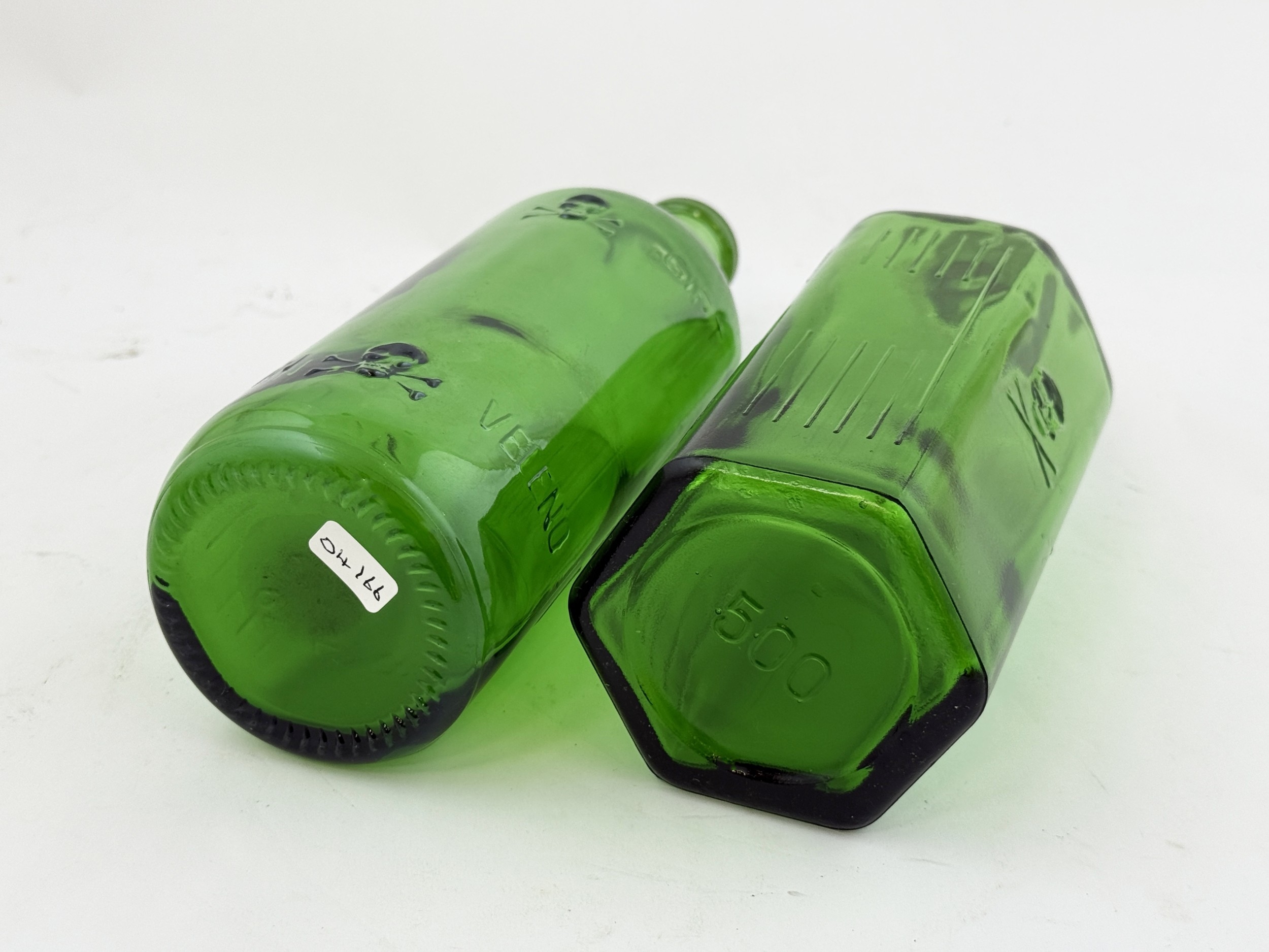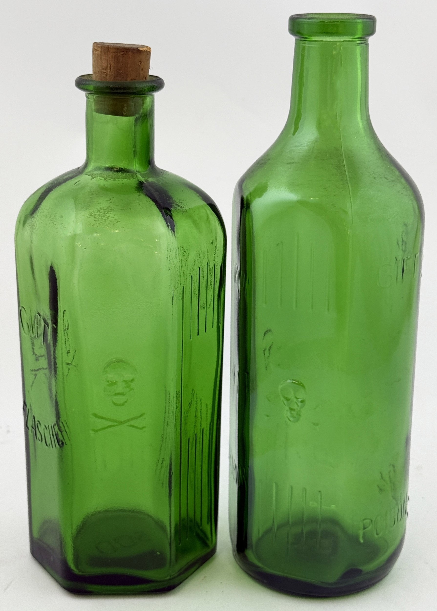 GERMAN SKULL & CROSSBONES GIFT FLASCHE POISON BOTTLE S. Tallest 8.75ins. Two German poisons, one hexagonal one with 3 flat sides & rounded back, both emerald green & incorporating skull & crossbones motif & wording GIFT/ FLASCHE